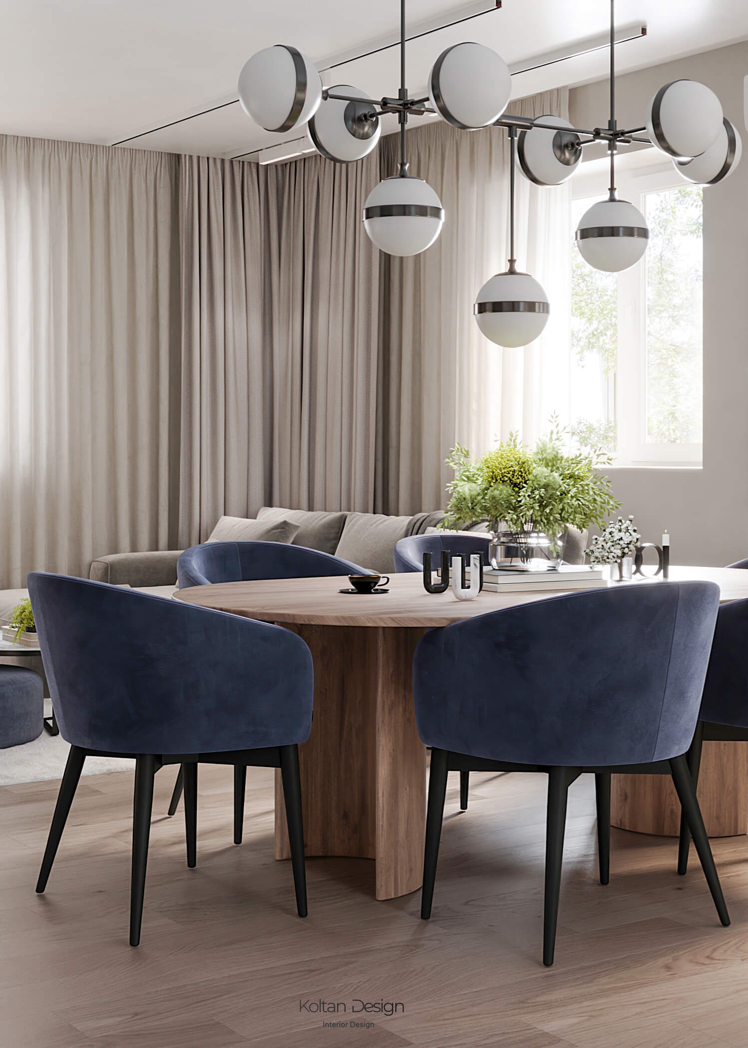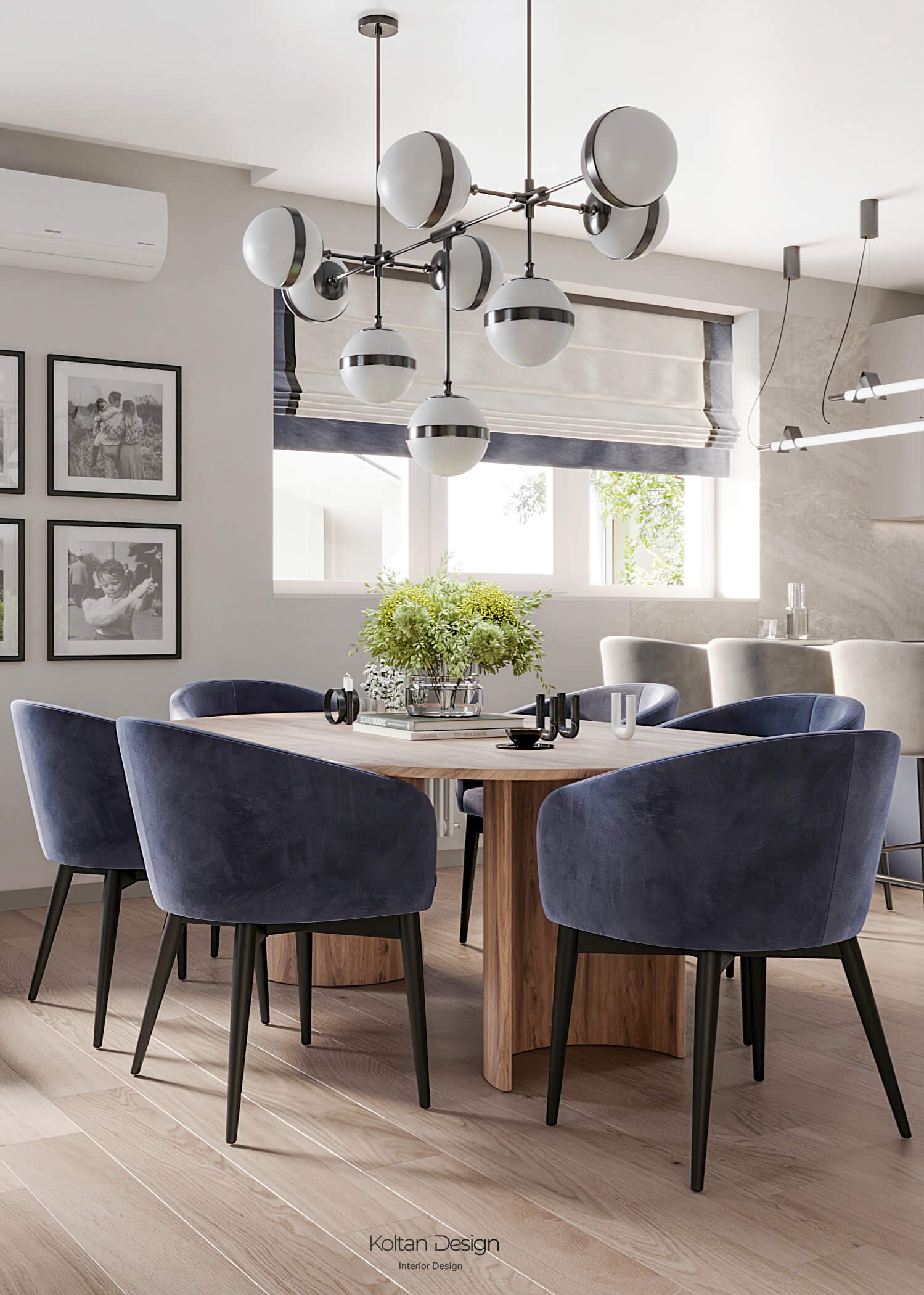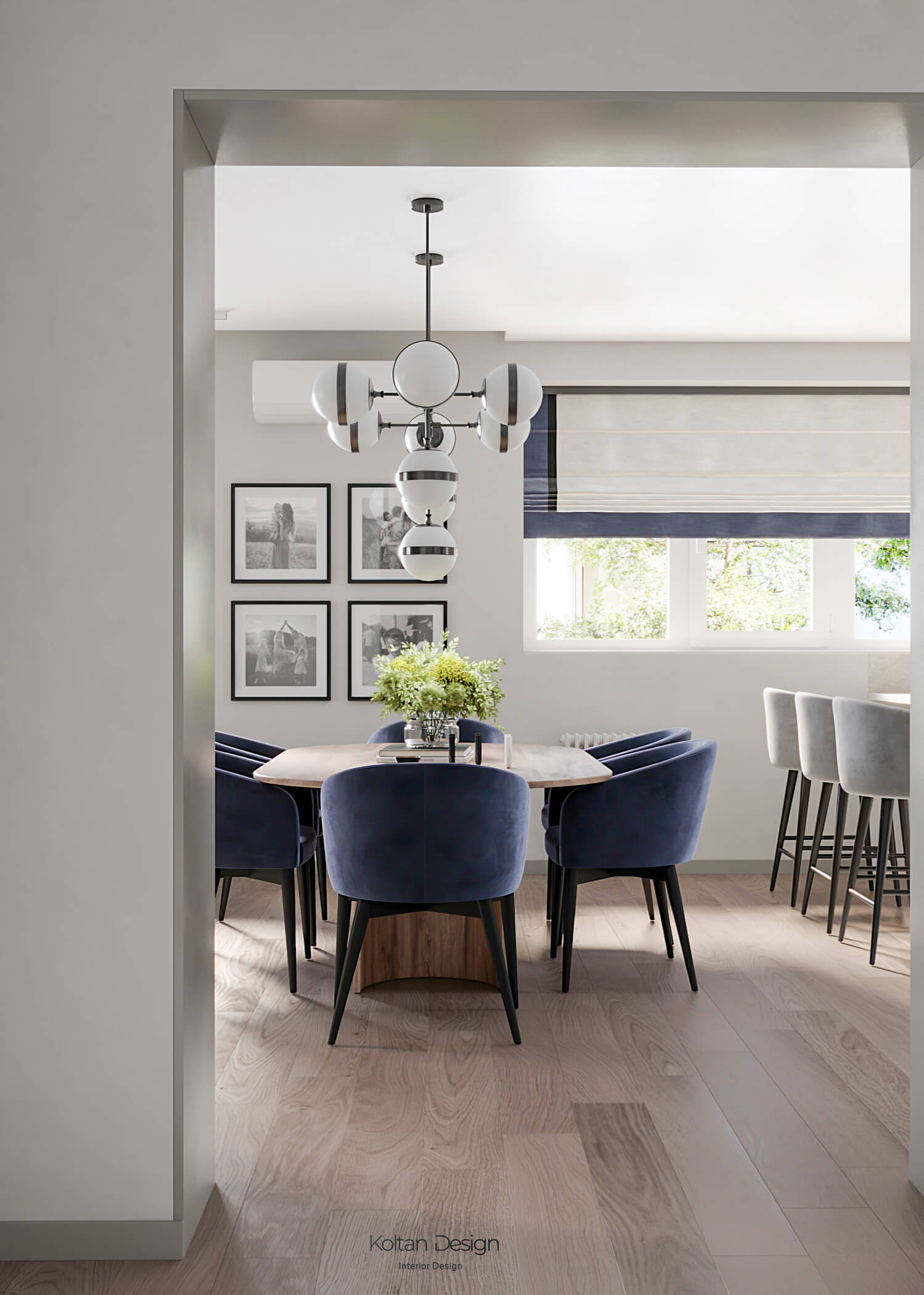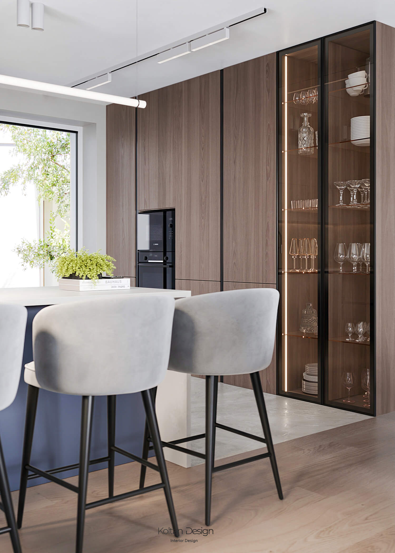 Дом был приобретён уже с готовыми перегородками, однако планировка не соответствовала потребностям семьи. В процессе работы кухня и гостиная были объединены в единое пространство, добавлен кабинет, а на втором этаже из общего объёма сформированы отдельные комнаты с гардеробными и дополнительная детская.Стилистическое решение формировалось в процессе работы: в итоге получился современный интерьер с тёмным деревом и синими акцентами. Основной акцент сделан на фактурах - декоративной штукатурке, текстиле и материалах, без перегруженного декора.