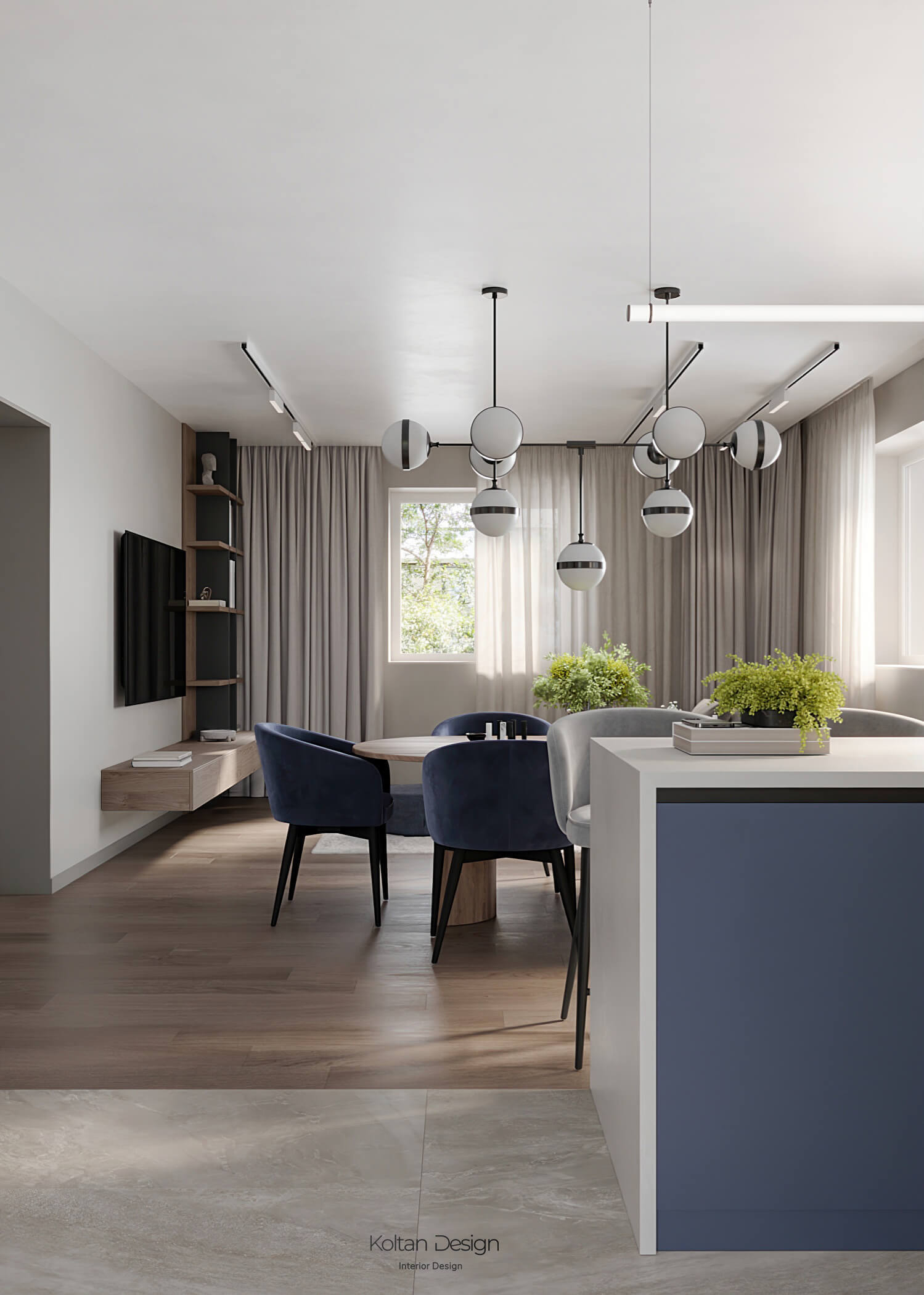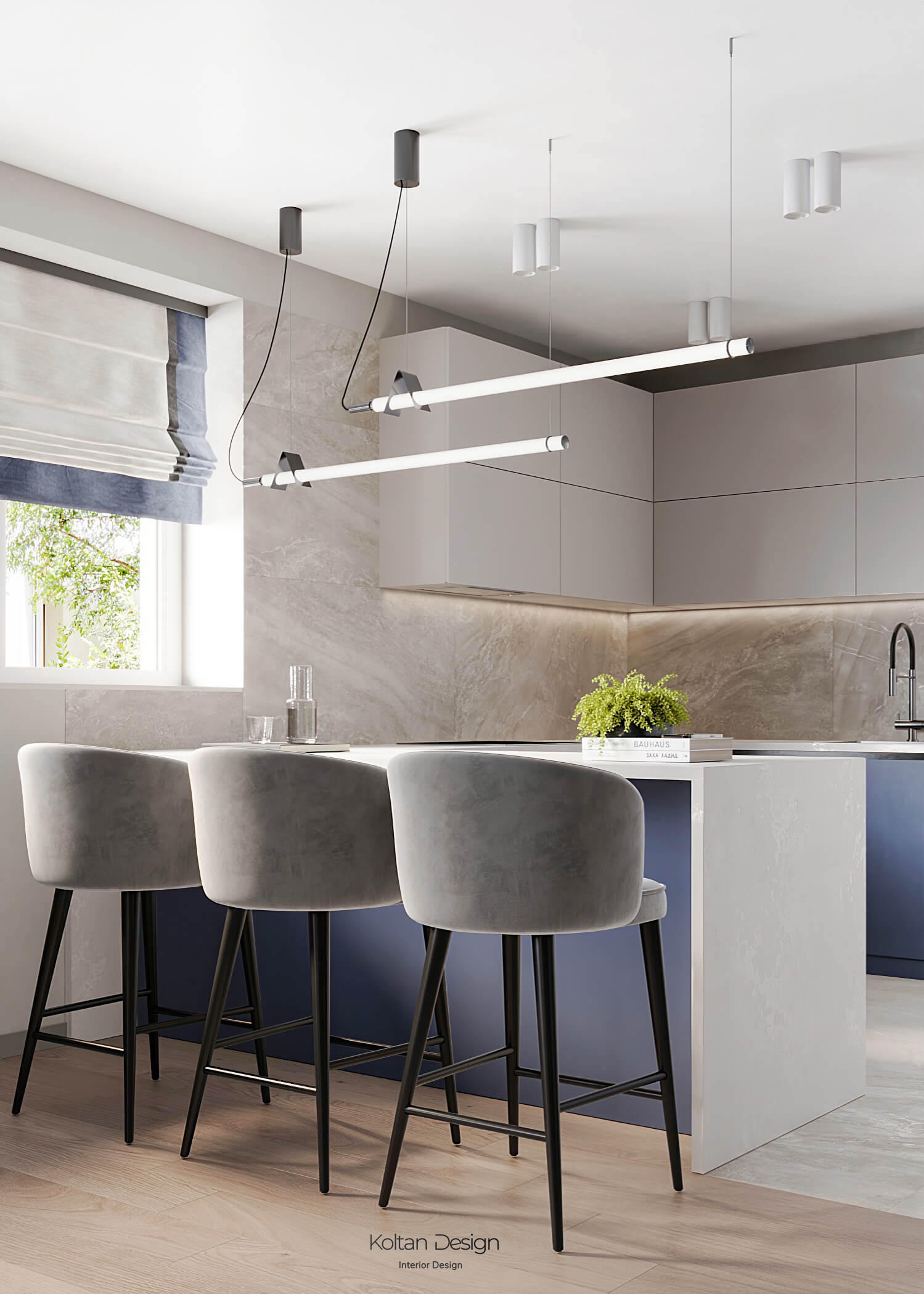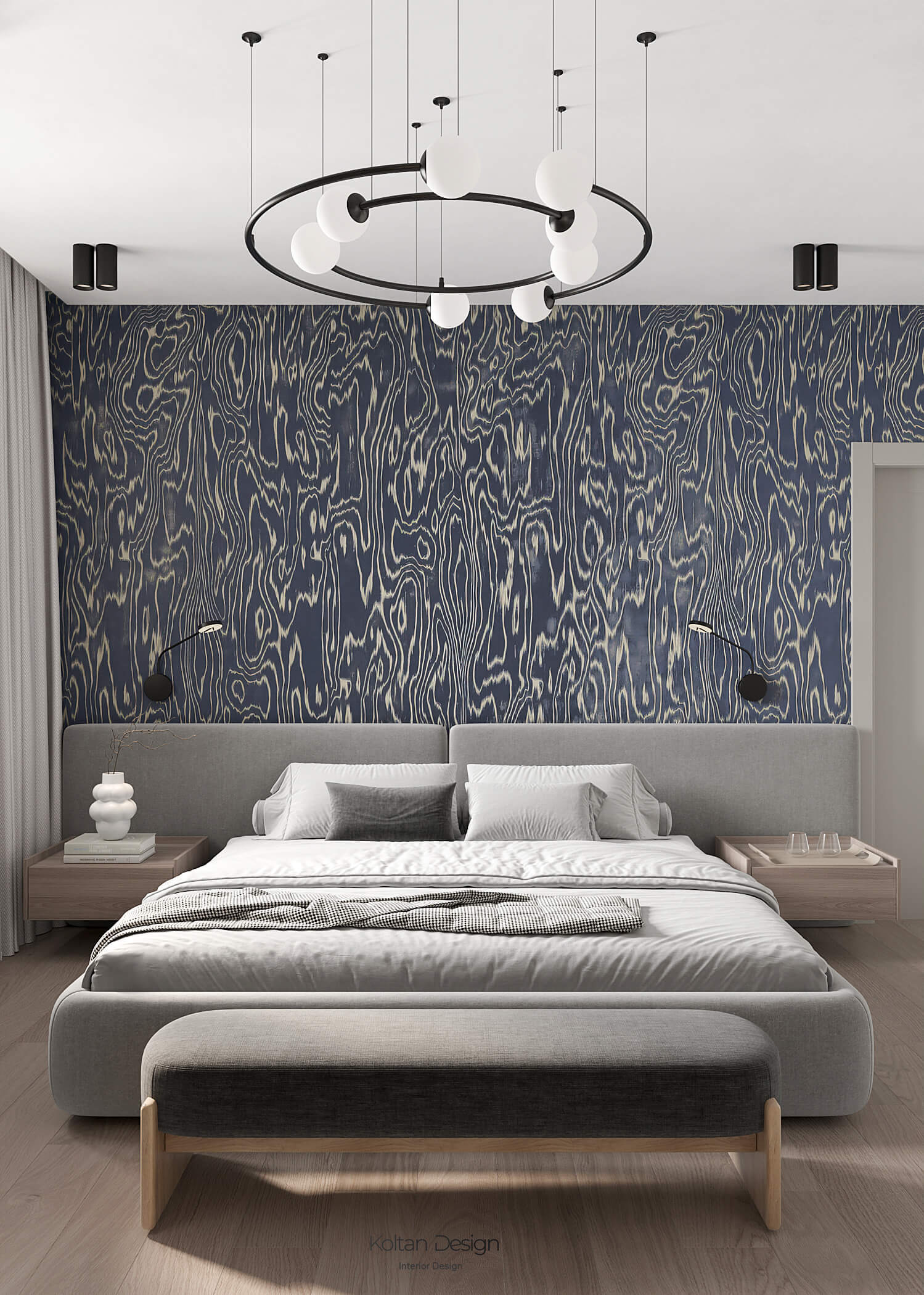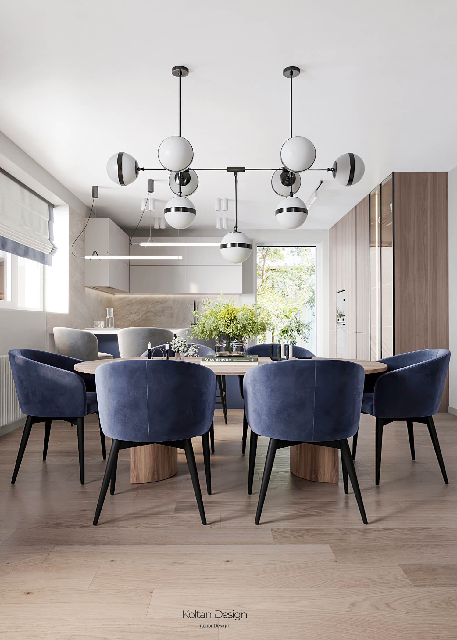 Дом был приобретён уже с готовыми перегородками, однако планировка не соответствовала потребностям семьи. В процессе работы кухня и гостиная были объединены в единое пространство, добавлен кабинет, а на втором этаже из общего объёма сформированы отдельные комнаты с гардеробными и дополнительная детская.Стилистическое решение формировалось в процессе работы: в итоге получился современный интерьер с тёмным деревом и синими акцентами. Основной акцент сделан на фактурах - декоративной штукатурке, текстиле и материалах, без перегруженного декора.