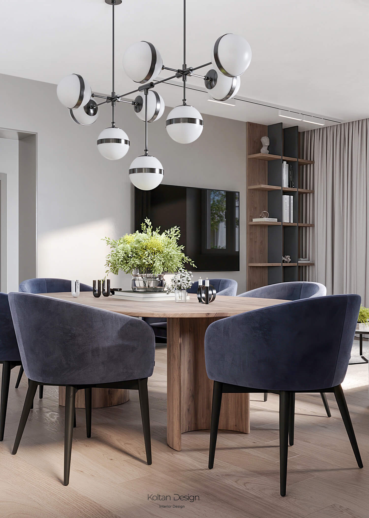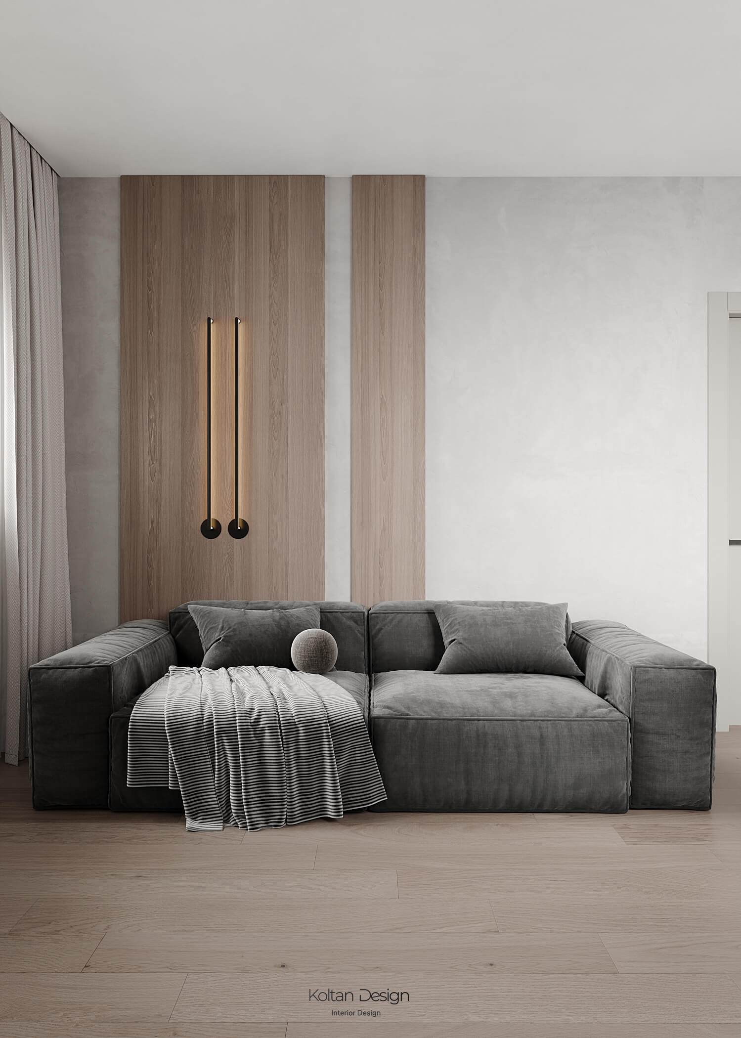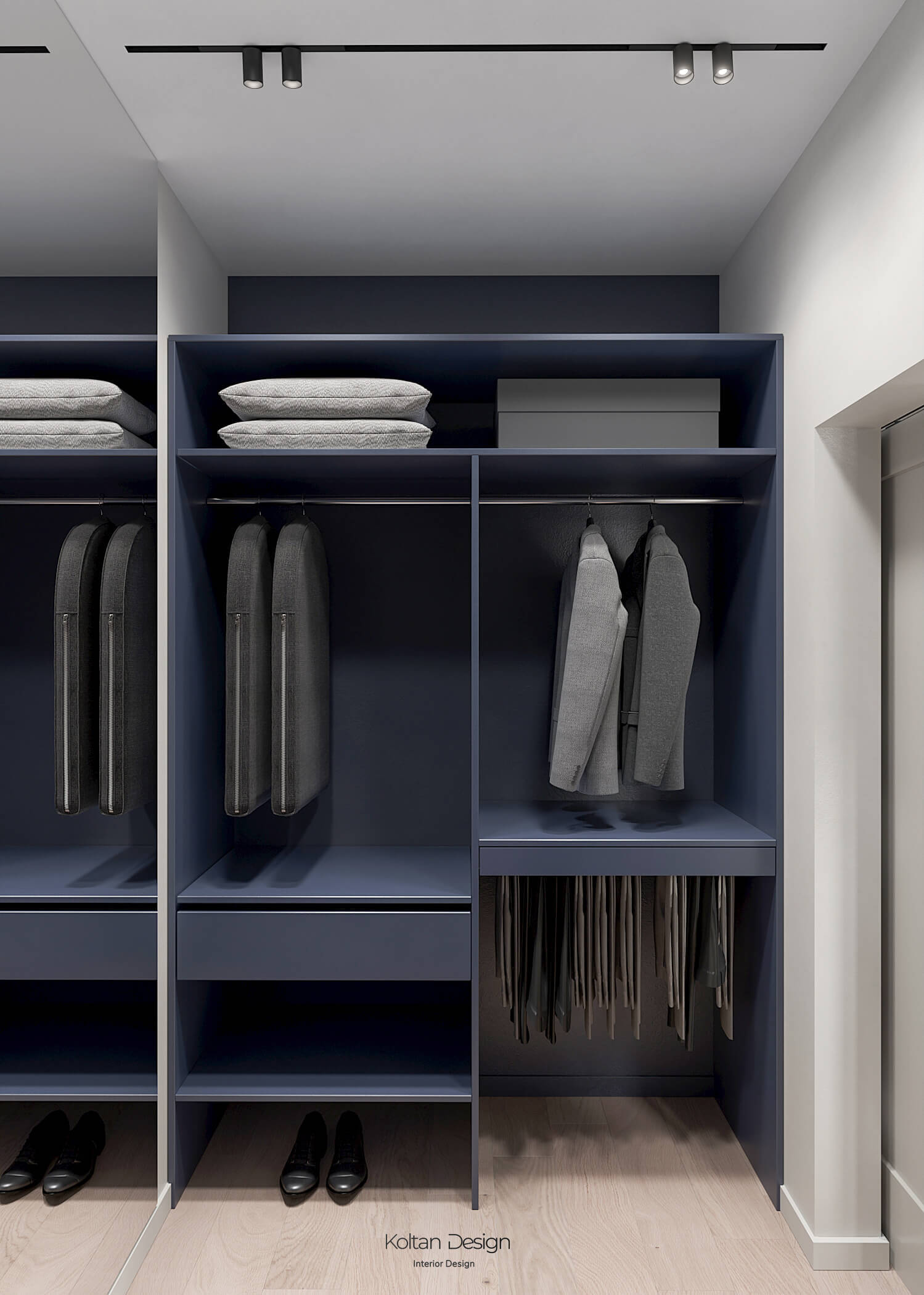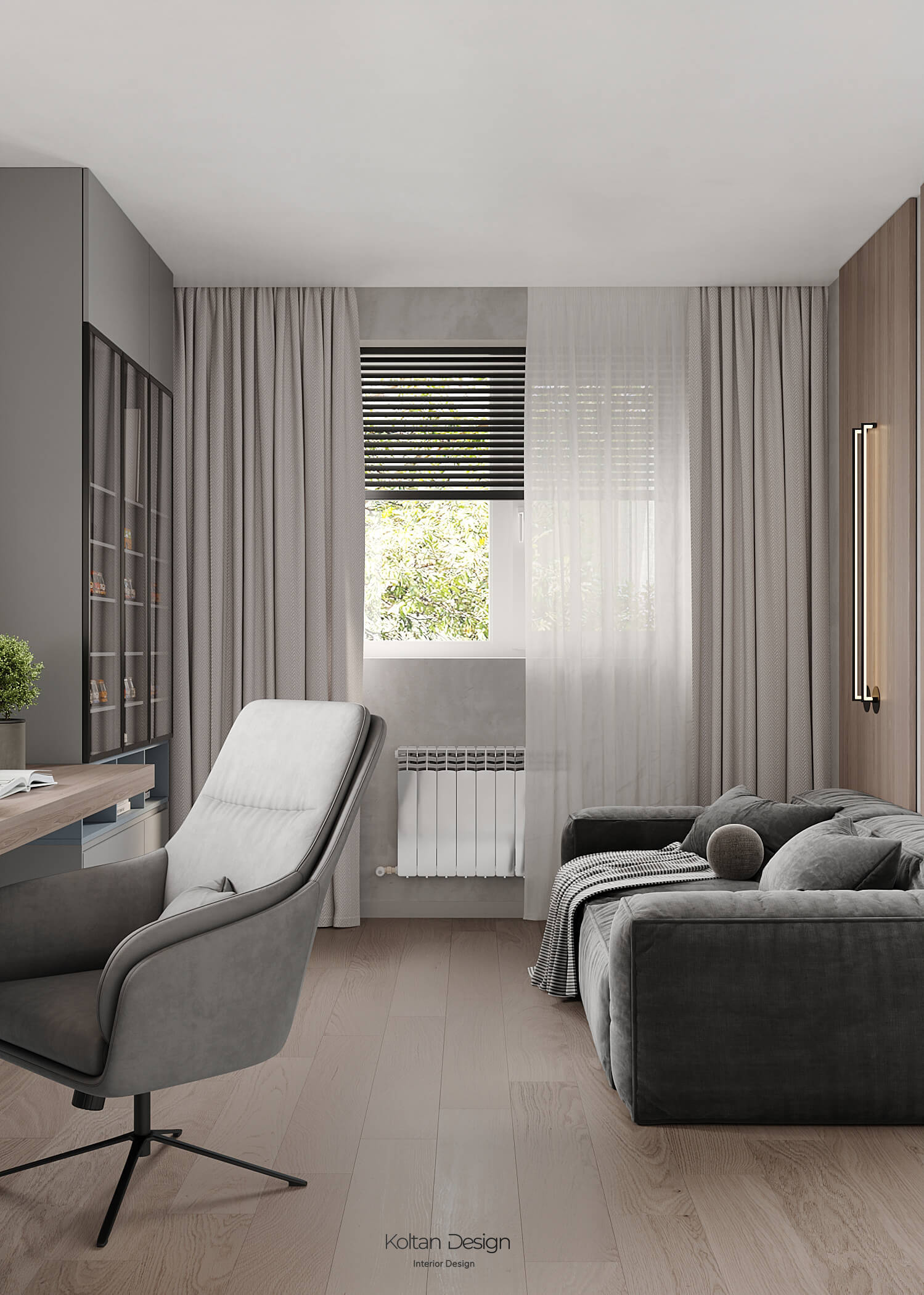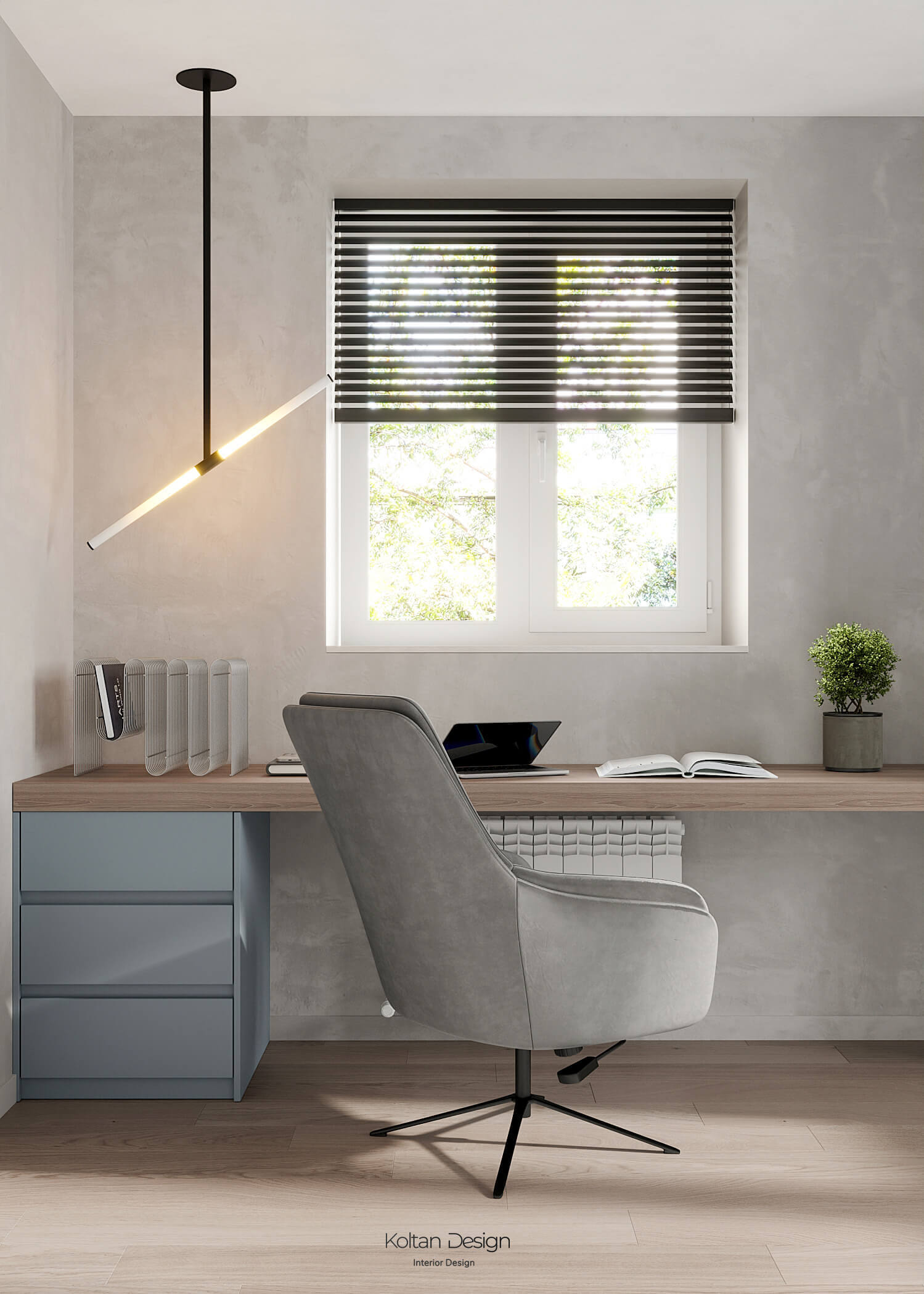 Дом был приобретён уже с готовыми перегородками, однако планировка не соответствовала потребностям семьи. В процессе работы кухня и гостиная были объединены в единое пространство, добавлен кабинет, а на втором этаже из общего объёма сформированы отдельные комнаты с гардеробными и дополнительная детская.Стилистическое решение формировалось в процессе работы: в итоге получился современный интерьер с тёмным деревом и синими акцентами. Основной акцент сделан на фактурах - декоративной штукатурке, текстиле и материалах, без перегруженного декора.