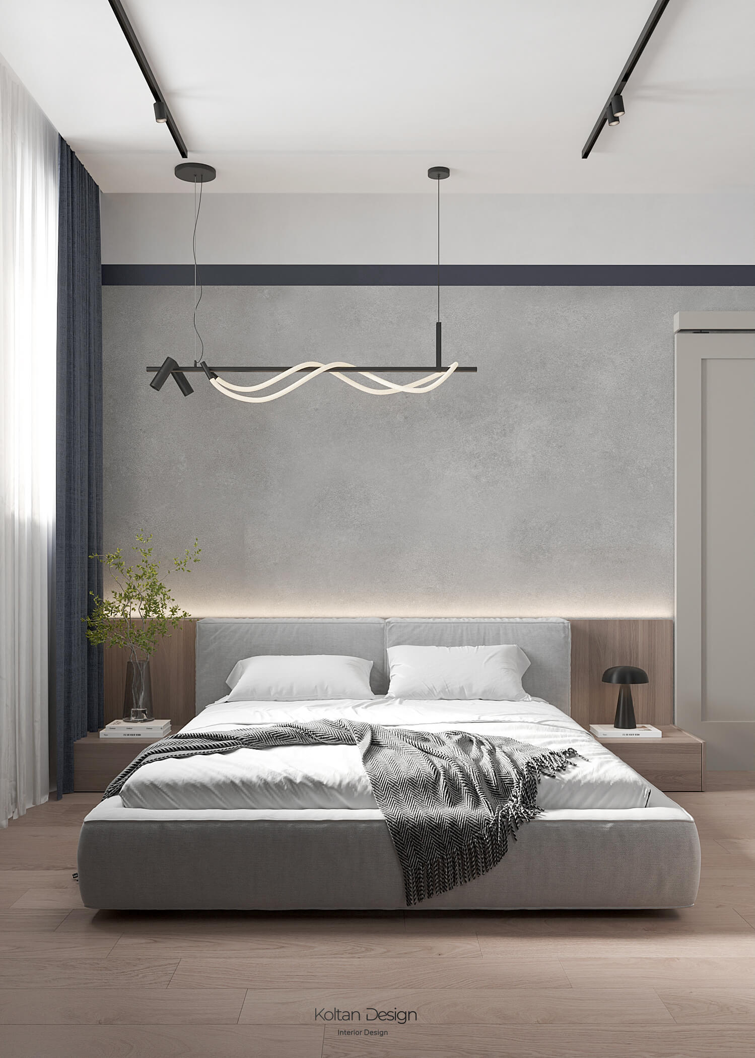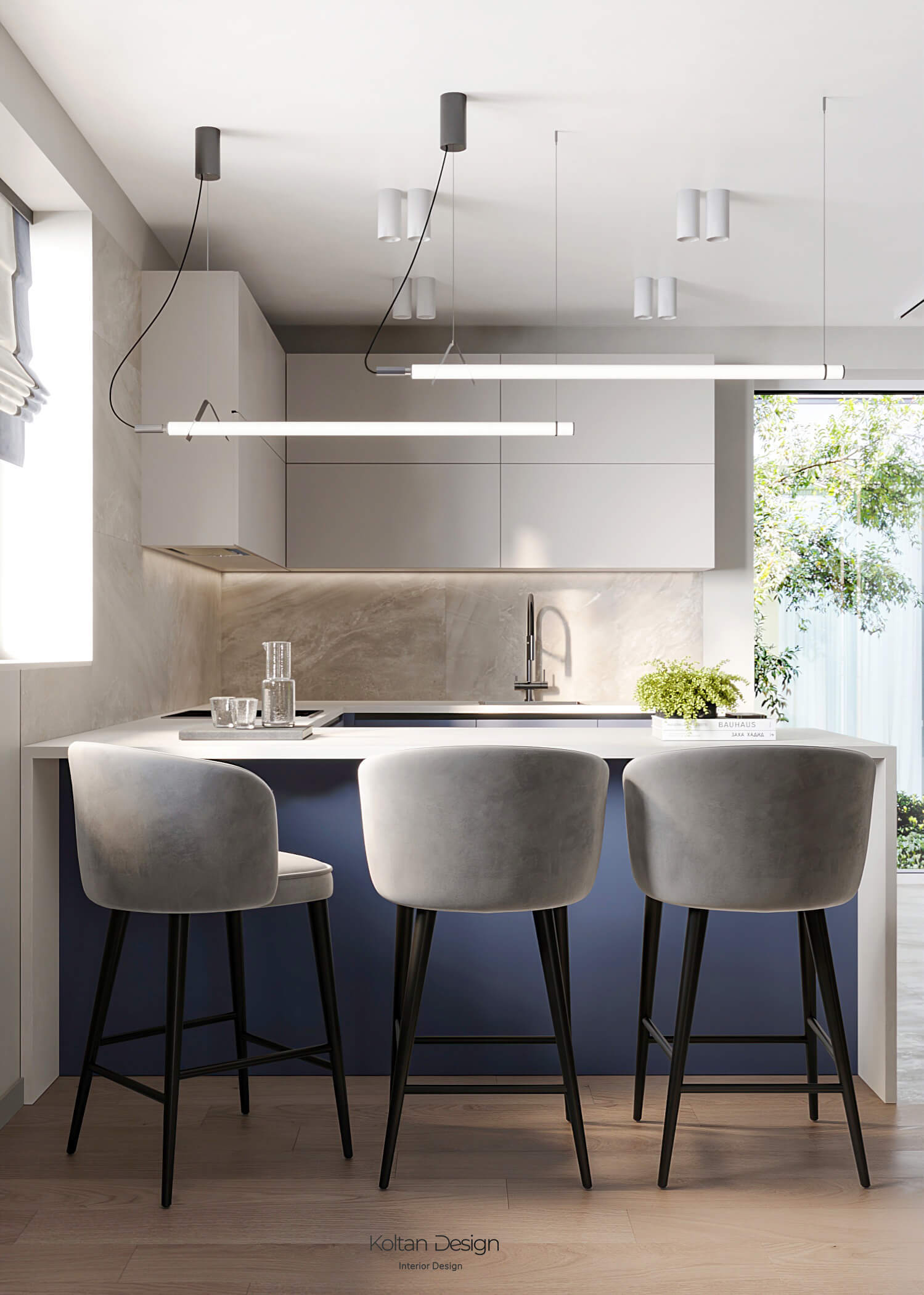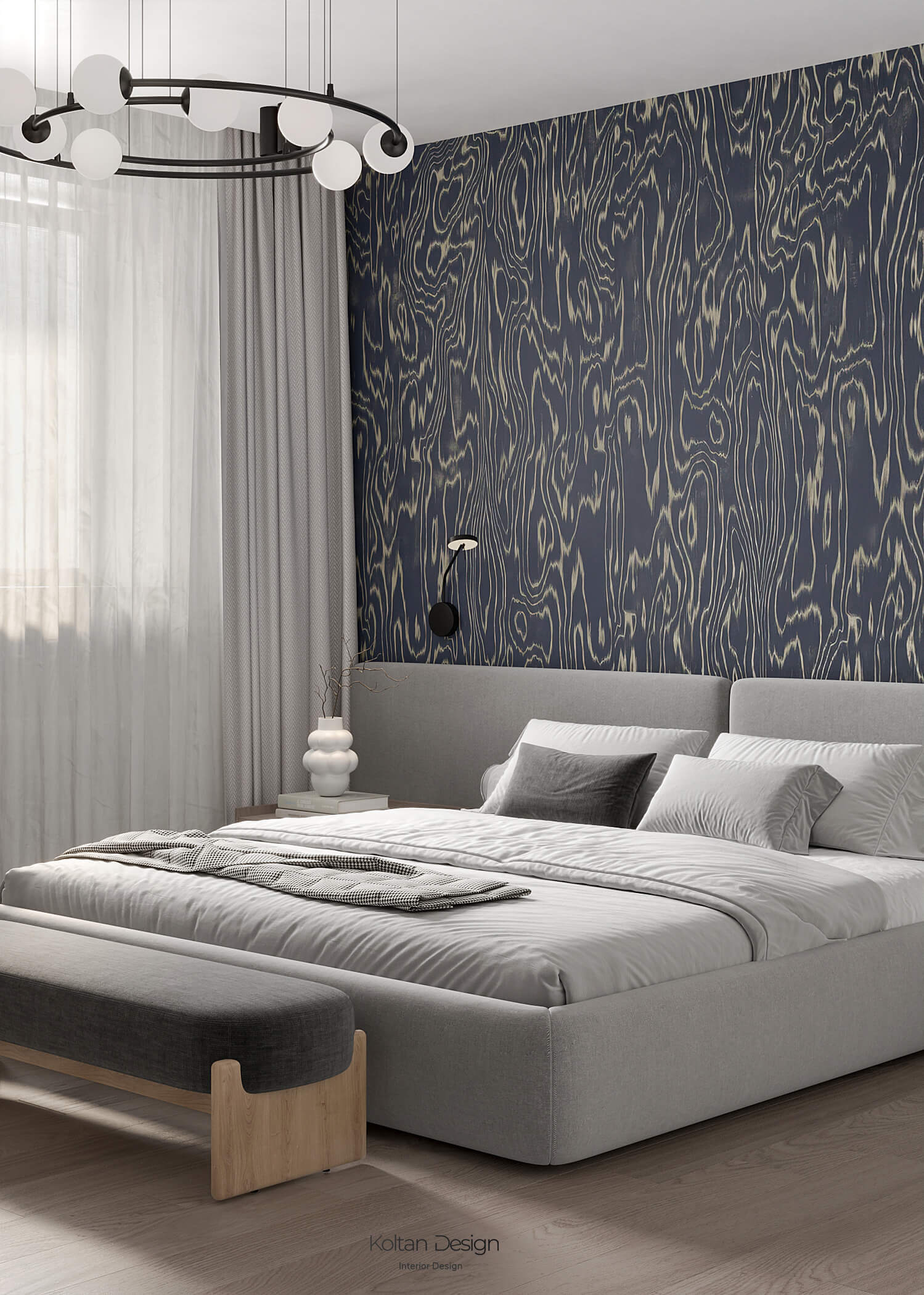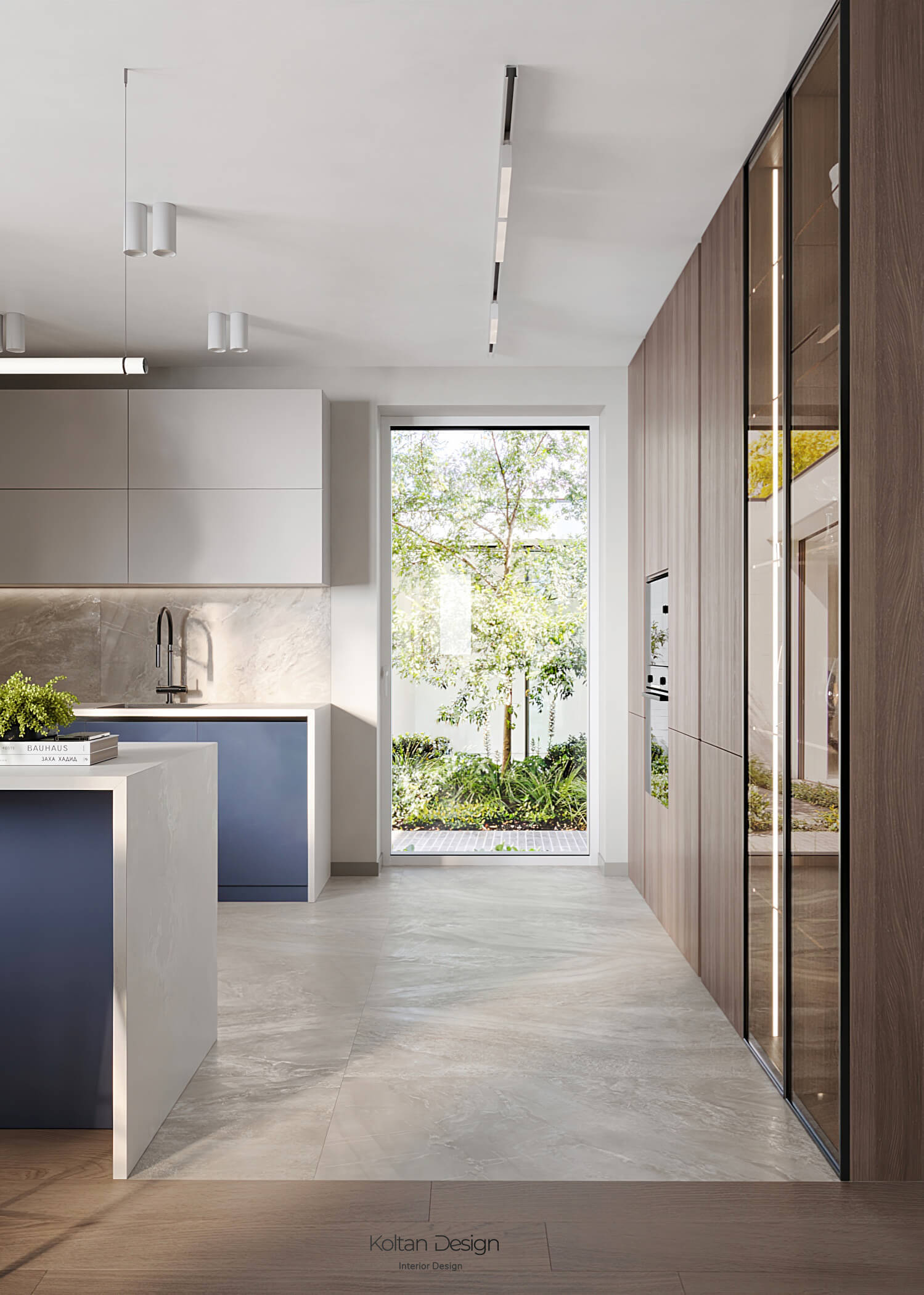 Дом был приобретён уже с готовыми перегородками, однако планировка не соответствовала потребностям семьи. В процессе работы кухня и гостиная были объединены в единое пространство, добавлен кабинет, а на втором этаже из общего объёма сформированы отдельные комнаты с гардеробными и дополнительная детская.Стилистическое решение формировалось в процессе работы: в итоге получился современный интерьер с тёмным деревом и синими акцентами. Основной акцент сделан на фактурах - декоративной штукатурке, текстиле и материалах, без перегруженного декора.