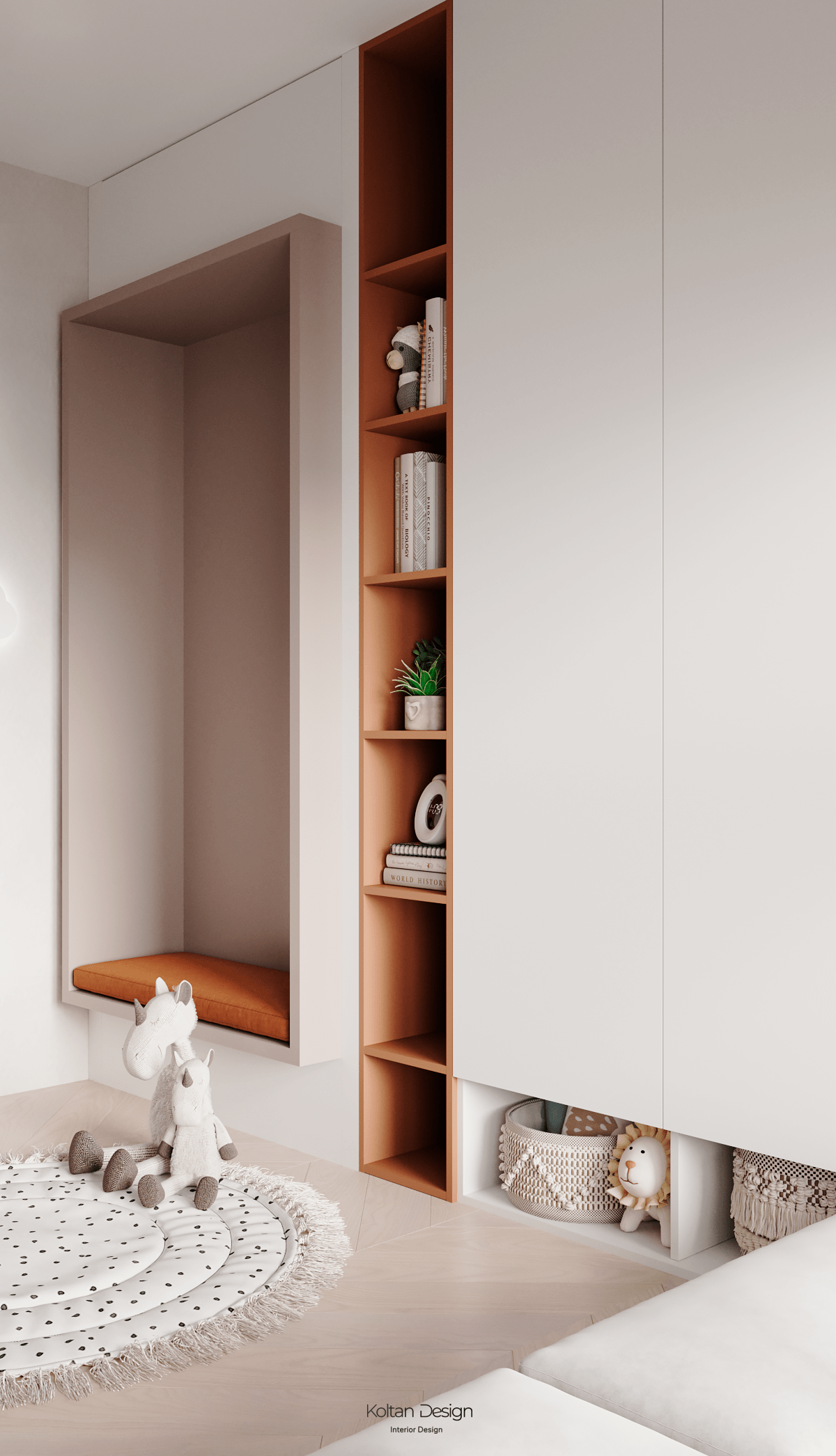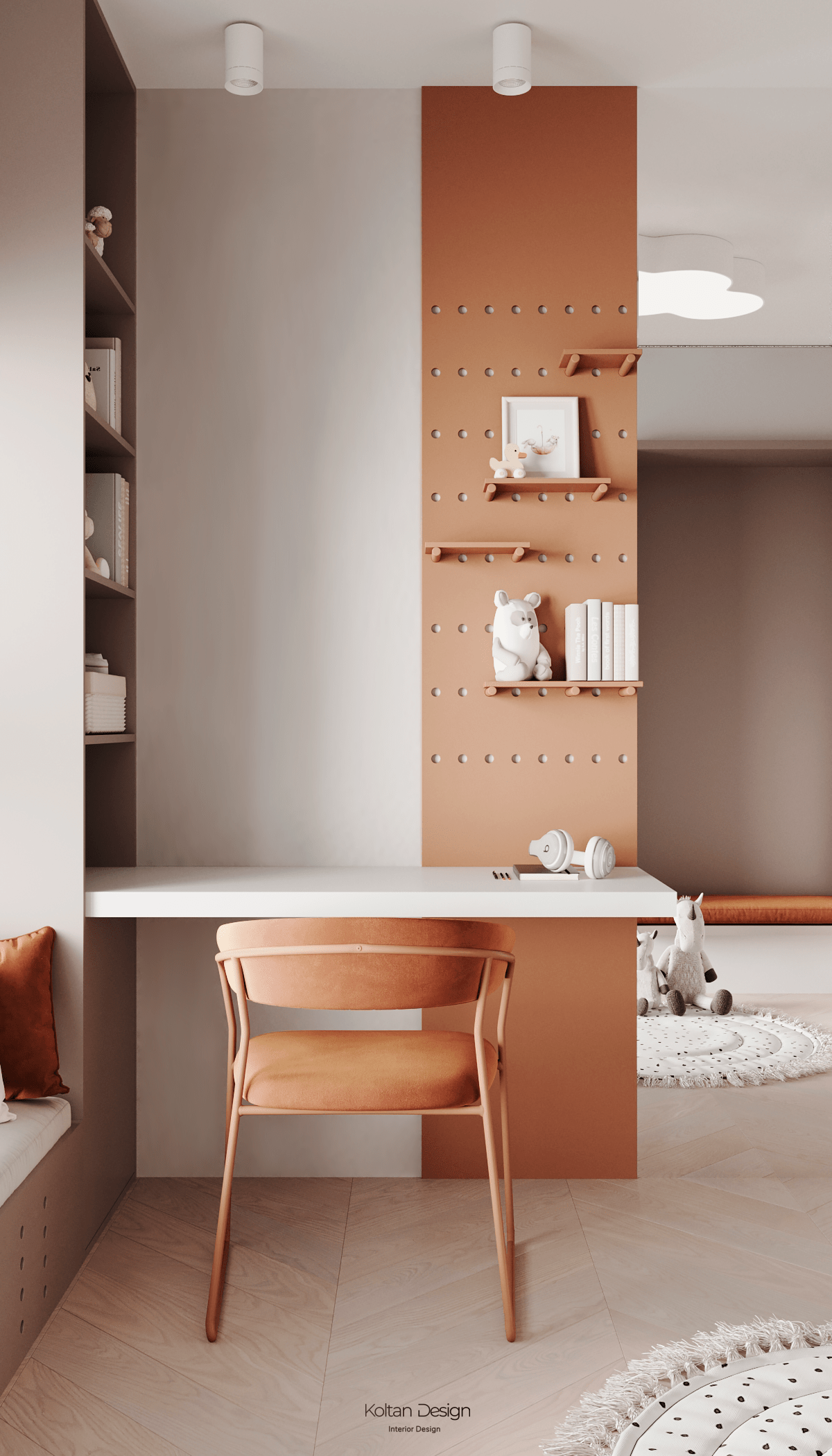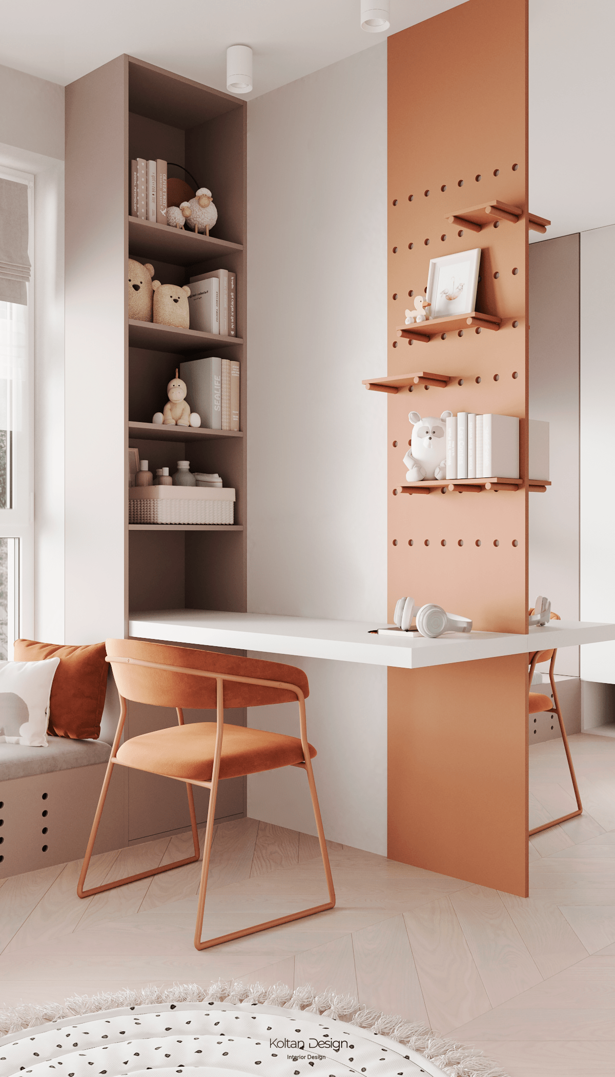 Детская комната выполнена в универсальных оттенках, что делает её подходящей для мальчика и для девочки. Пространство получилось тёплым и уютным благодаря правильно подобранной цветовой гамме, мебели и текстурам, которые создают атмосферу уюта и покоя, идеально подходящую для отдыха и игр.
