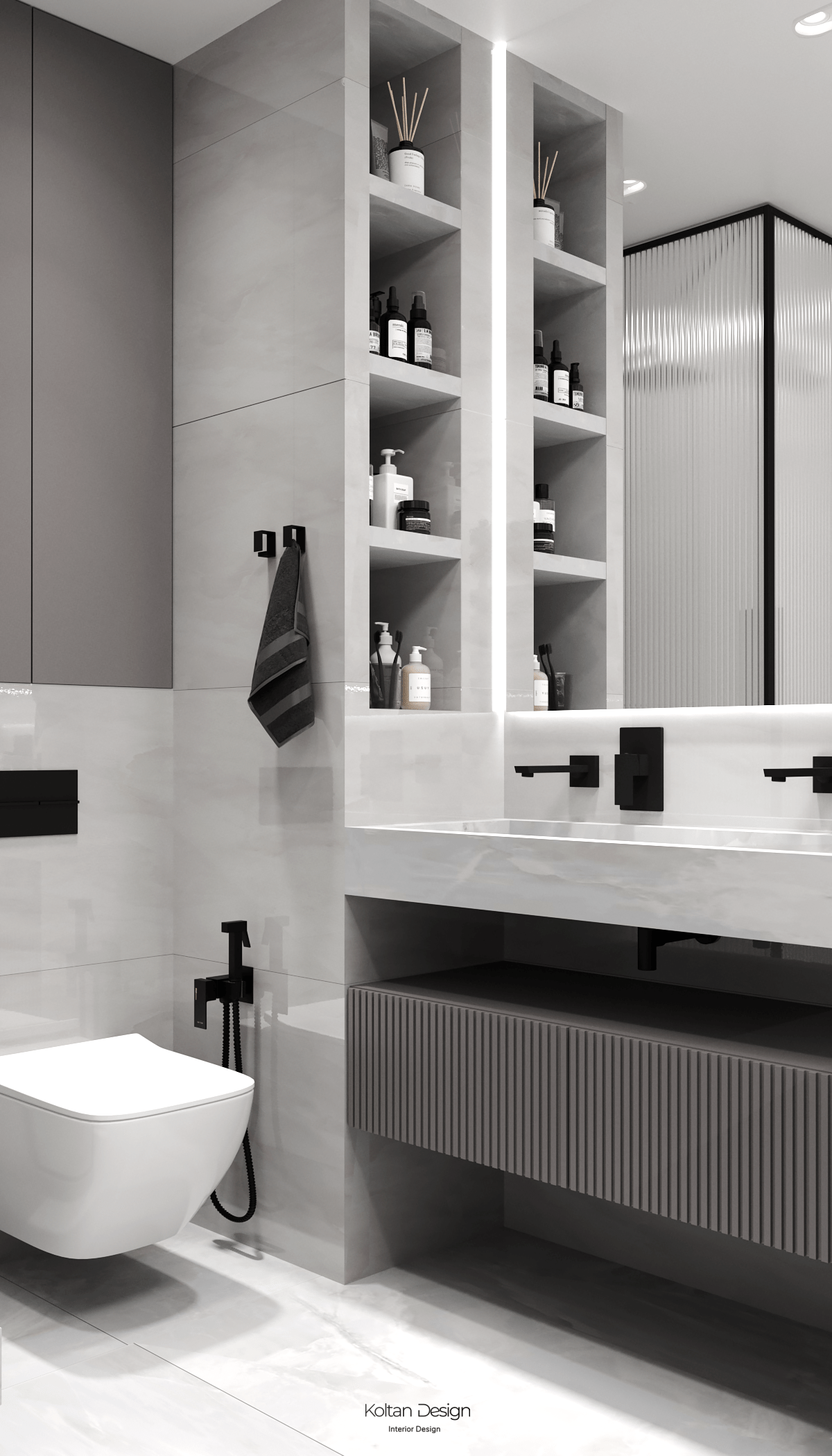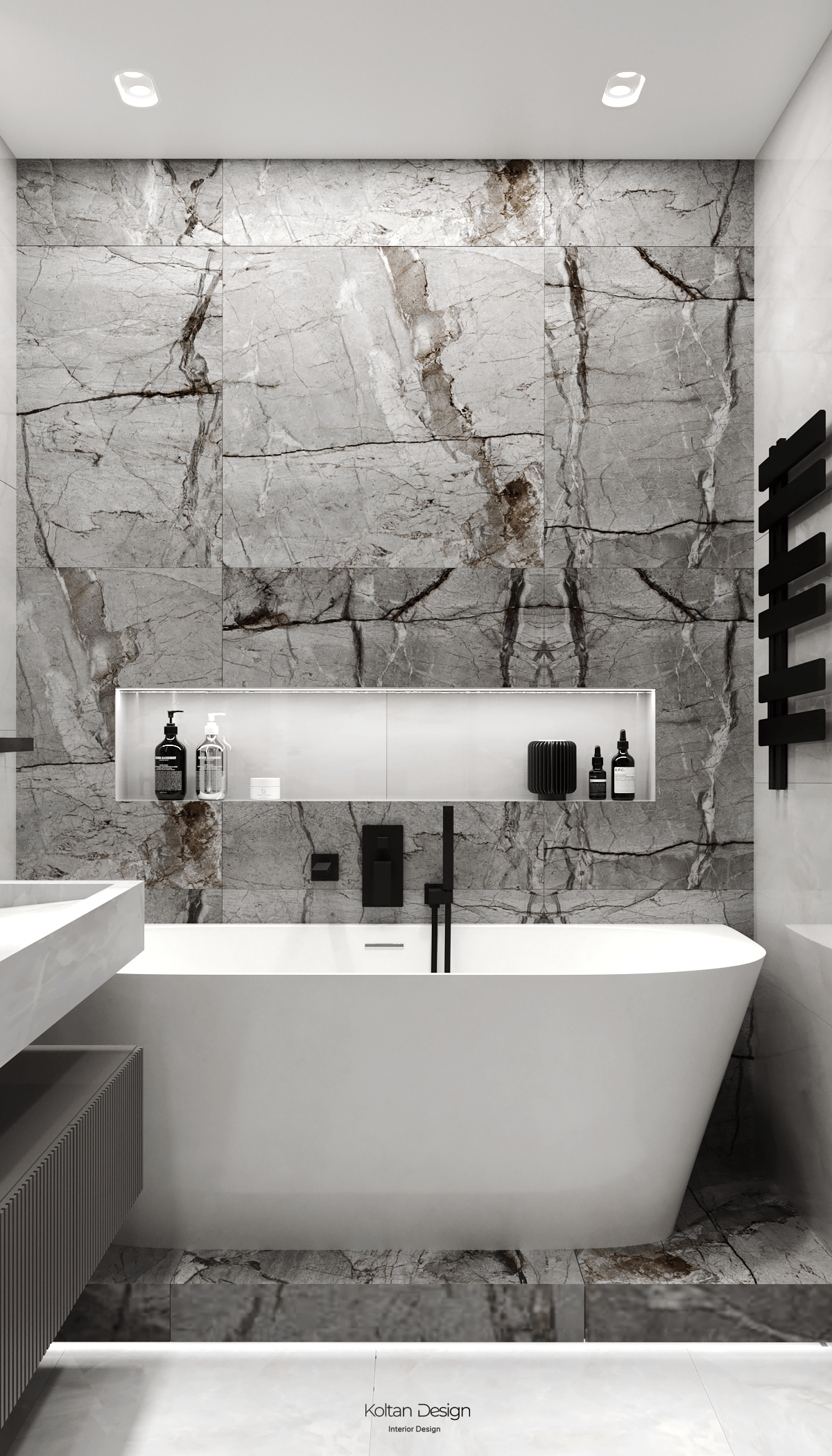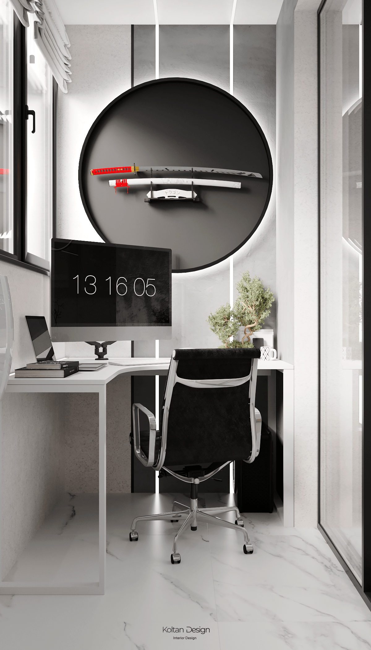 Кухня совмещена с гостиной и имеет выход на утепленный балкон, где для хозяина квартиры оборудовано рабочее место. Спальня и детская комната находятся в дальней части квартиры, между ними расположена ванная комната с отдельностоящей ванной и душевой кабиной.