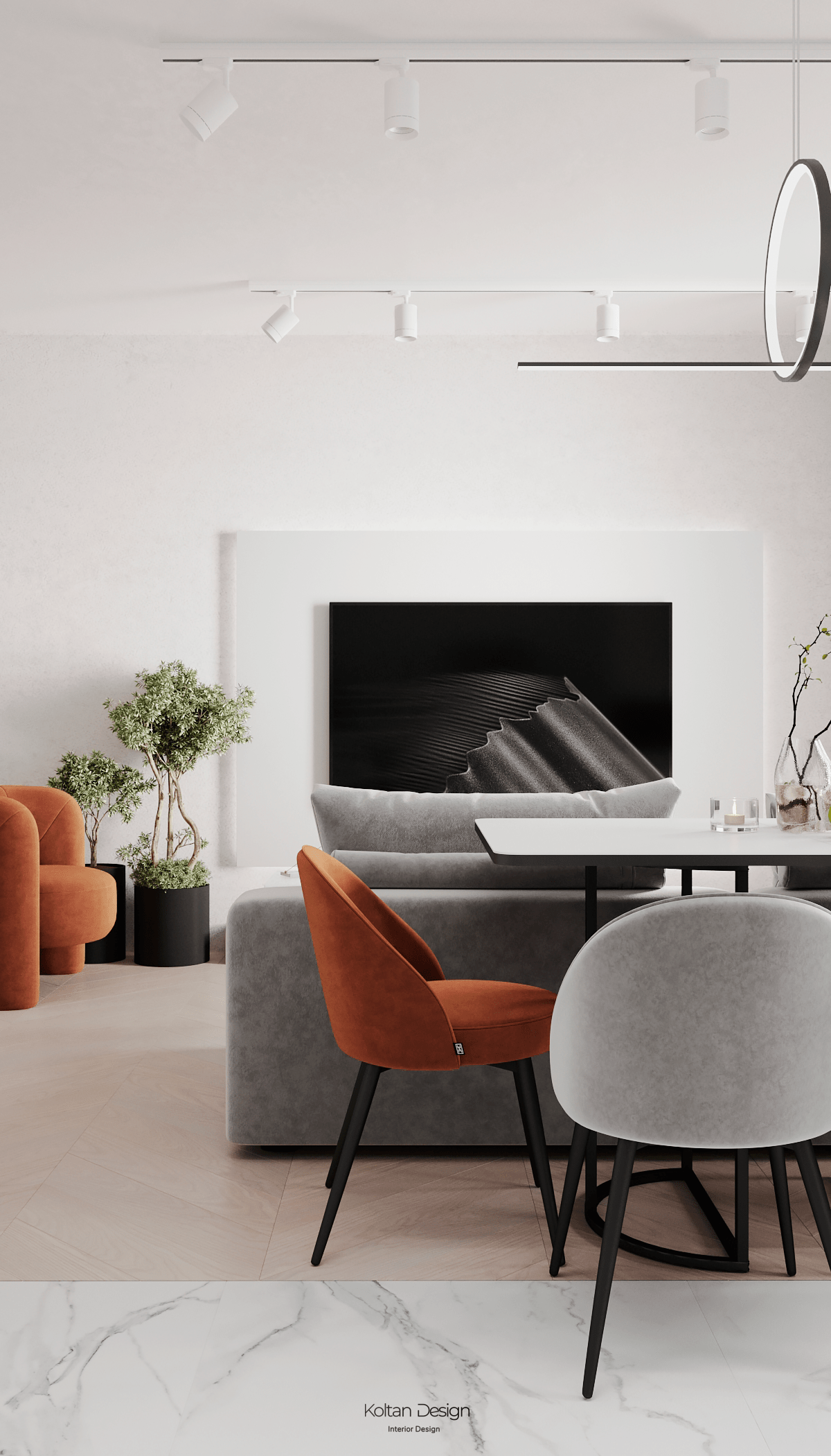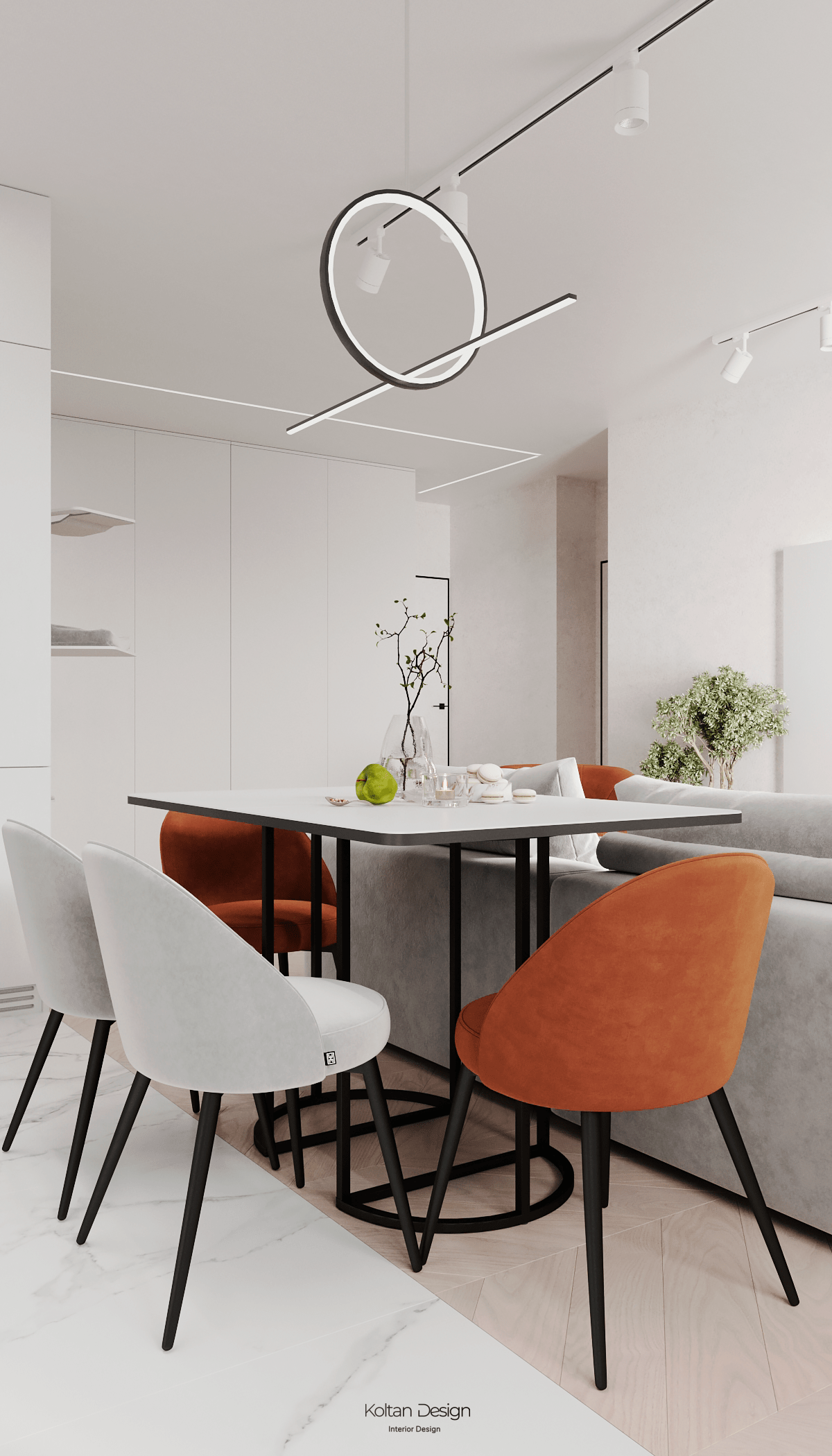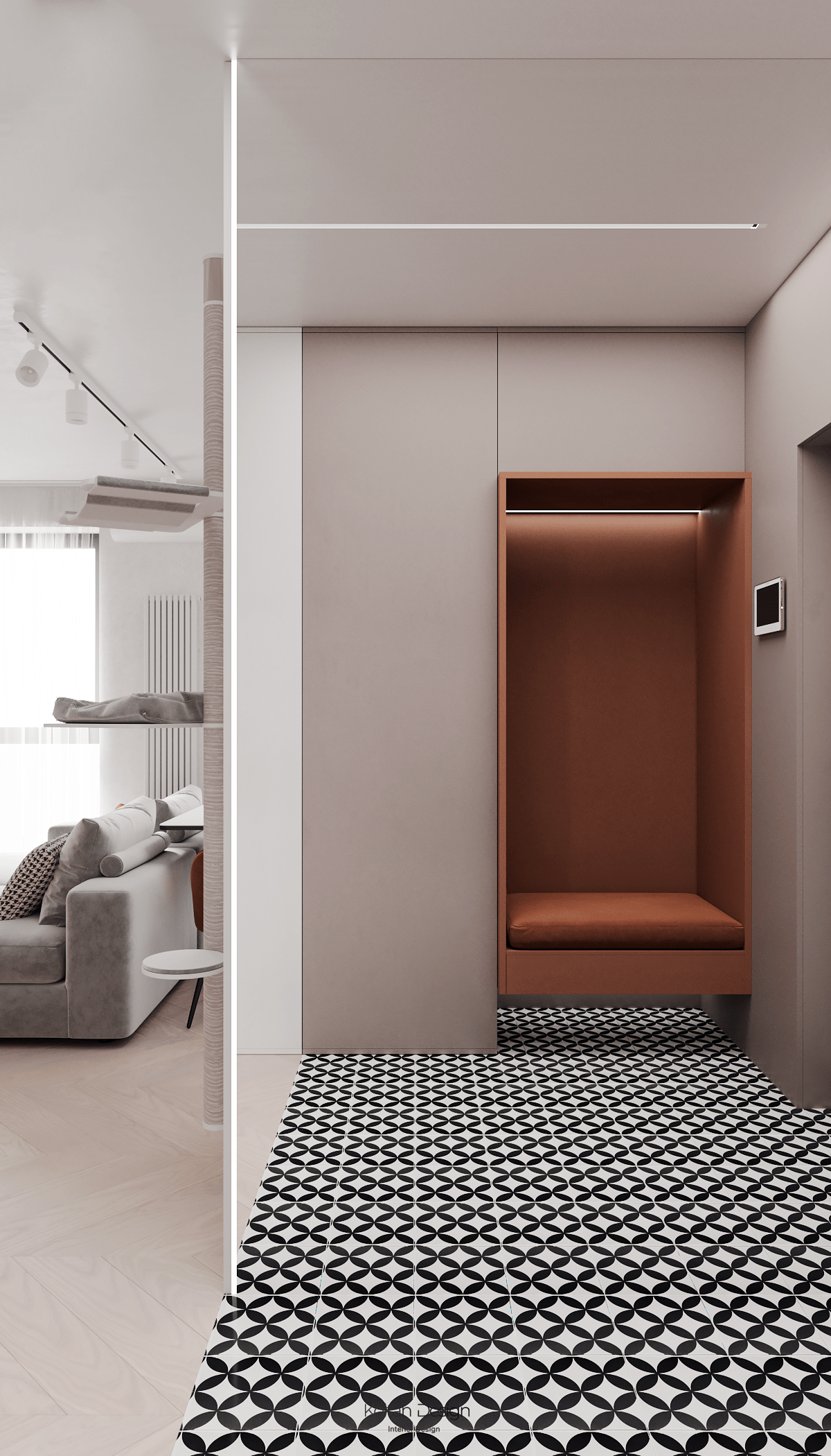 Интерьер этой квартиры для молодой пары и их питомца отличается сдержанностью и элегантностью. Светлая мебель и стены служат нейтральным фоном для акцентных элементов, таких как мягкие стулья, кресла и терракотовый куб сидушка в прихожей, который служит точками притяжения внимания в интерьере.