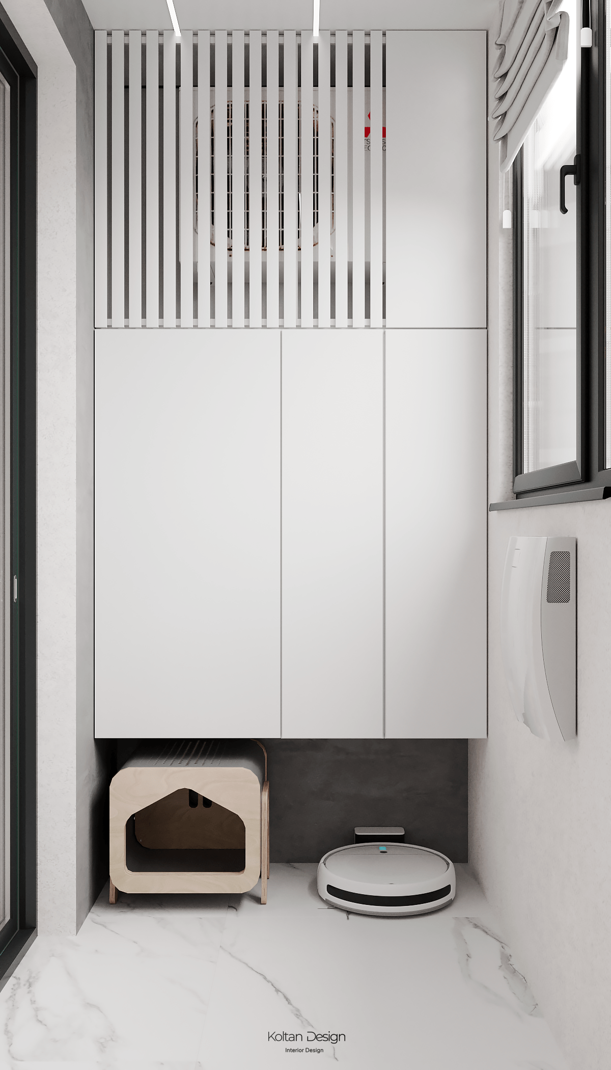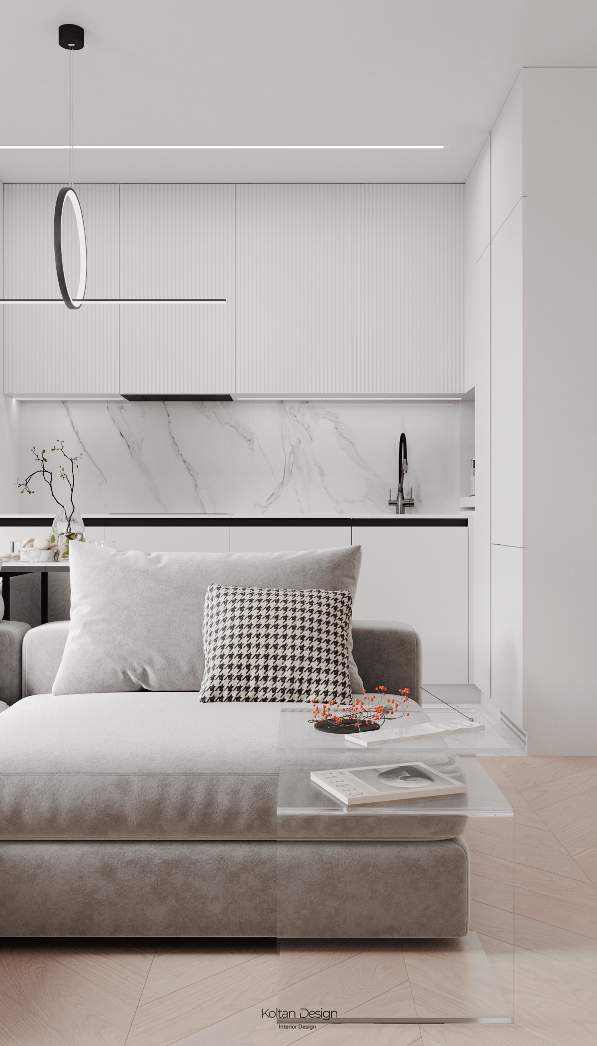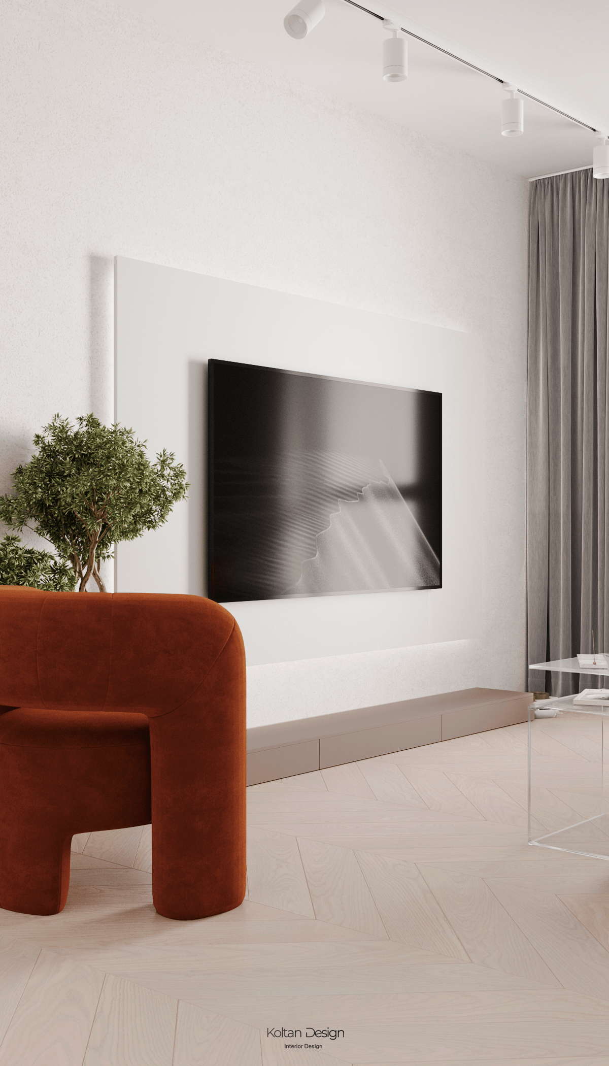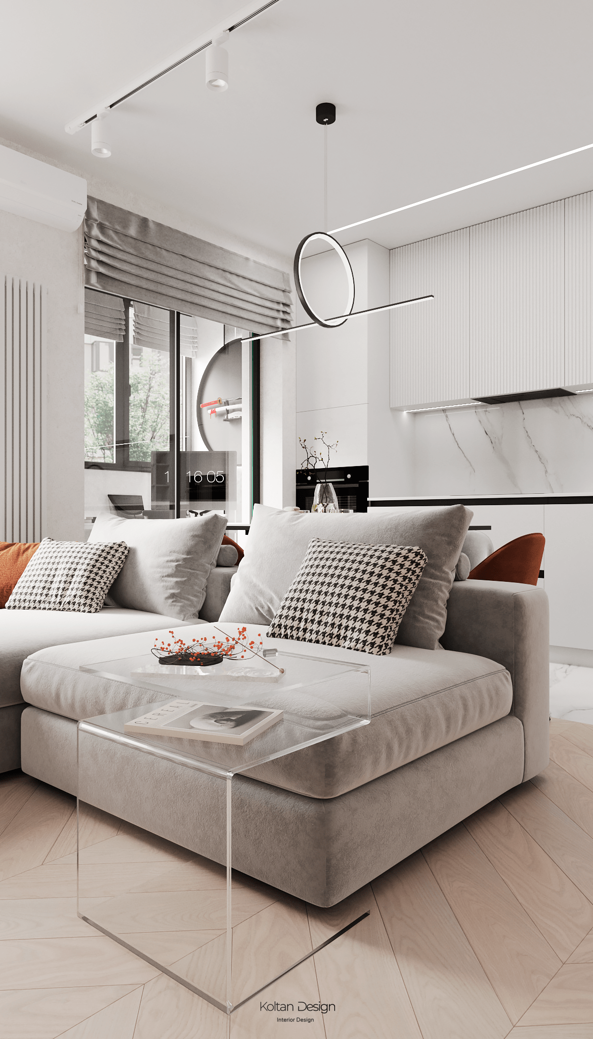Интерьер этой квартиры для молодой пары и их питомца отличается сдержанностью и элегантностью. Светлая мебель и стены служат нейтральным фоном для акцентных элементов, таких как мягкие стулья, кресла и терракотовый куб сидушка в прихожей, который служит точками притяжения внимания в интерьере.
