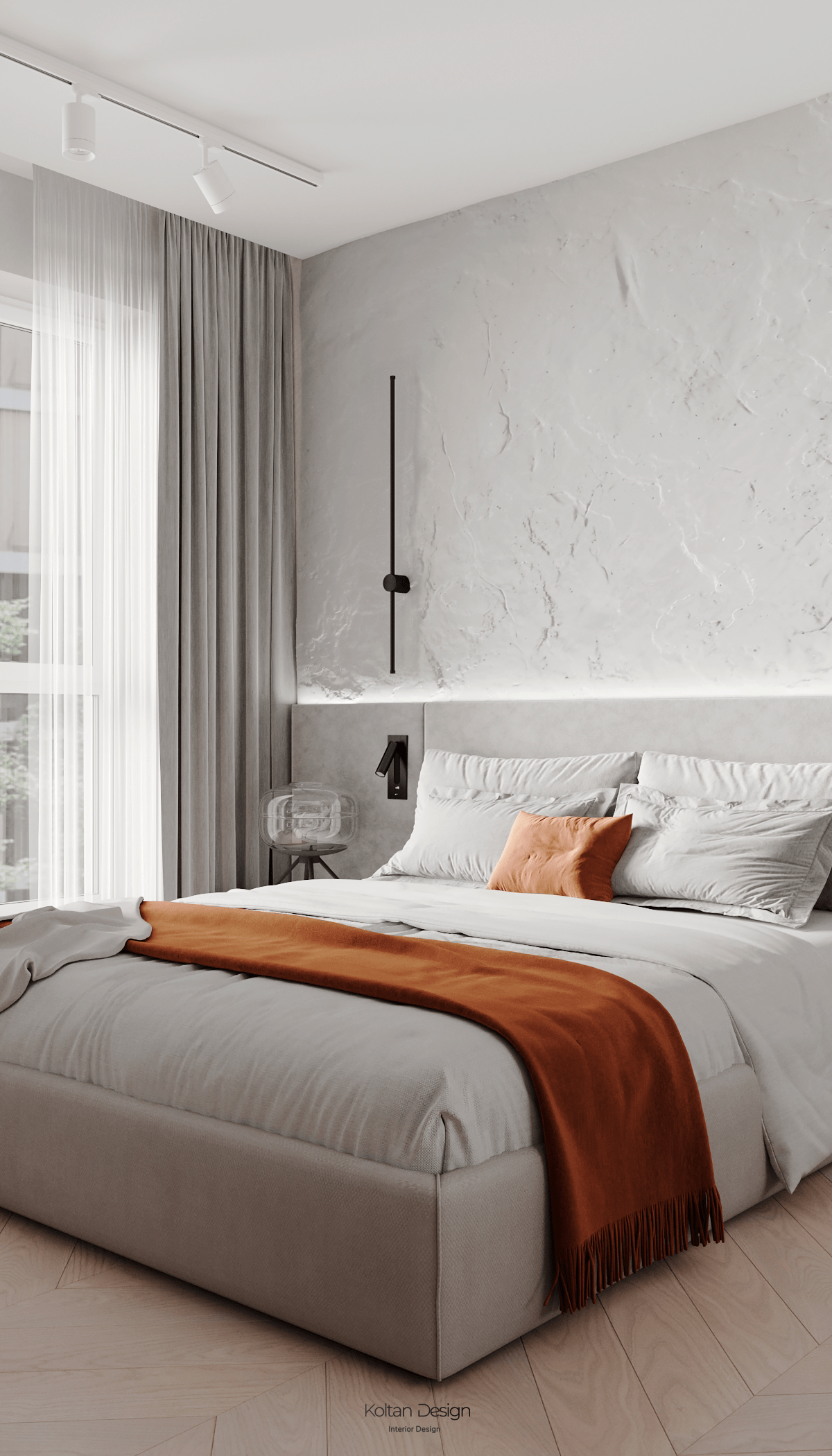 Интерьер спальни также максимально функционален и минималистичен, главными акцентами служат текстура декоративной штукатурки имитирующей скалу и отражающие поверхности, визуально увеличивающие пространство.