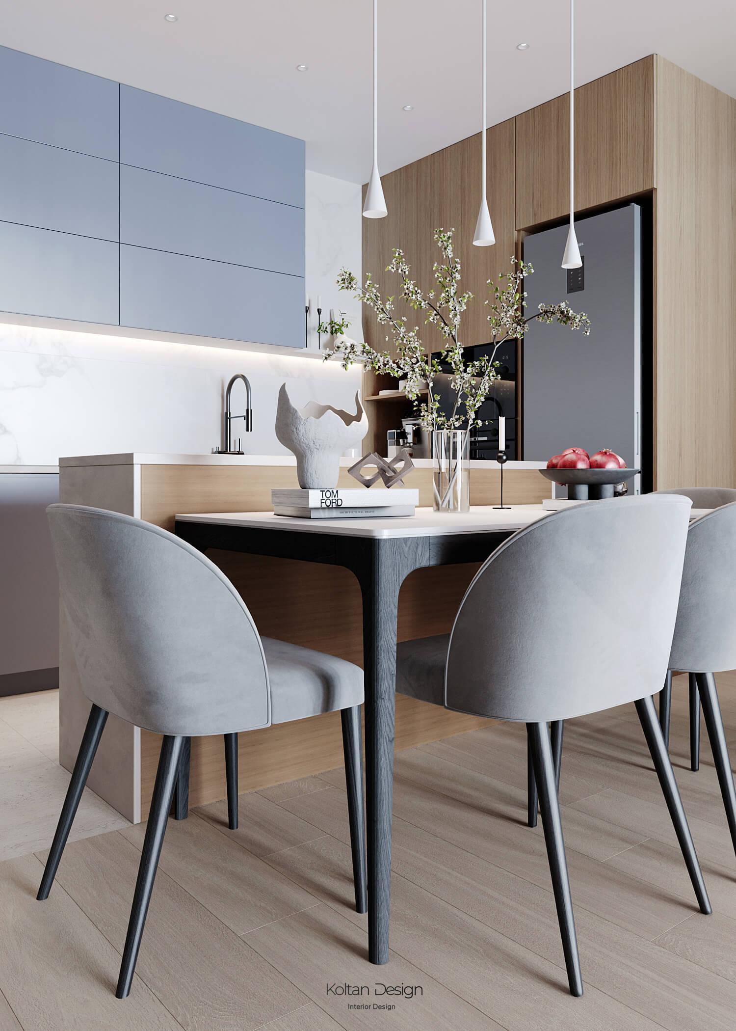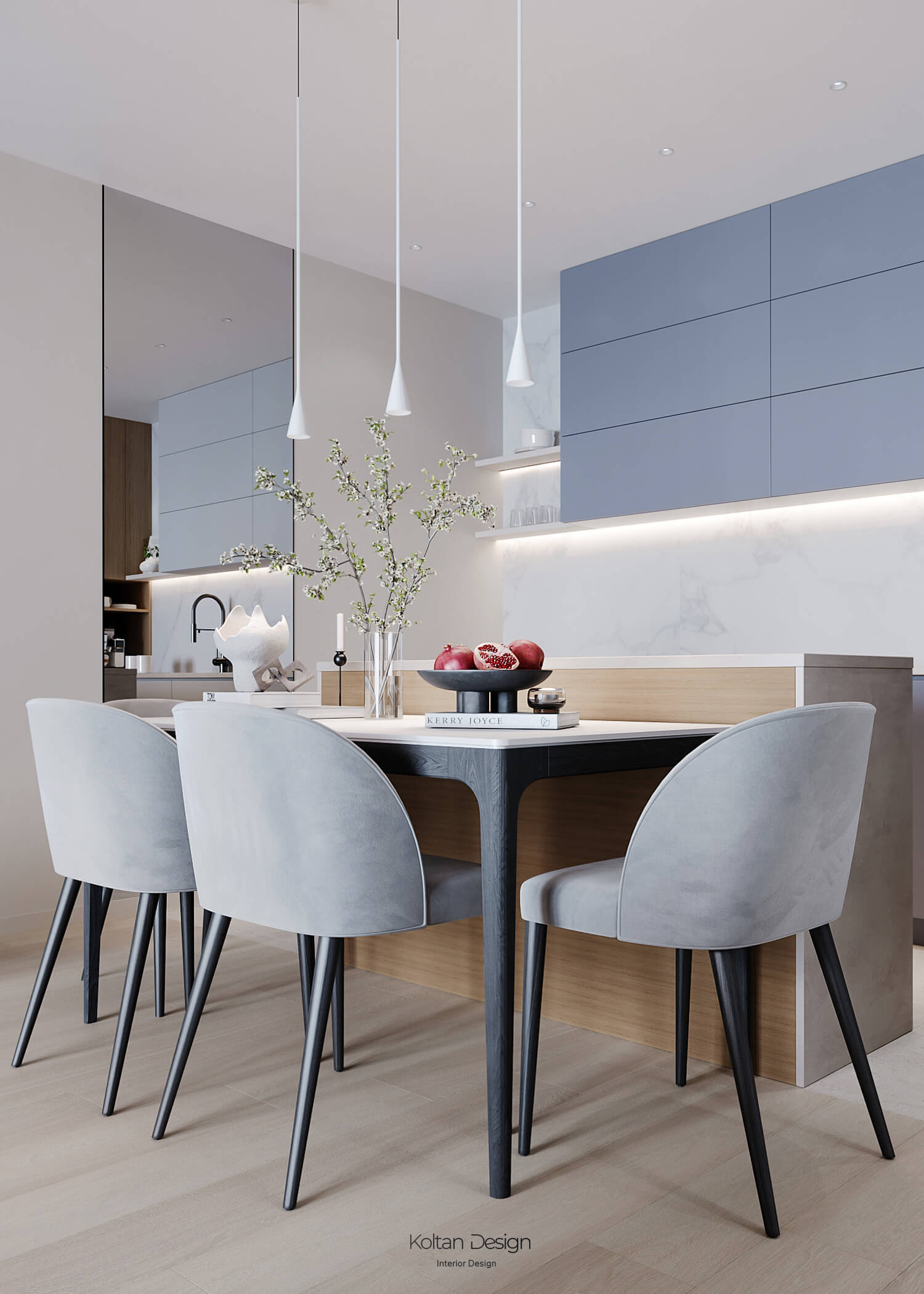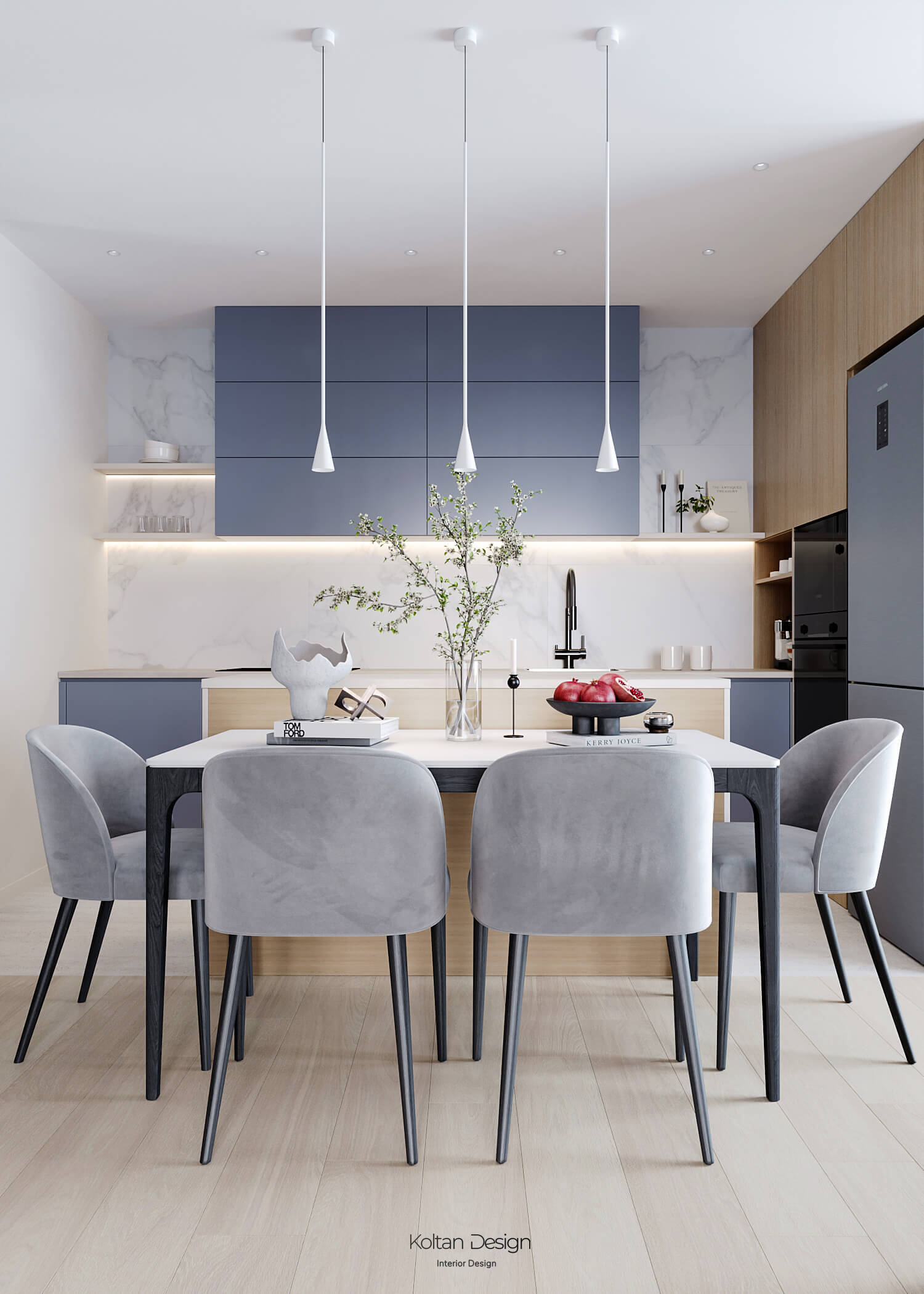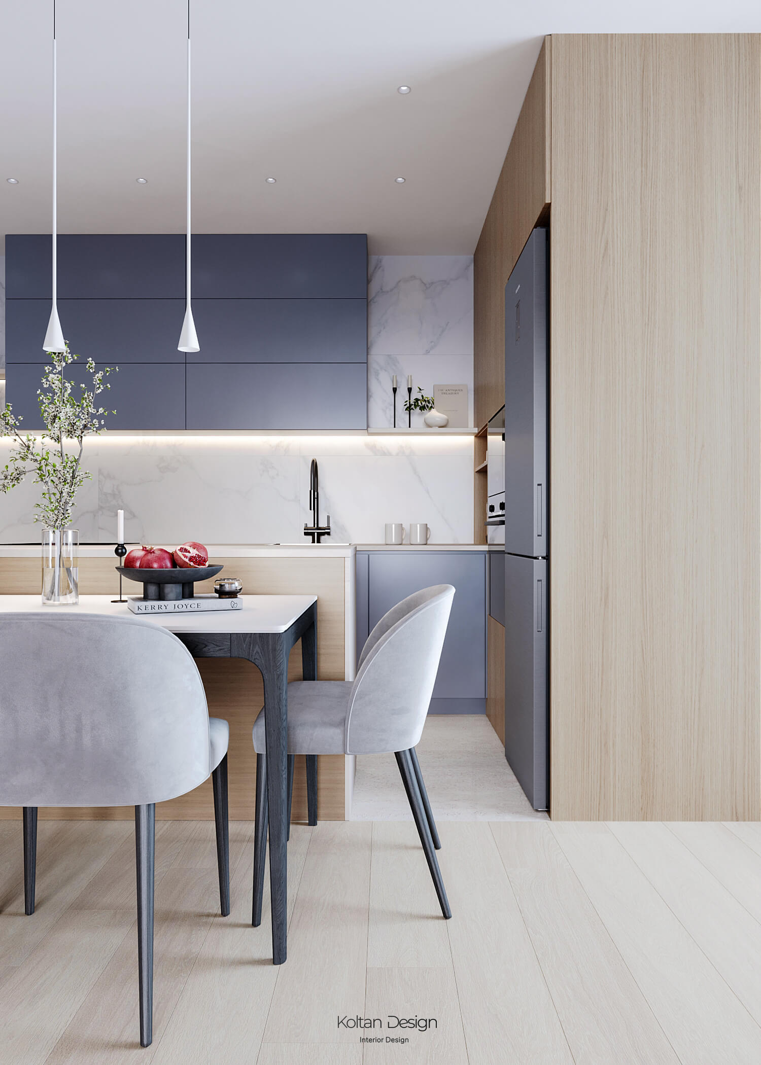 Просторная квартира идеально сочетает стиль, комфорт и практичность для молодой семьи с двумя детьми. Интерьер выполнен в светлых тонах с элементами дерева и акцентами синего цвета, выбранного хозяйкой.