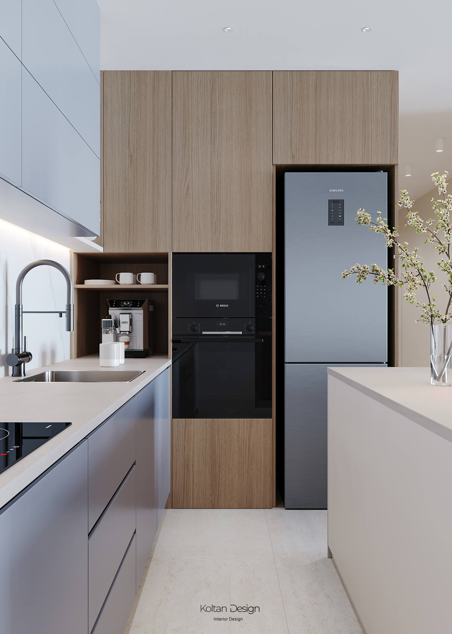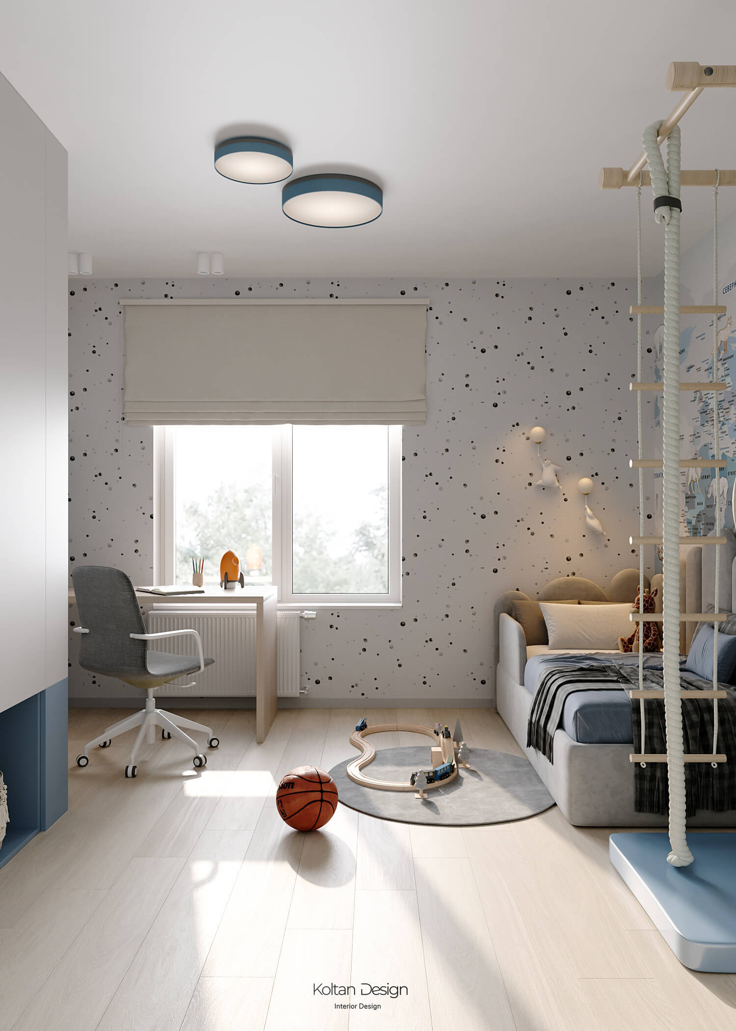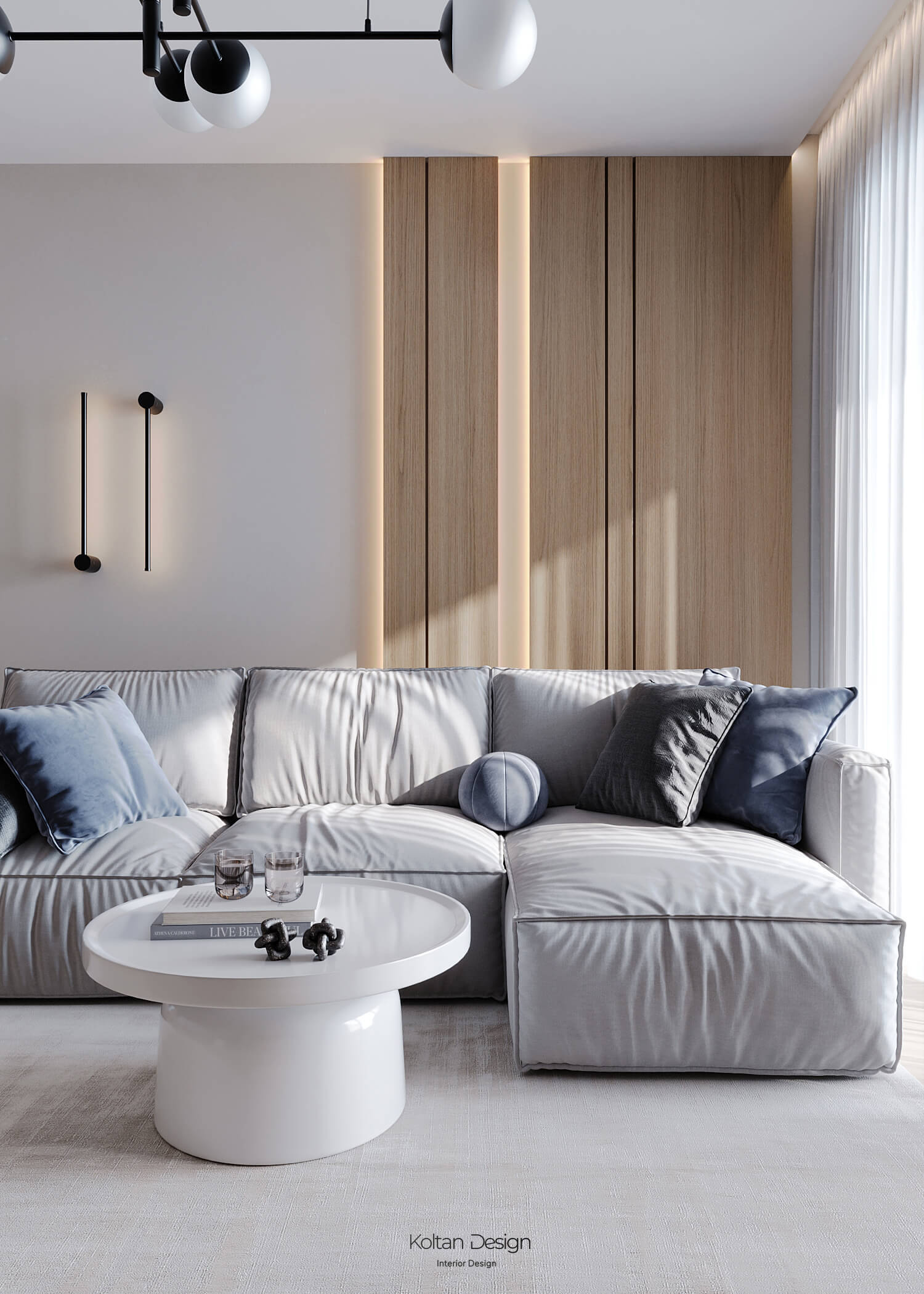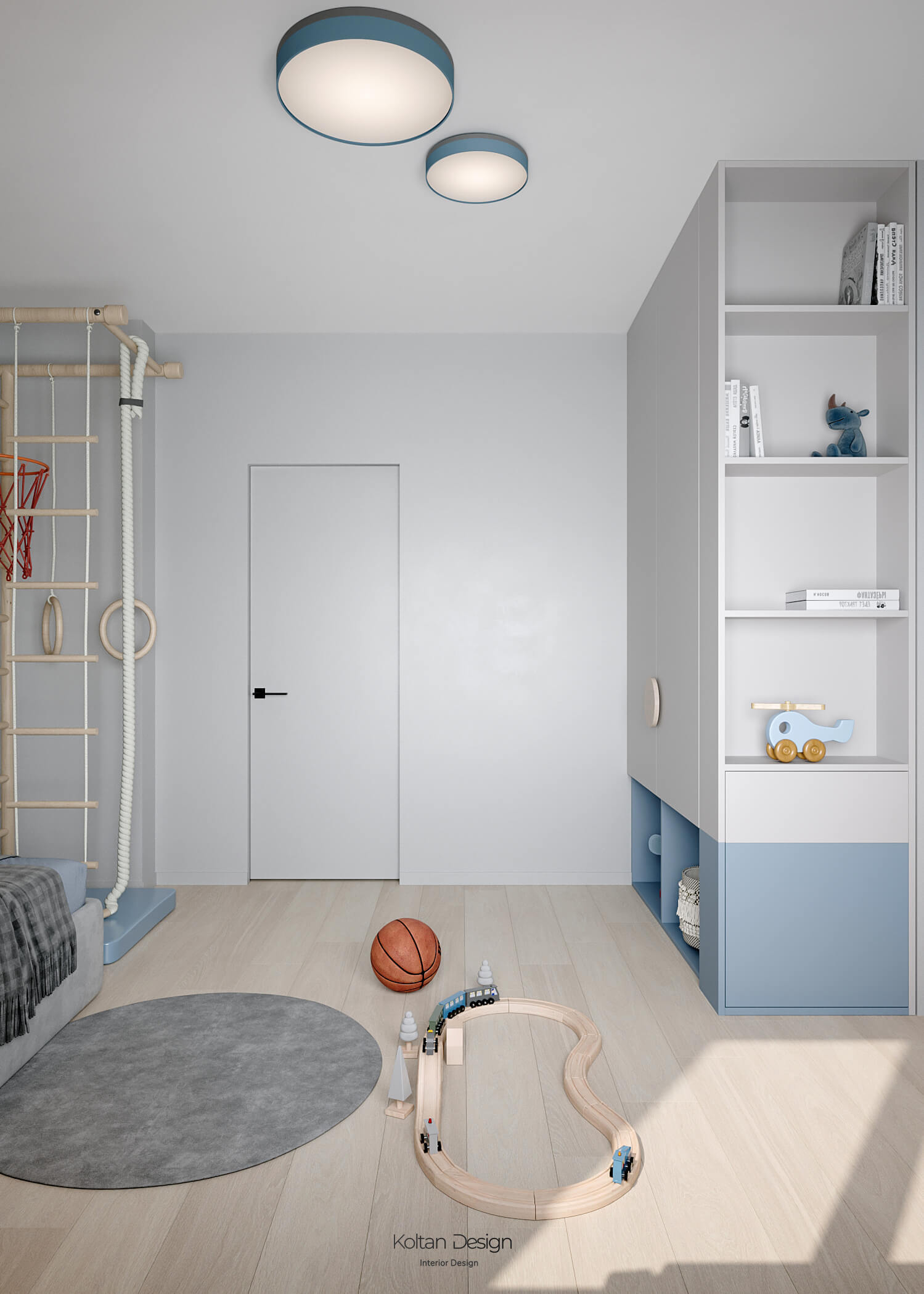 Просторная квартира идеально сочетает стиль, комфорт и практичность для молодой семьи с двумя детьми. Интерьер выполнен в светлых тонах с элементами дерева и акцентами синего цвета, выбранного хозяйкой.