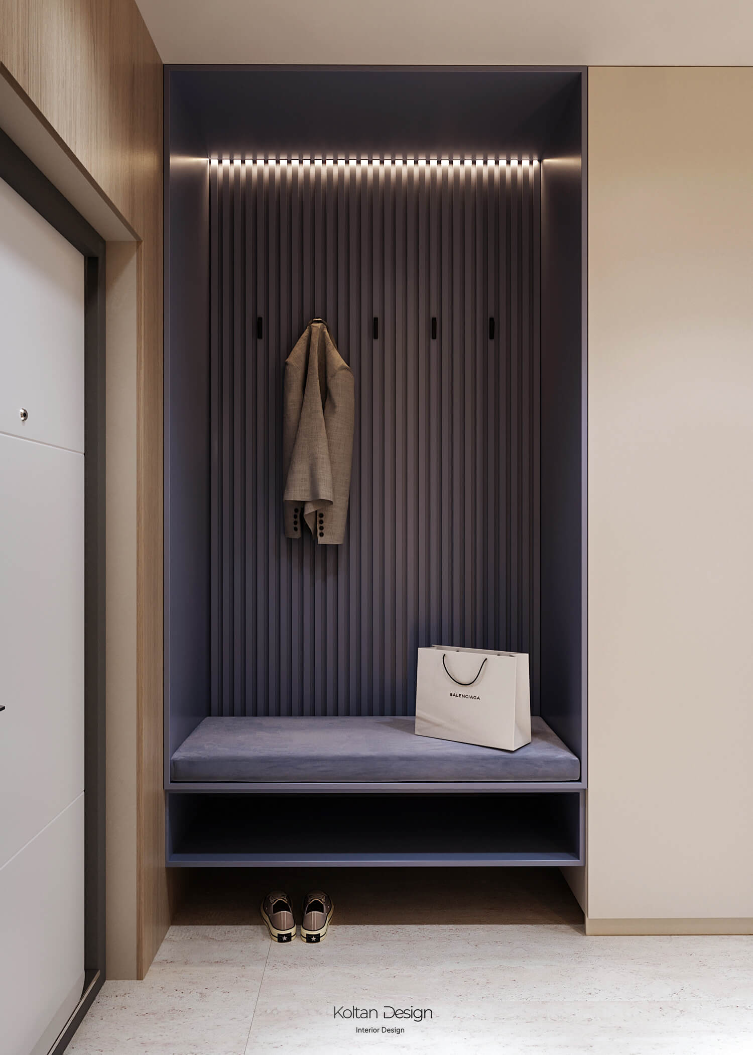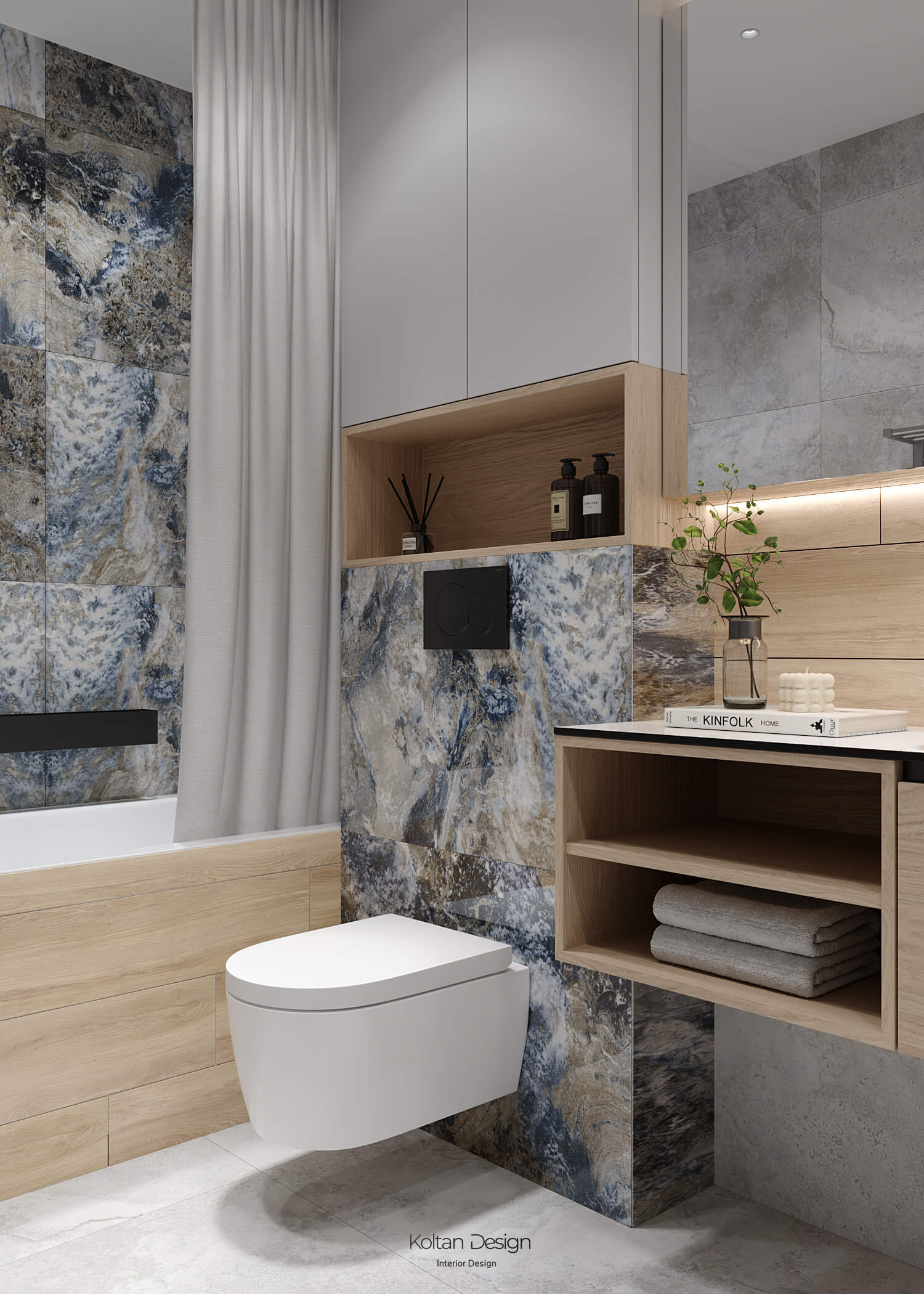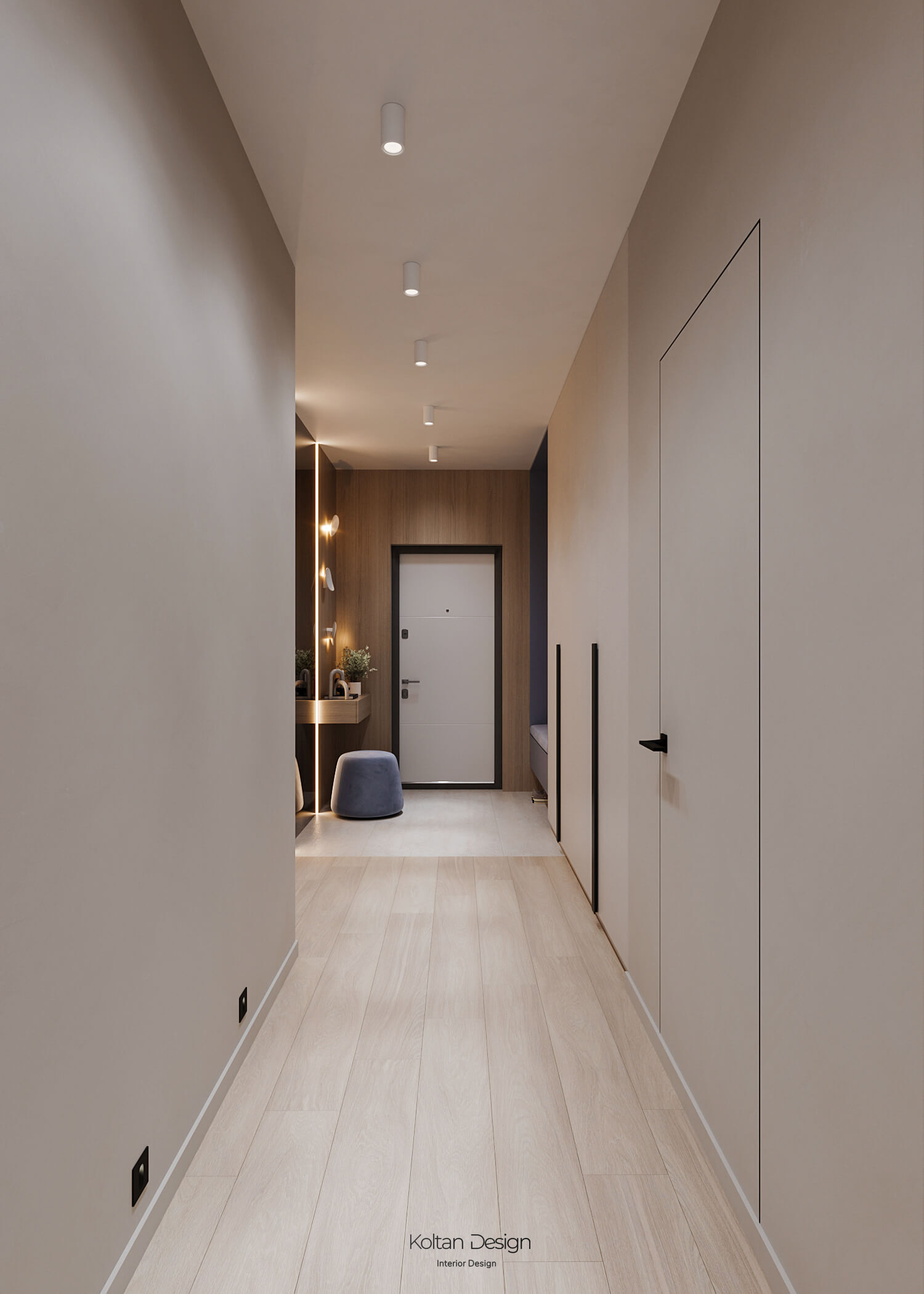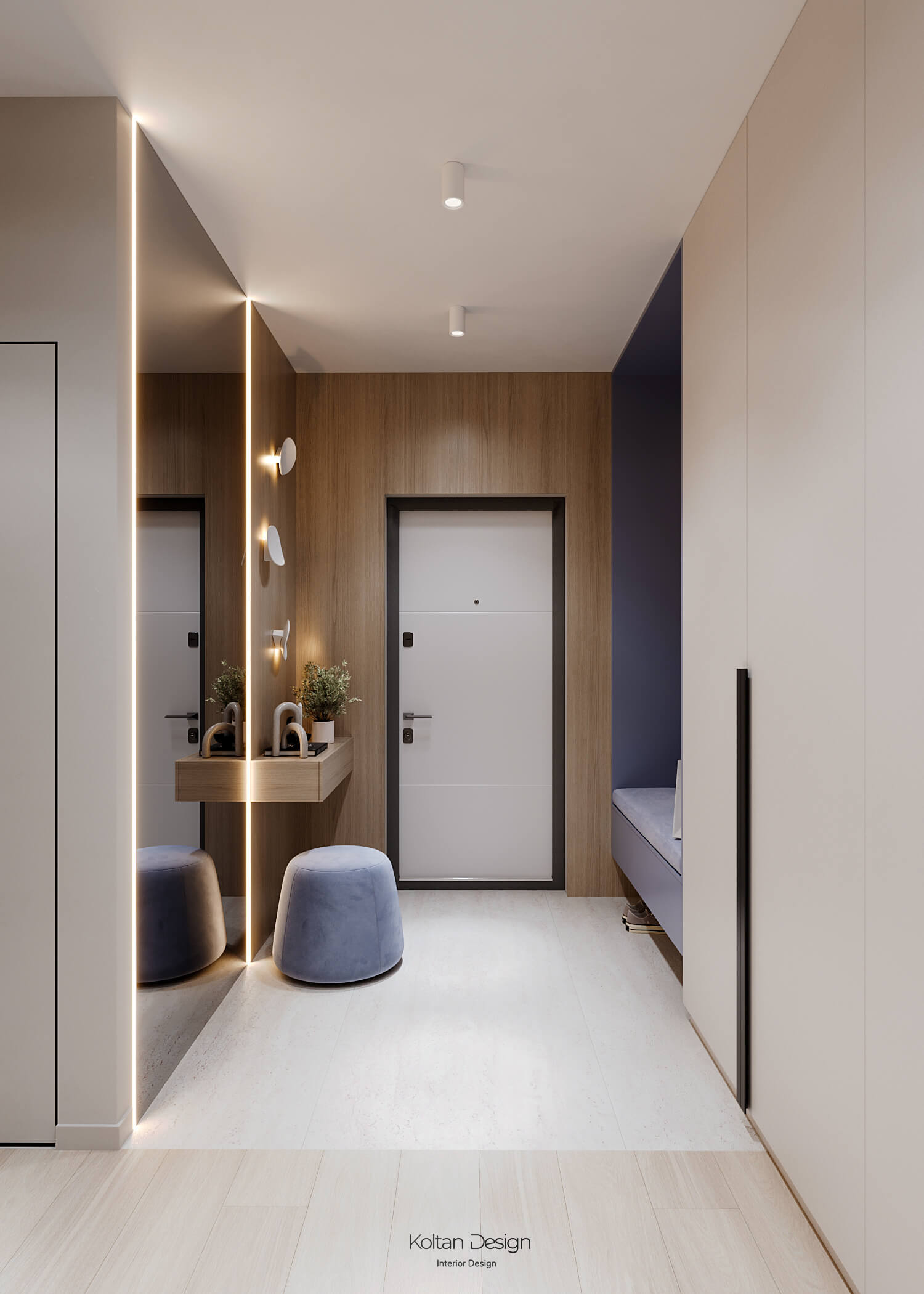 Просторная квартира идеально сочетает стиль, комфорт и практичность для молодой семьи с двумя детьми. Интерьер выполнен в светлых тонах с элементами дерева и акцентами синего цвета, выбранного хозяйкой.