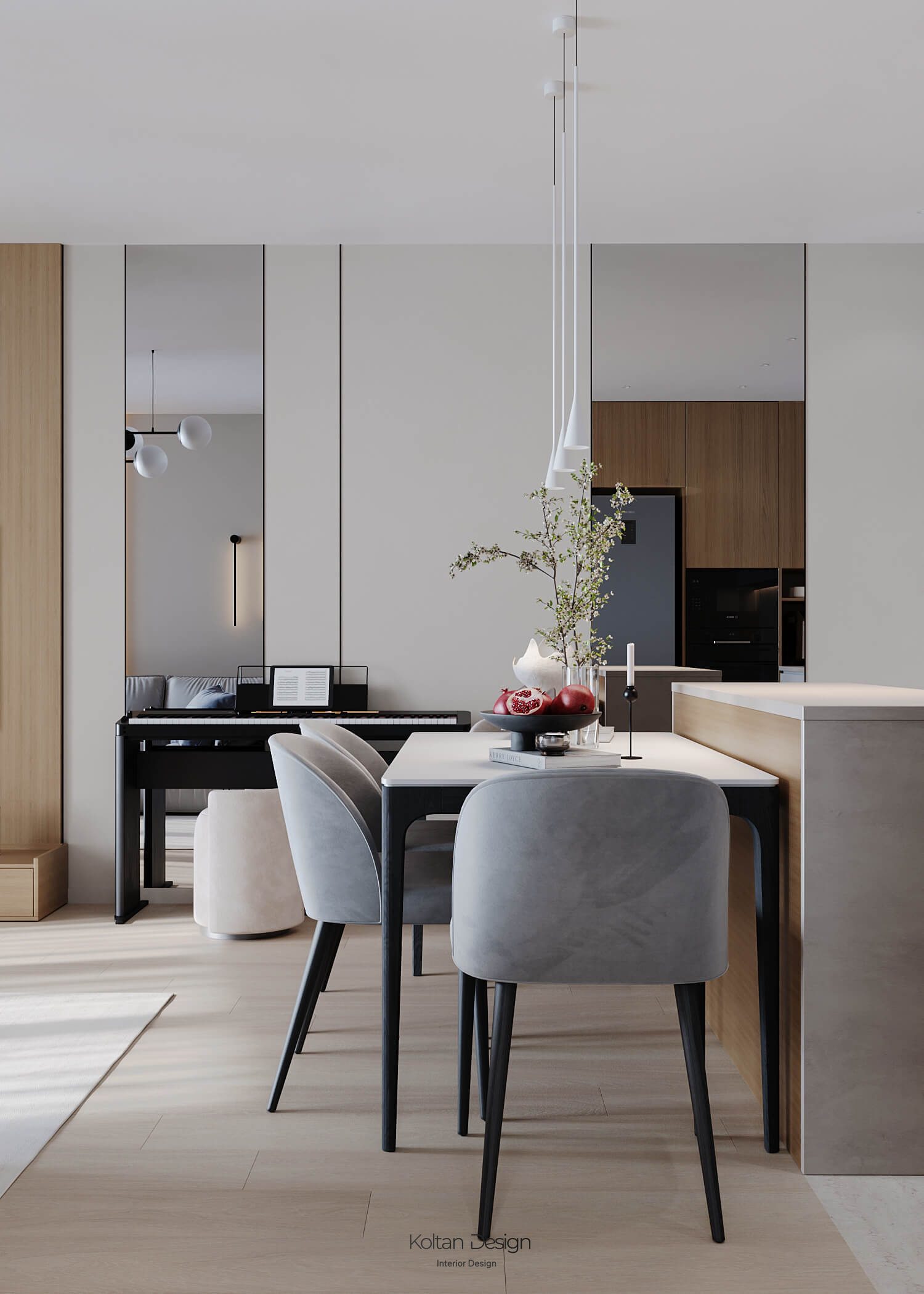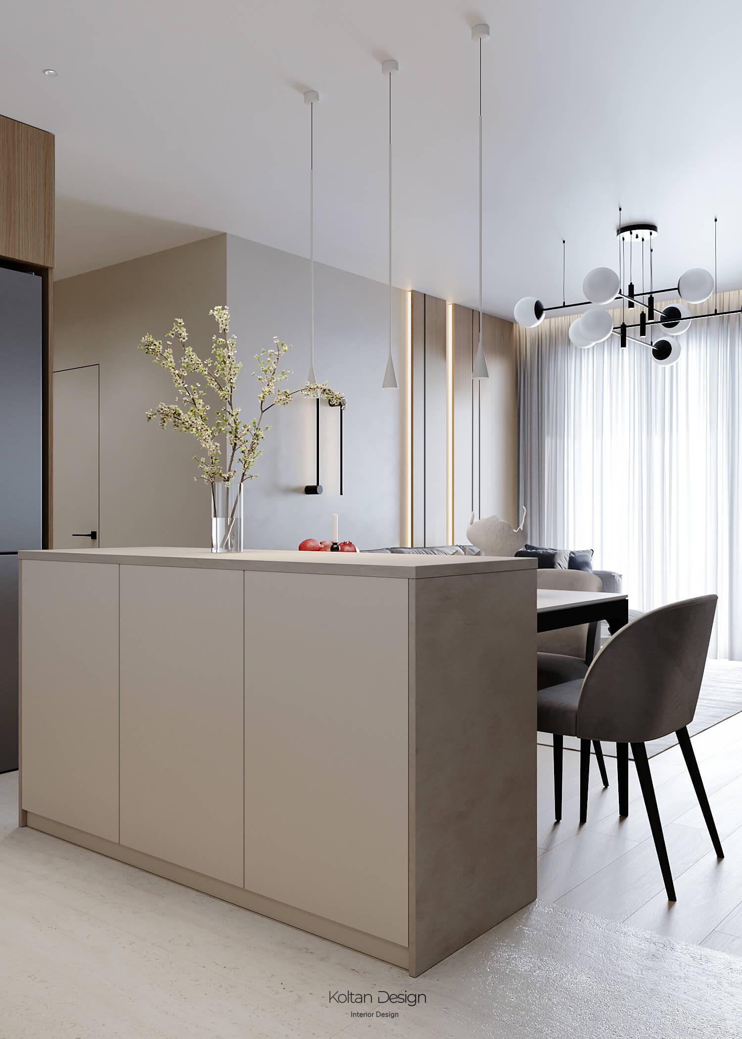 Просторная кухня-гостиная с функциональным кухонным островом и современной техникой объединена с зоной отдыха. Раскладной обеденный стол вмещает всю семью, а уютная гостиная с мягкой мебелью и деревянными панелями на стенах создаёт атмосферу уюта.