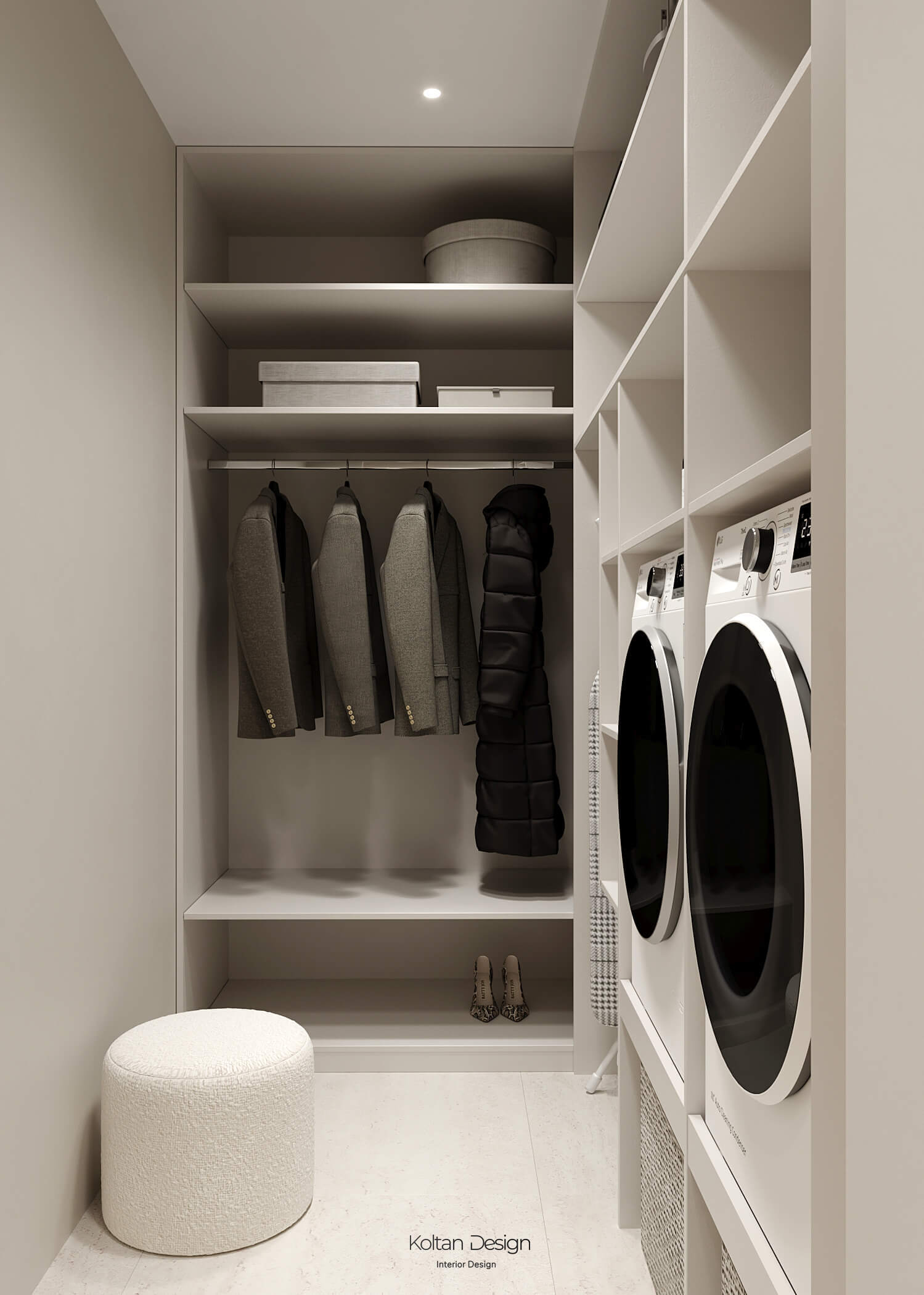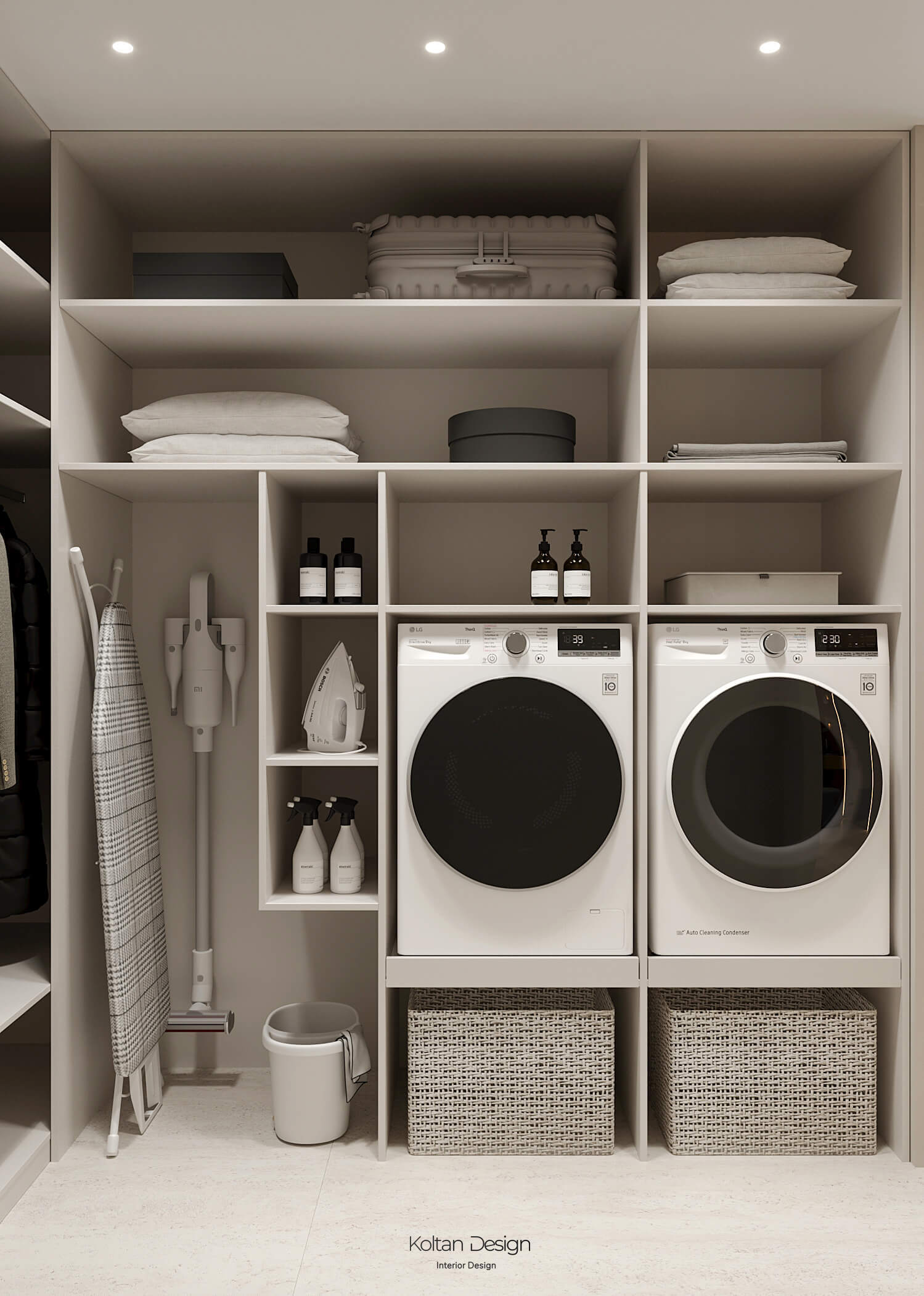 В квартире два санузла, а также постирочная, оснащенная стиральным блоком и местом для хранения белья.