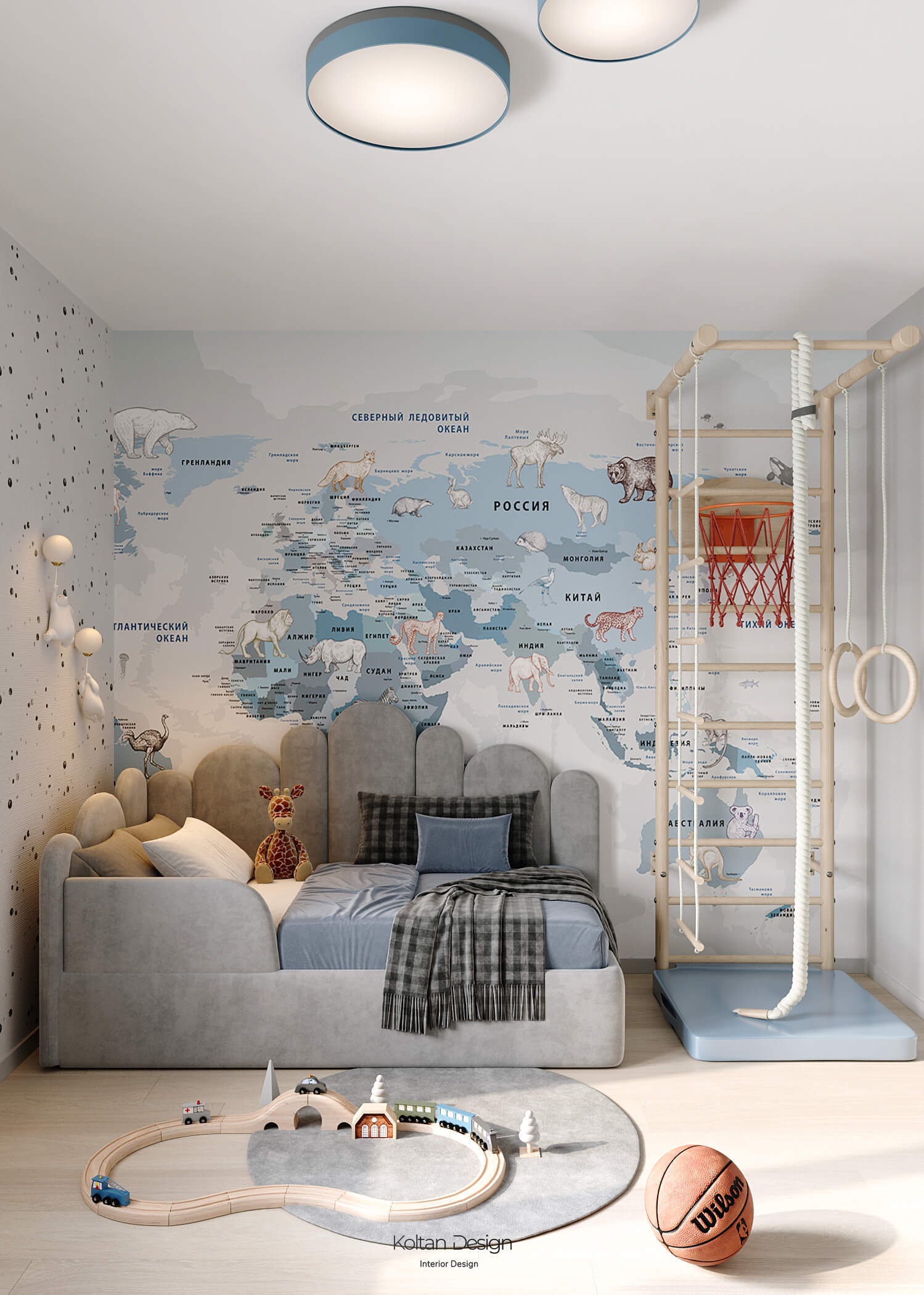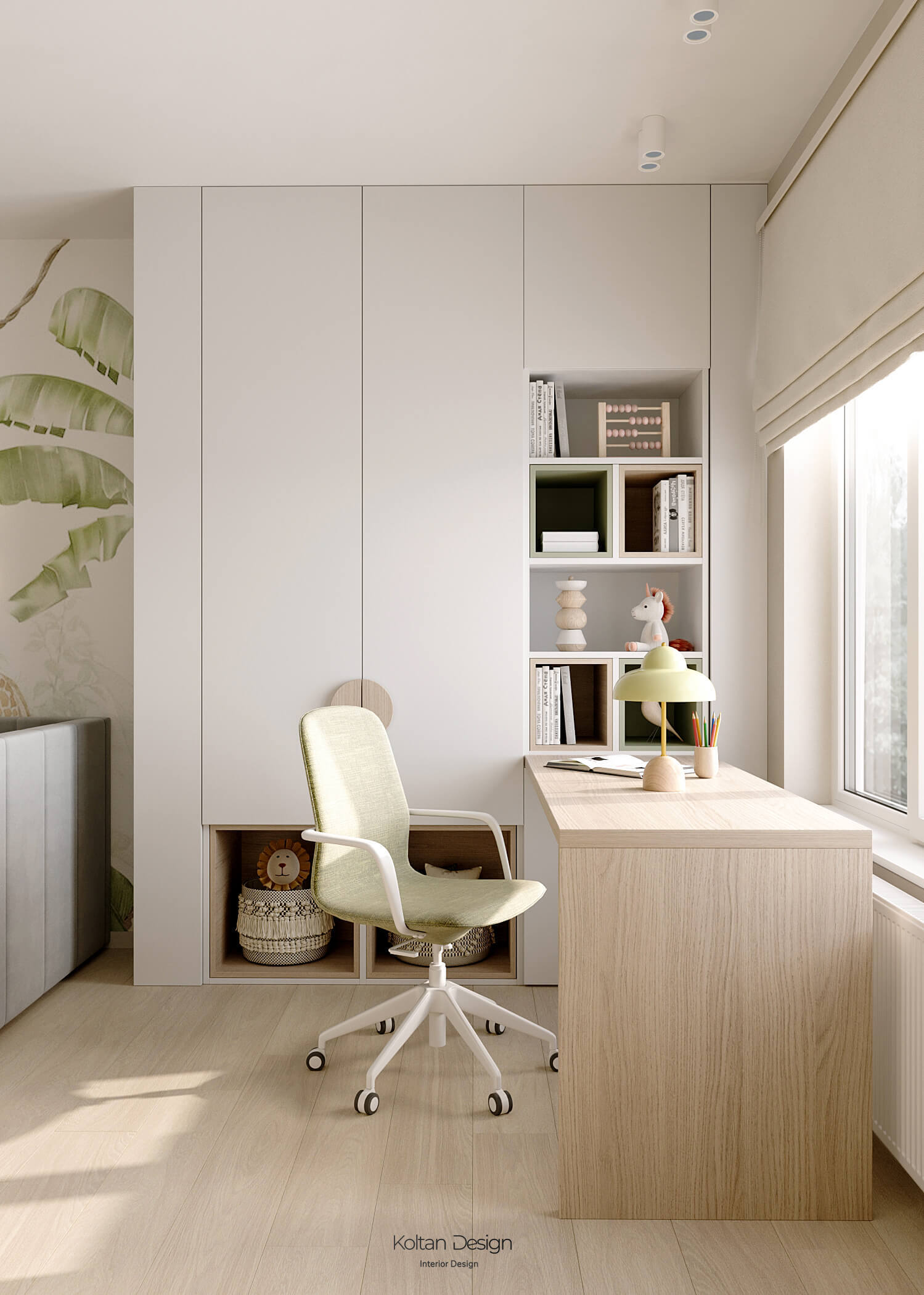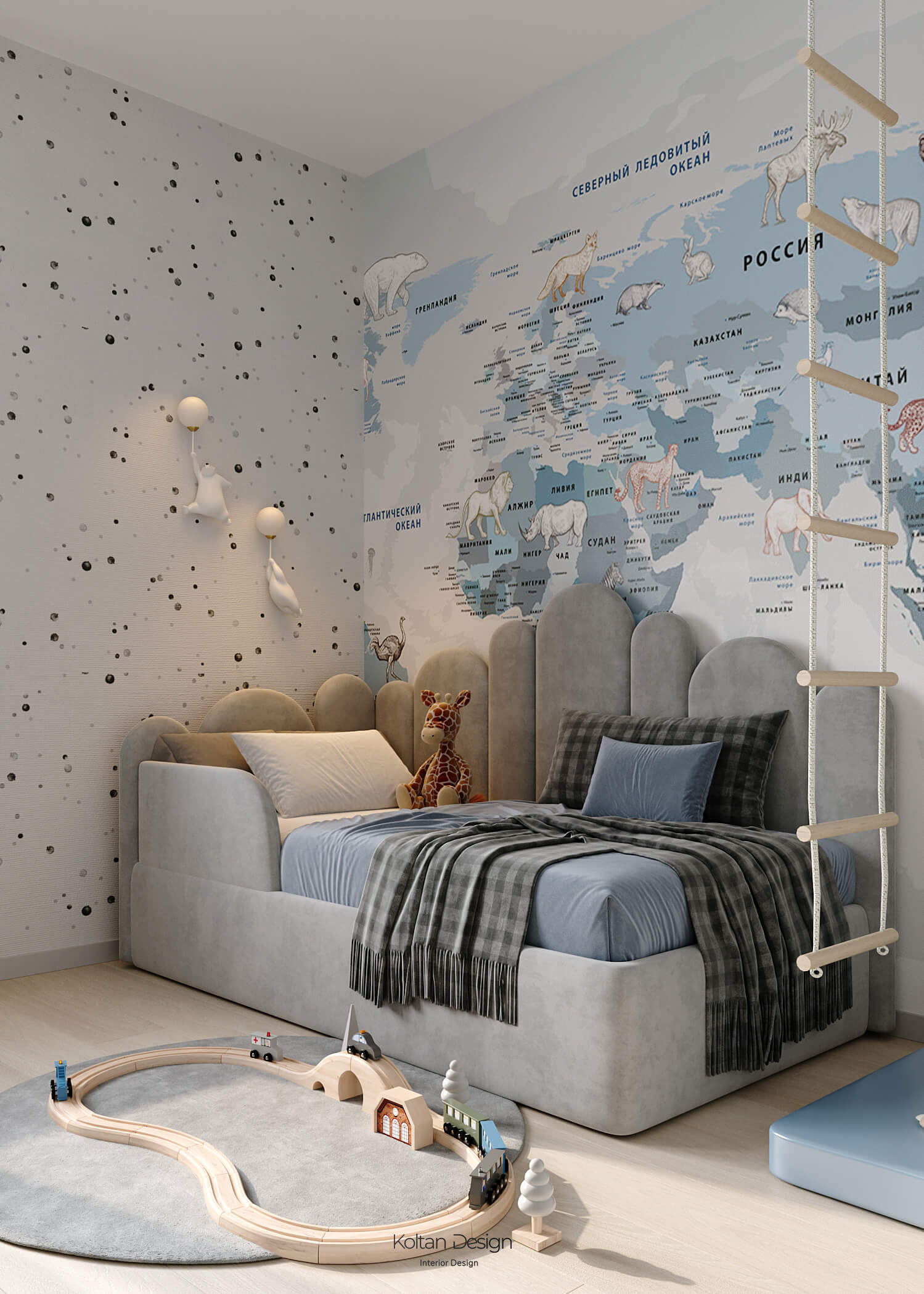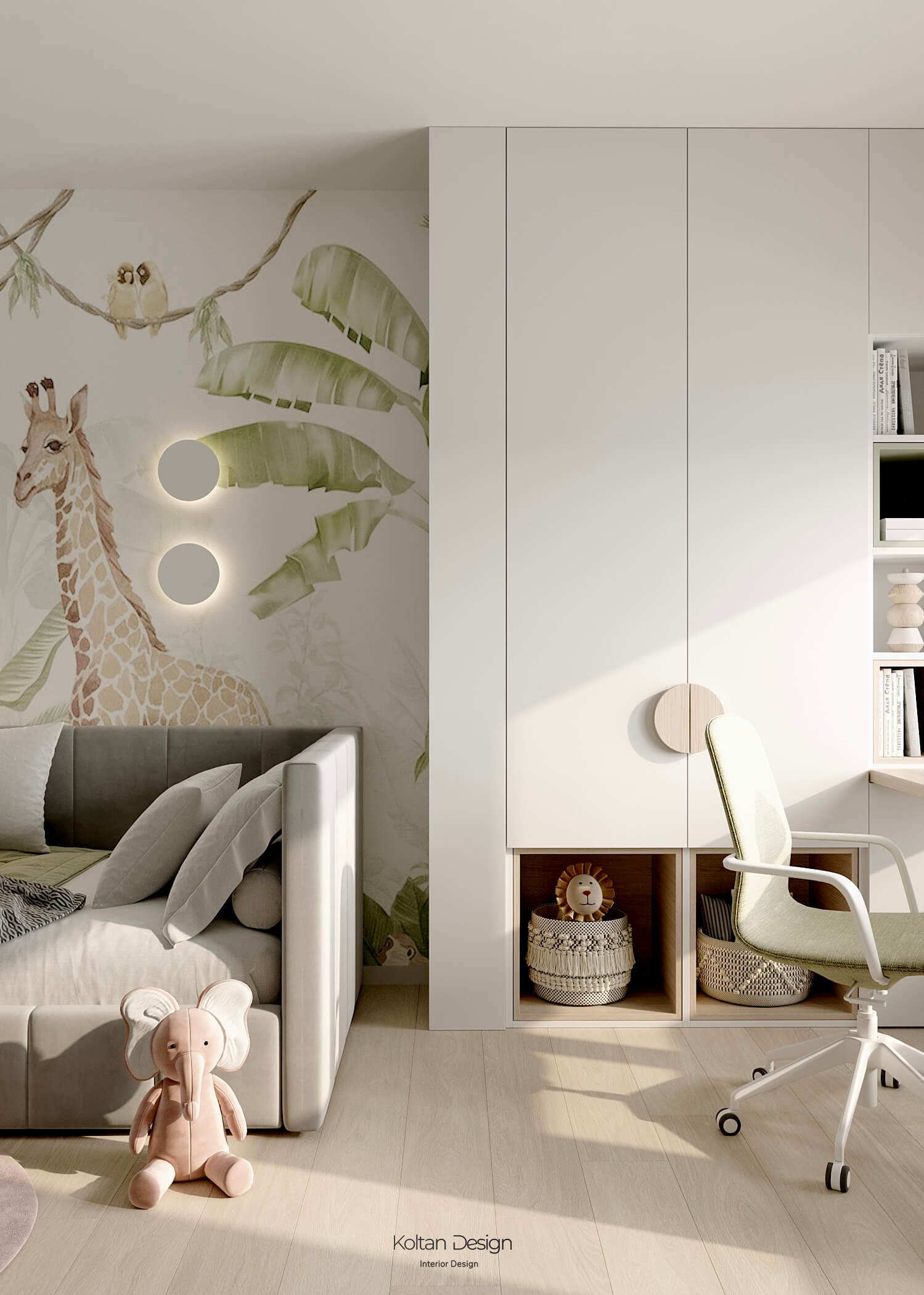 Комната для трёхлетнего мальчика оформлена яркими, но спокойными оттенками, с элементами для игры и развития. Комната для девочки школьного возраста имеет рабочую зону и удобное место для хранения вещей, но при этом яркая и интересная - рисунок для панно на стены выбирала сама маленькая хозяйка комнаты.