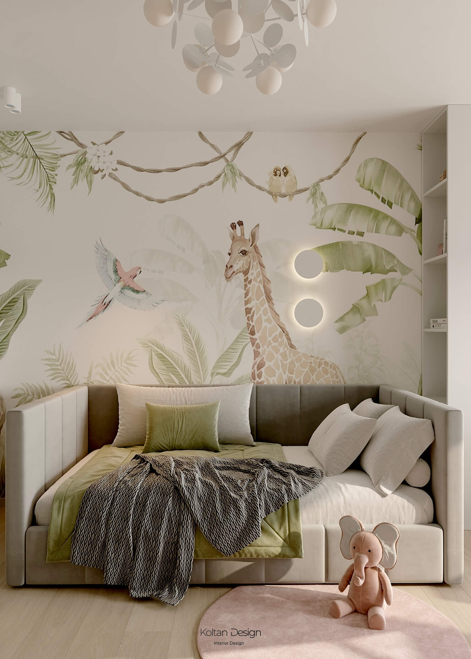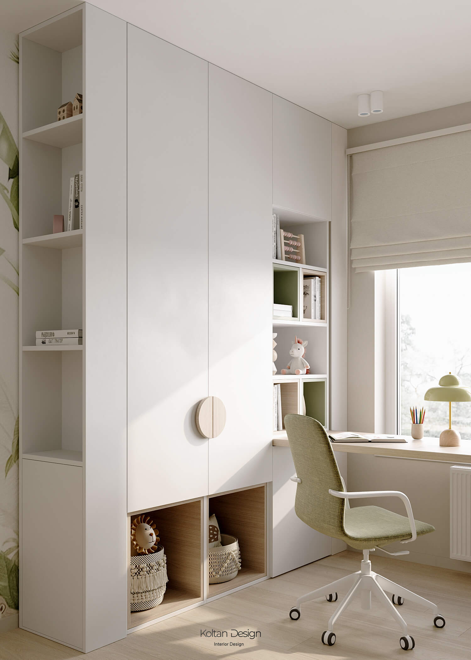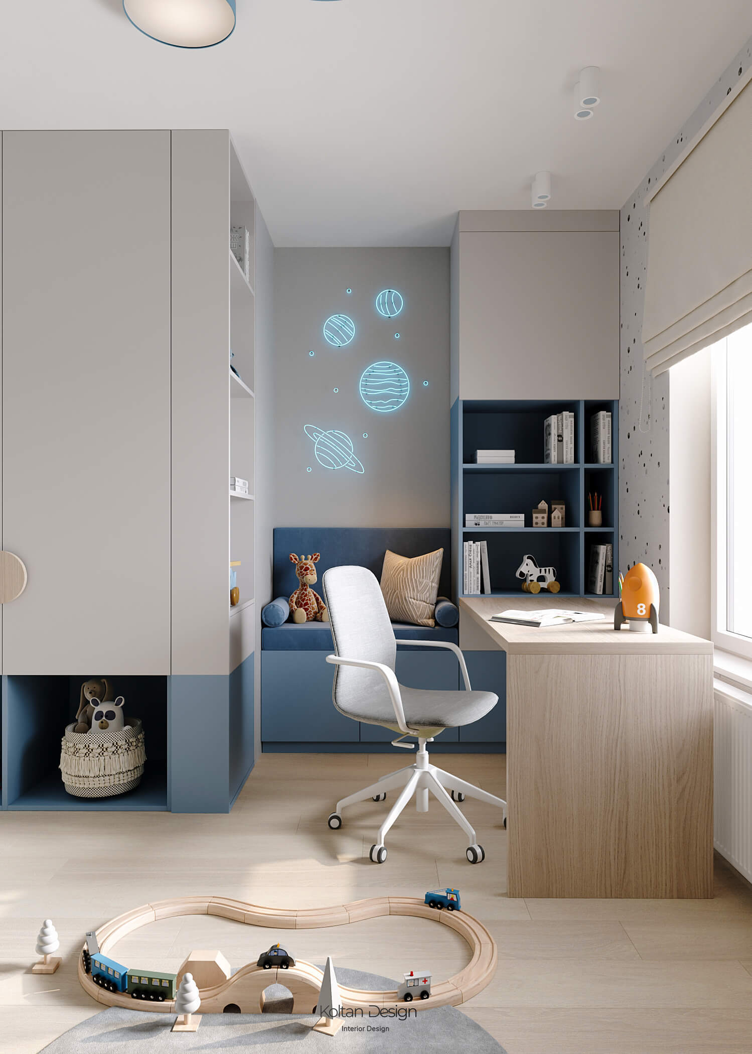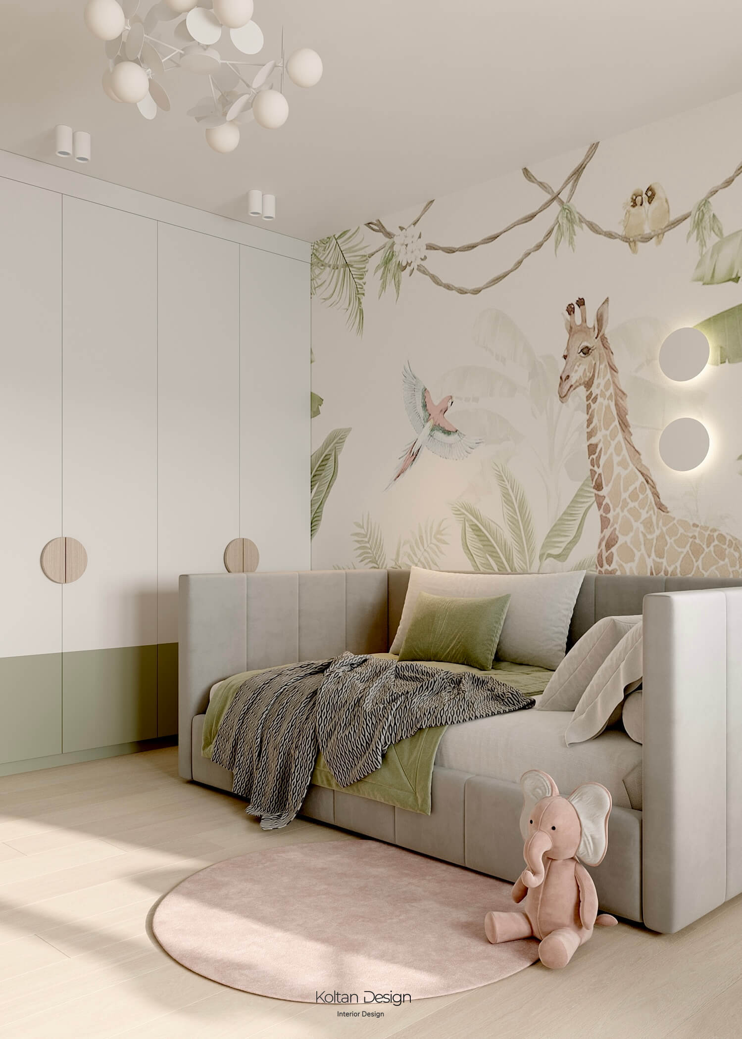 Комната для трёхлетнего мальчика оформлена яркими, но спокойными оттенками, с элементами для игры и развития. Комната для девочки школьного возраста имеет рабочую зону и удобное место для хранения вещей, но при этом яркая и интересная - рисунок для панно на стены выбирала сама маленькая хозяйка комнаты.
