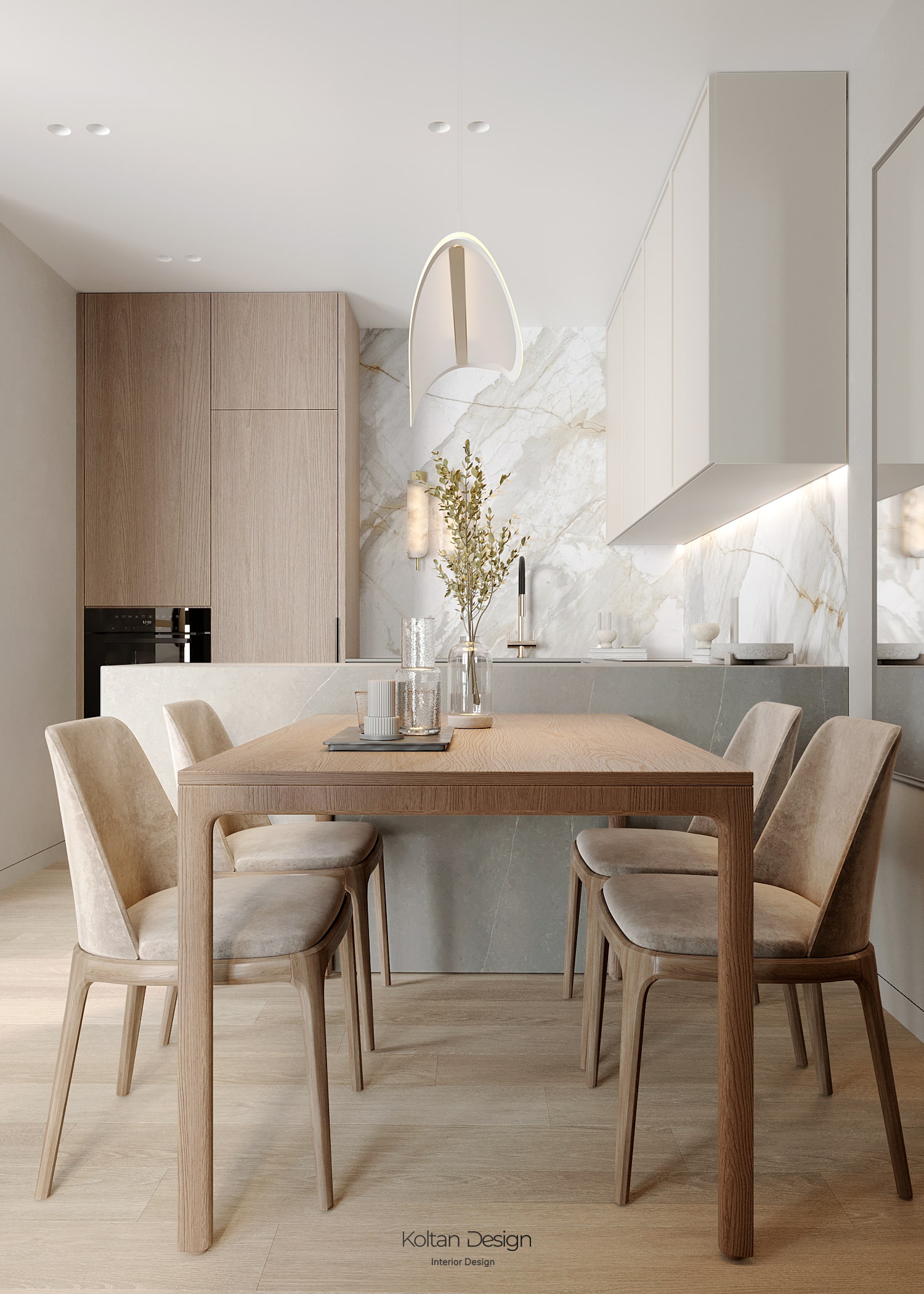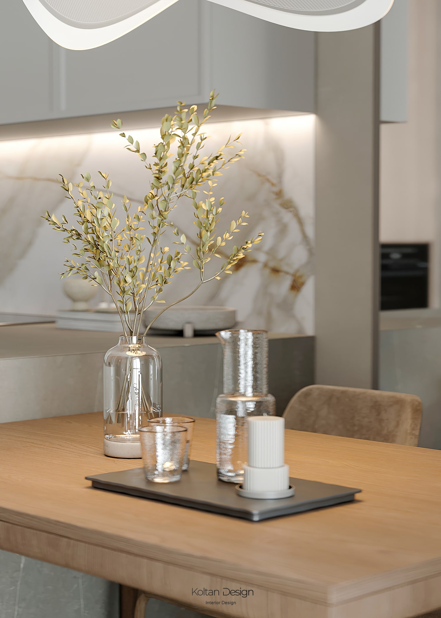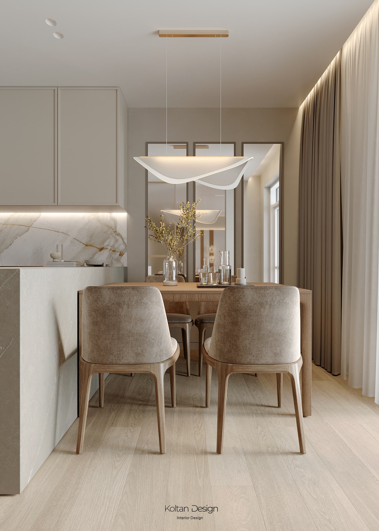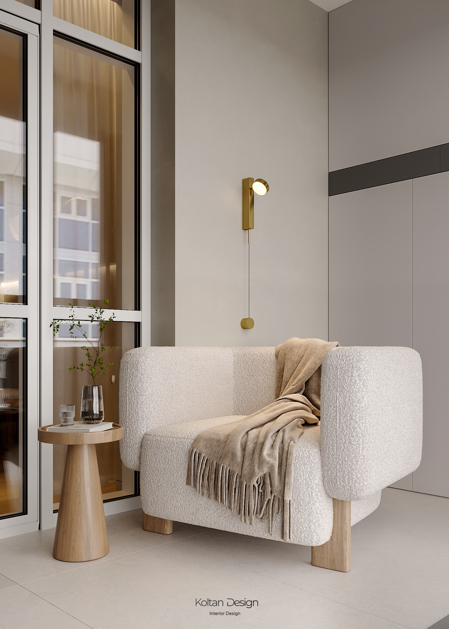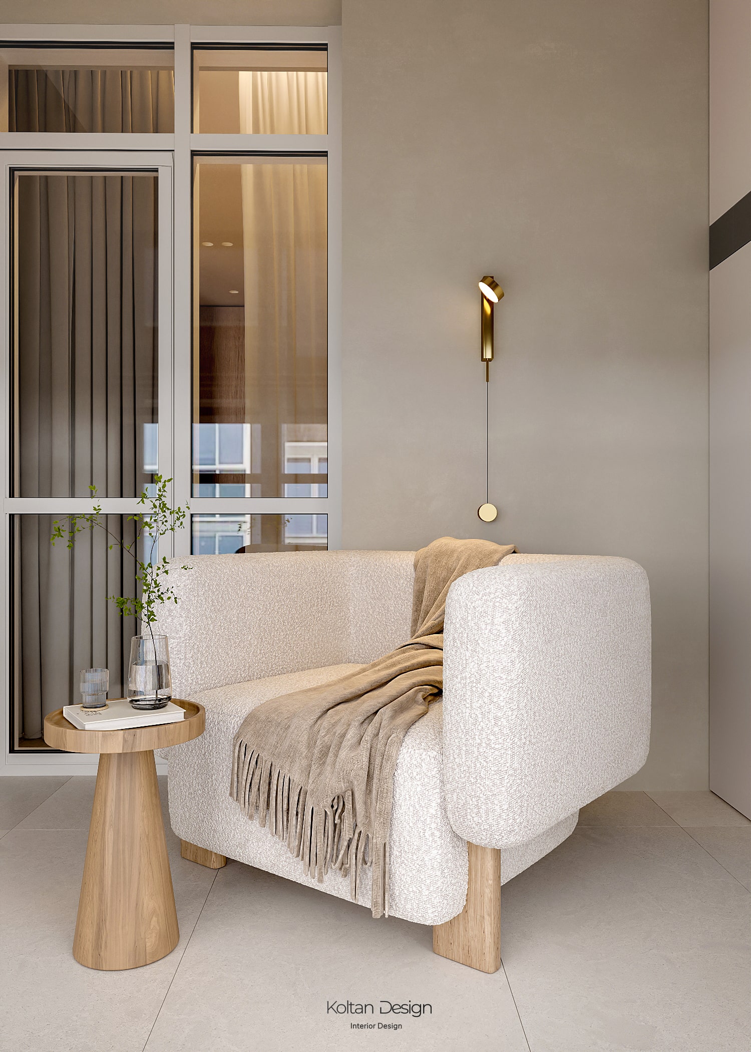 Интерьер выдержан в светлых, теплых оттенках, что придает помещению легкость и визуальную гармонию. Стены окрашены в нейтральные цвета, а элементы из натурального дерева, такие как мебель и акценты, привносят чувство уюта и связи с природой. Здесь нет ярких контрастов, а плавные линии создают атмосферу спокойствия и порядка. Отсутствие темных фурнитурных деталей подчеркивает минималистичный подход, фокусируясь на естественности и простоте. Мебель во всех комнатах продумана до мелочей — она не только современная, но и максимально удобная в уходе, не требующая много усилий для поддержания порядка.