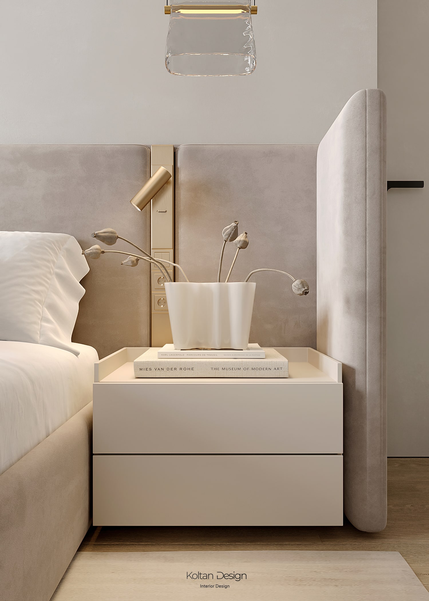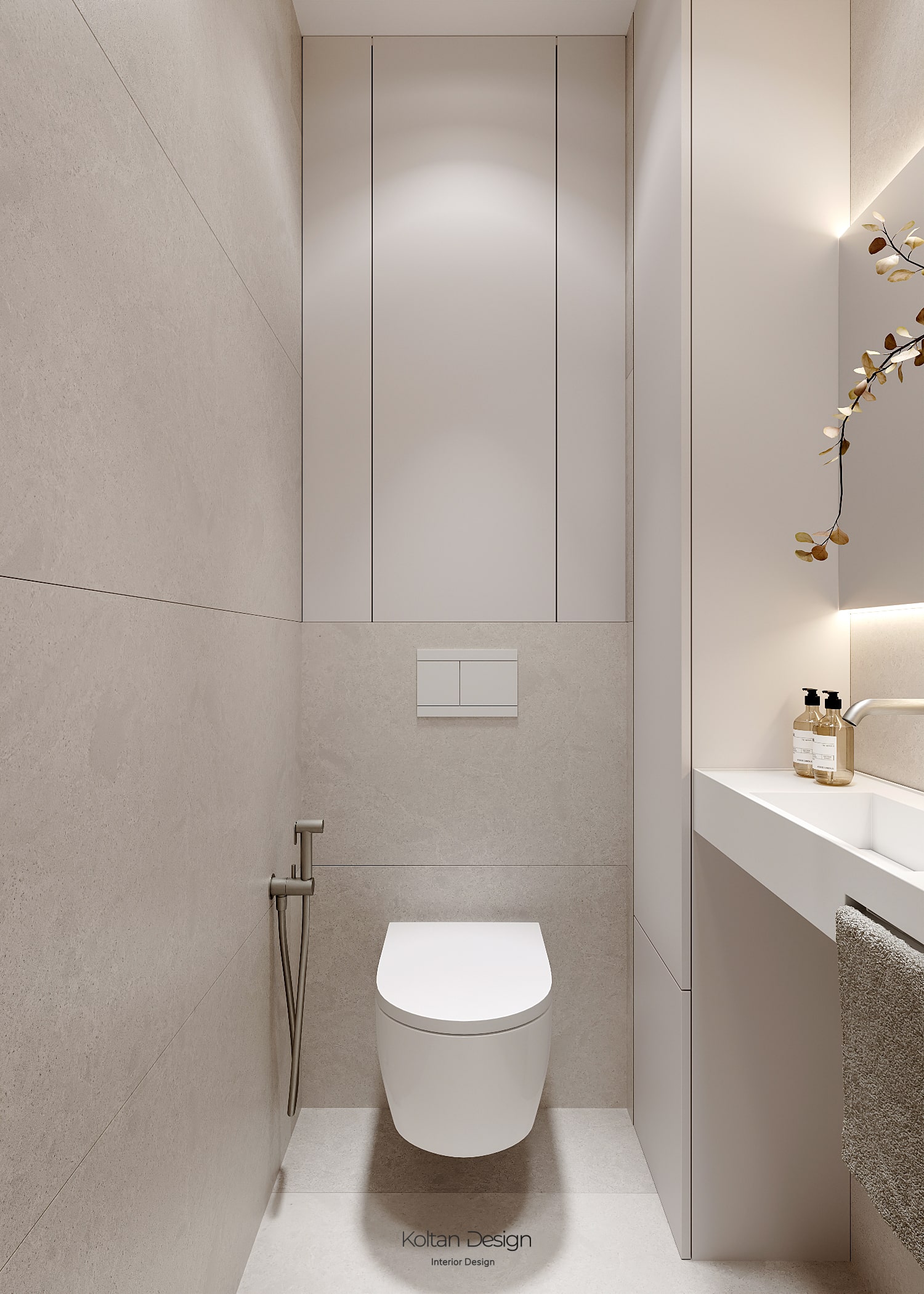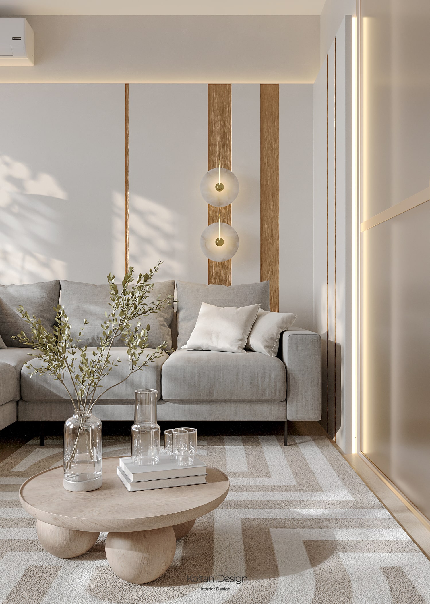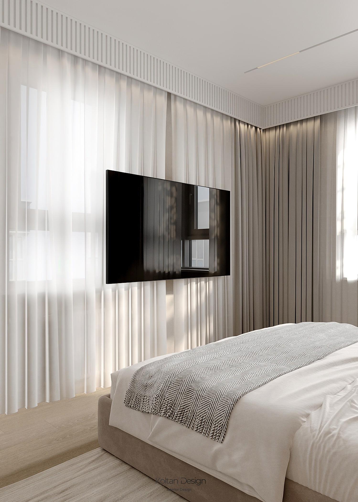 Интерьер выдержан в светлых, теплых оттенках, что придает помещению легкость и визуальную гармонию. Стены окрашены в нейтральные цвета, а элементы из натурального дерева, такие как мебель и акценты, привносят чувство уюта и связи с природой. Здесь нет ярких контрастов, а плавные линии создают атмосферу спокойствия и порядка. Отсутствие темных фурнитурных деталей подчеркивает минималистичный подход, фокусируясь на естественности и простоте. Мебель во всех комнатах продумана до мелочей — она не только современная, но и максимально удобная в уходе, не требующая много усилий для поддержания порядка.