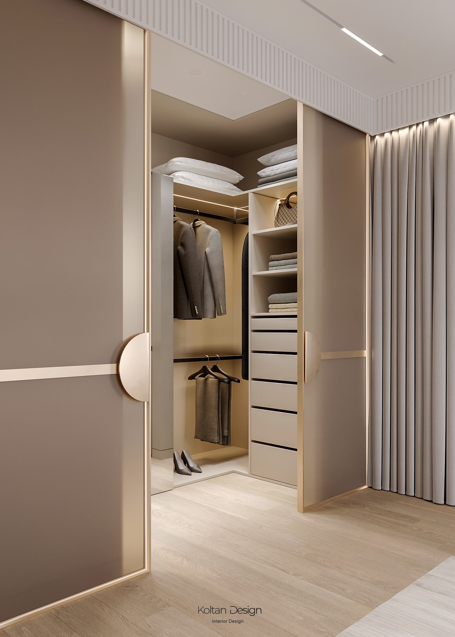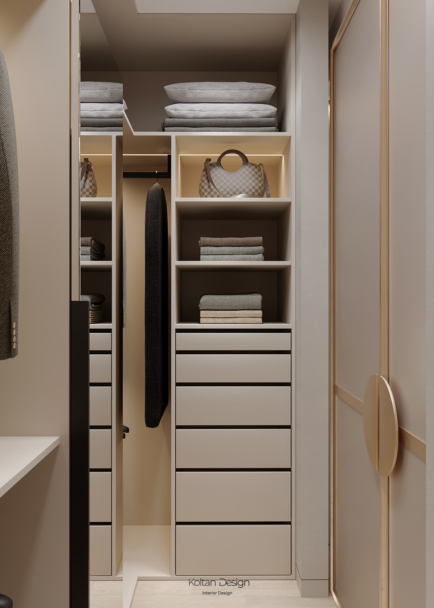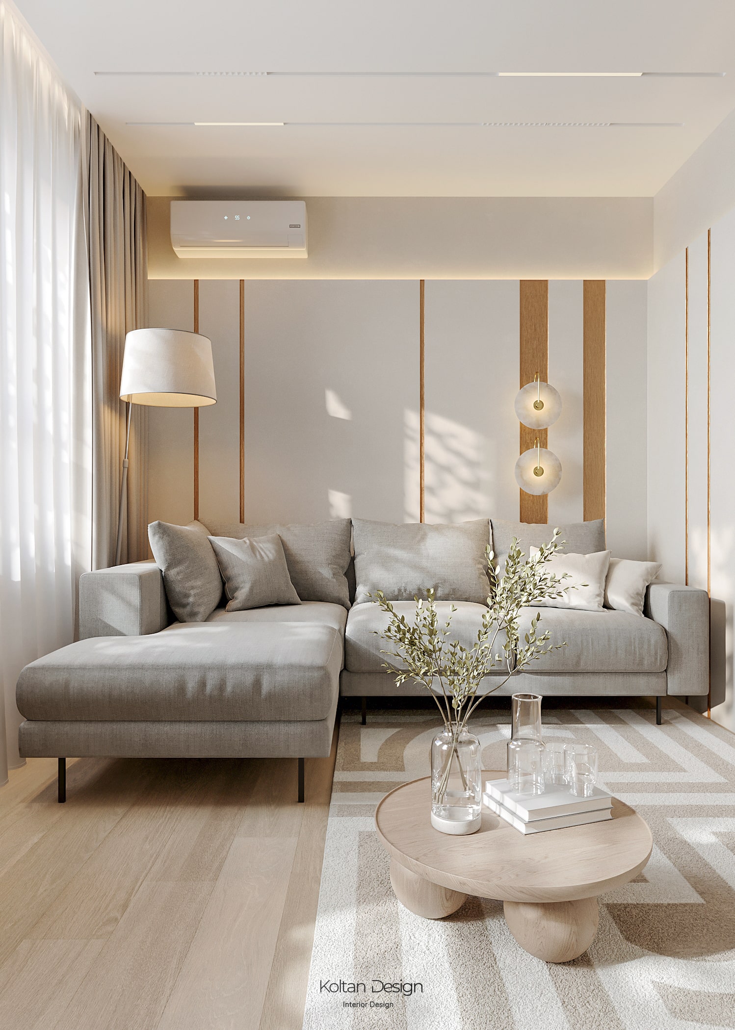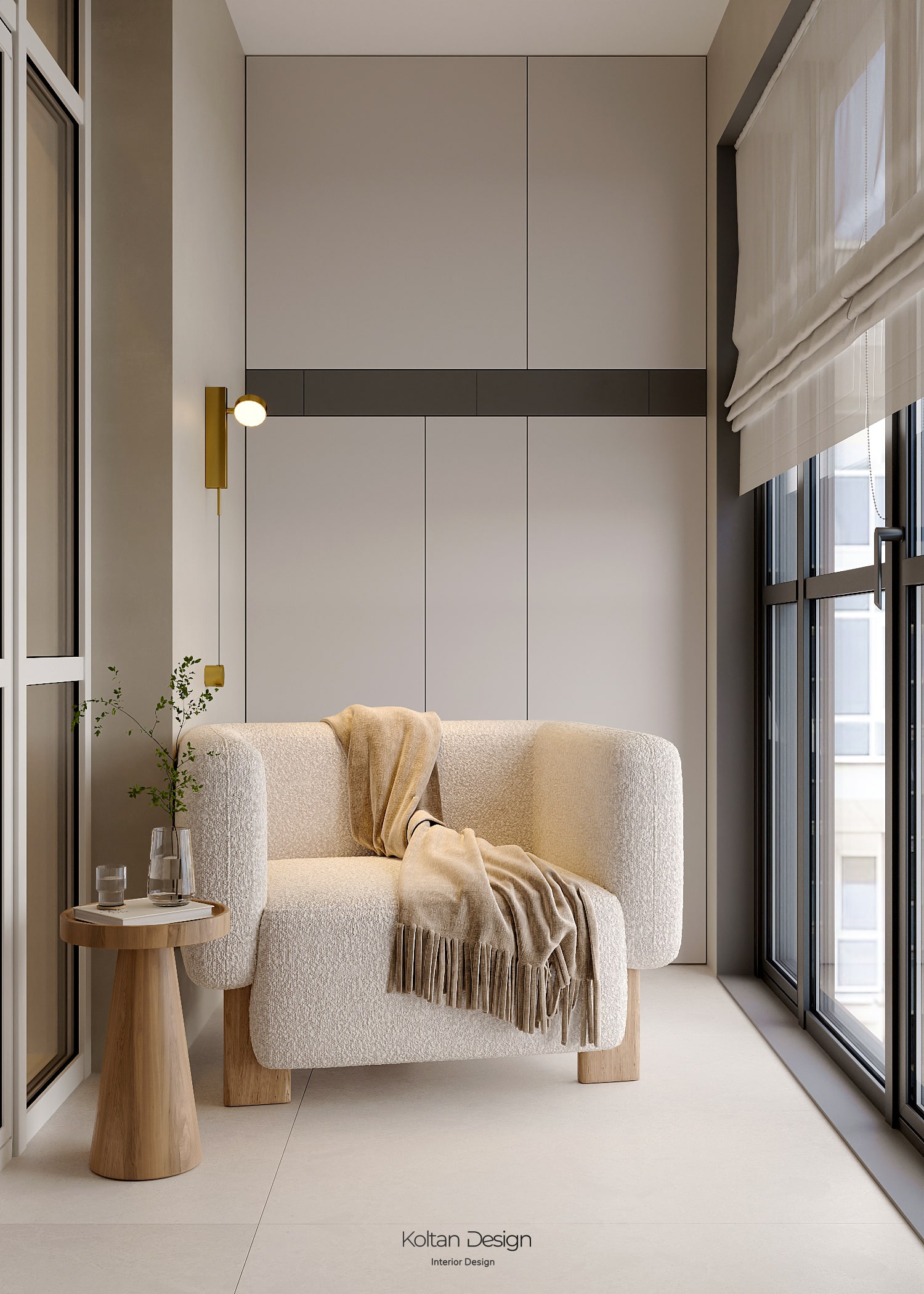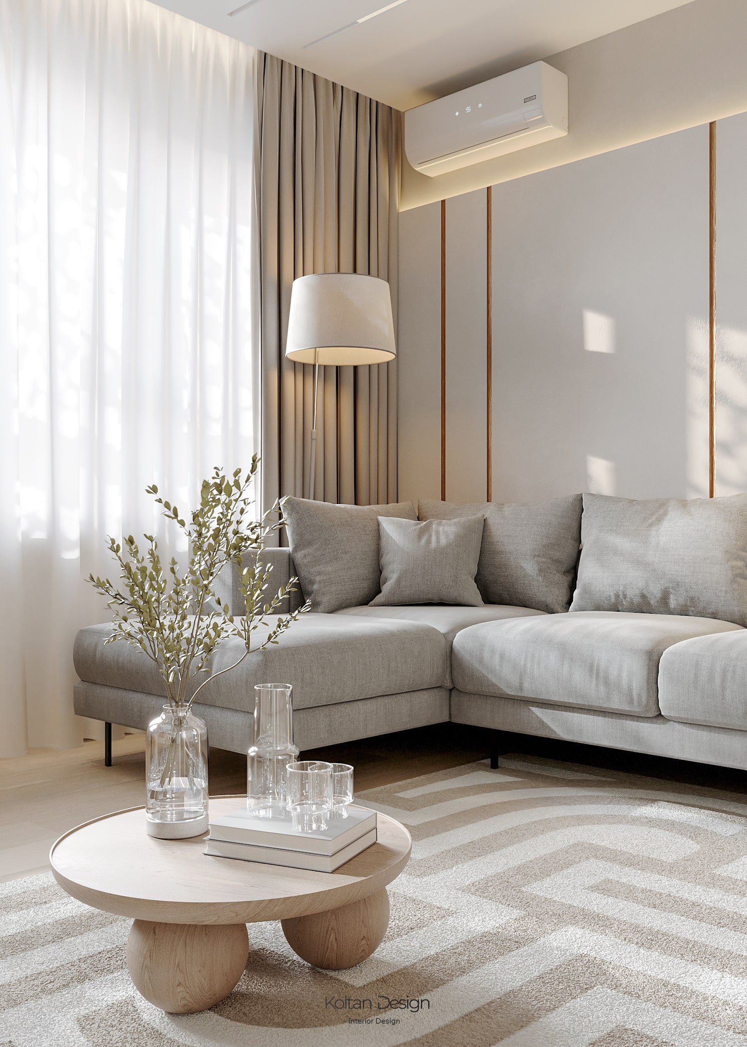 Интерьер выдержан в светлых, теплых оттенках, что придает помещению легкость и визуальную гармонию. Стены окрашены в нейтральные цвета, а элементы из натурального дерева, такие как мебель и акценты, привносят чувство уюта и связи с природой. Здесь нет ярких контрастов, а плавные линии создают атмосферу спокойствия и порядка. Отсутствие темных фурнитурных деталей подчеркивает минималистичный подход, фокусируясь на естественности и простоте. Мебель во всех комнатах продумана до мелочей — она не только современная, но и максимально удобная в уходе, не требующая много усилий для поддержания порядка.