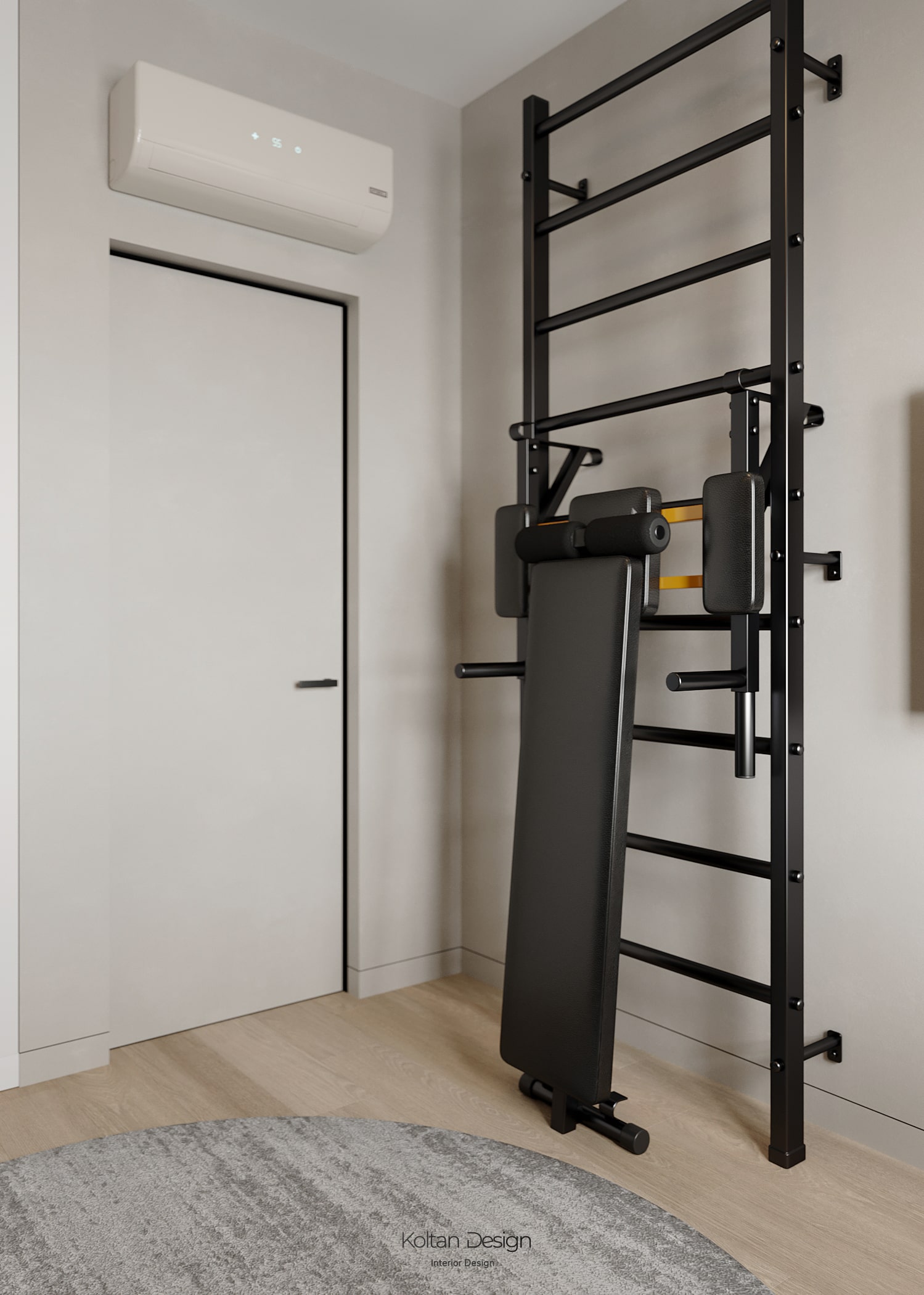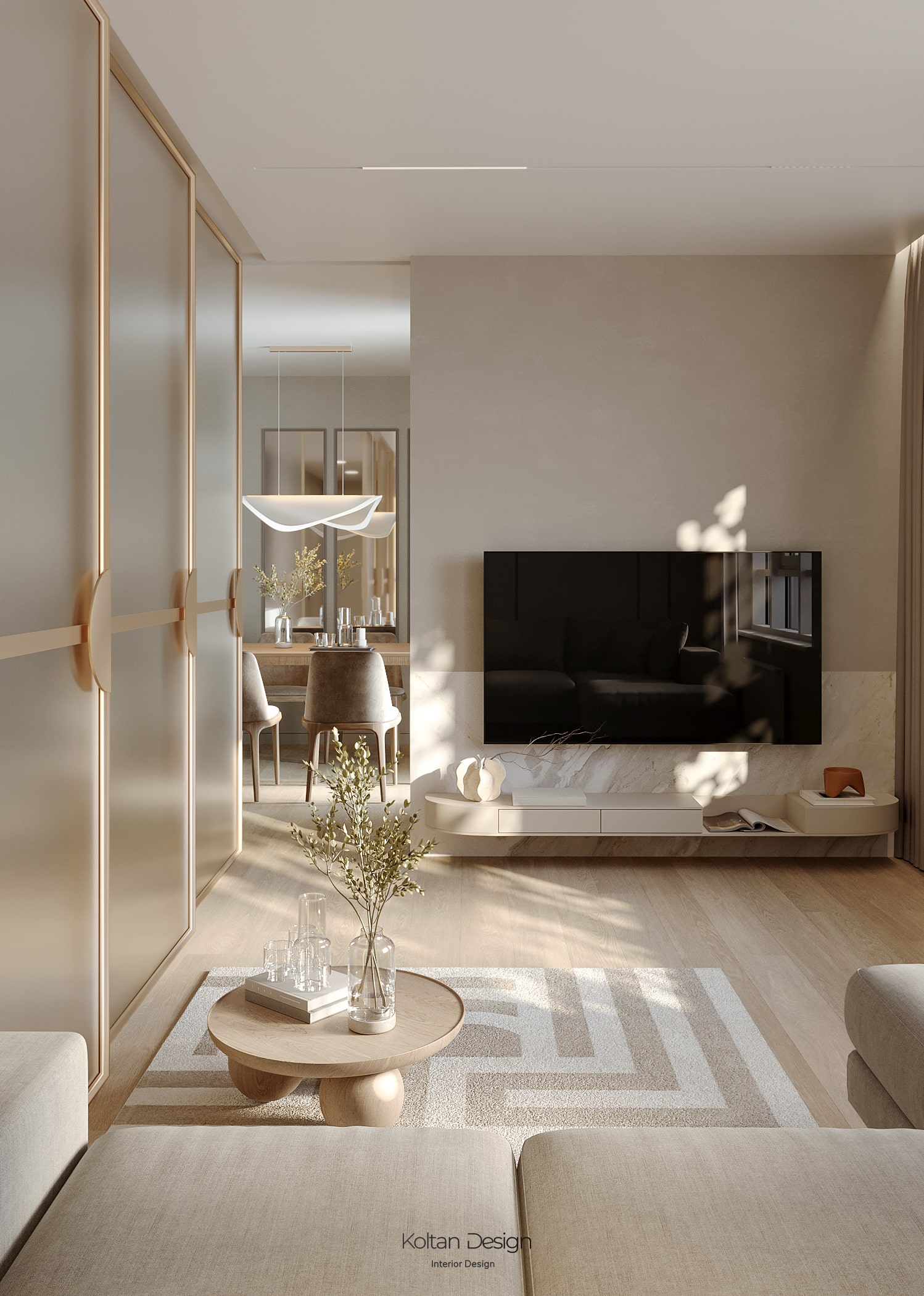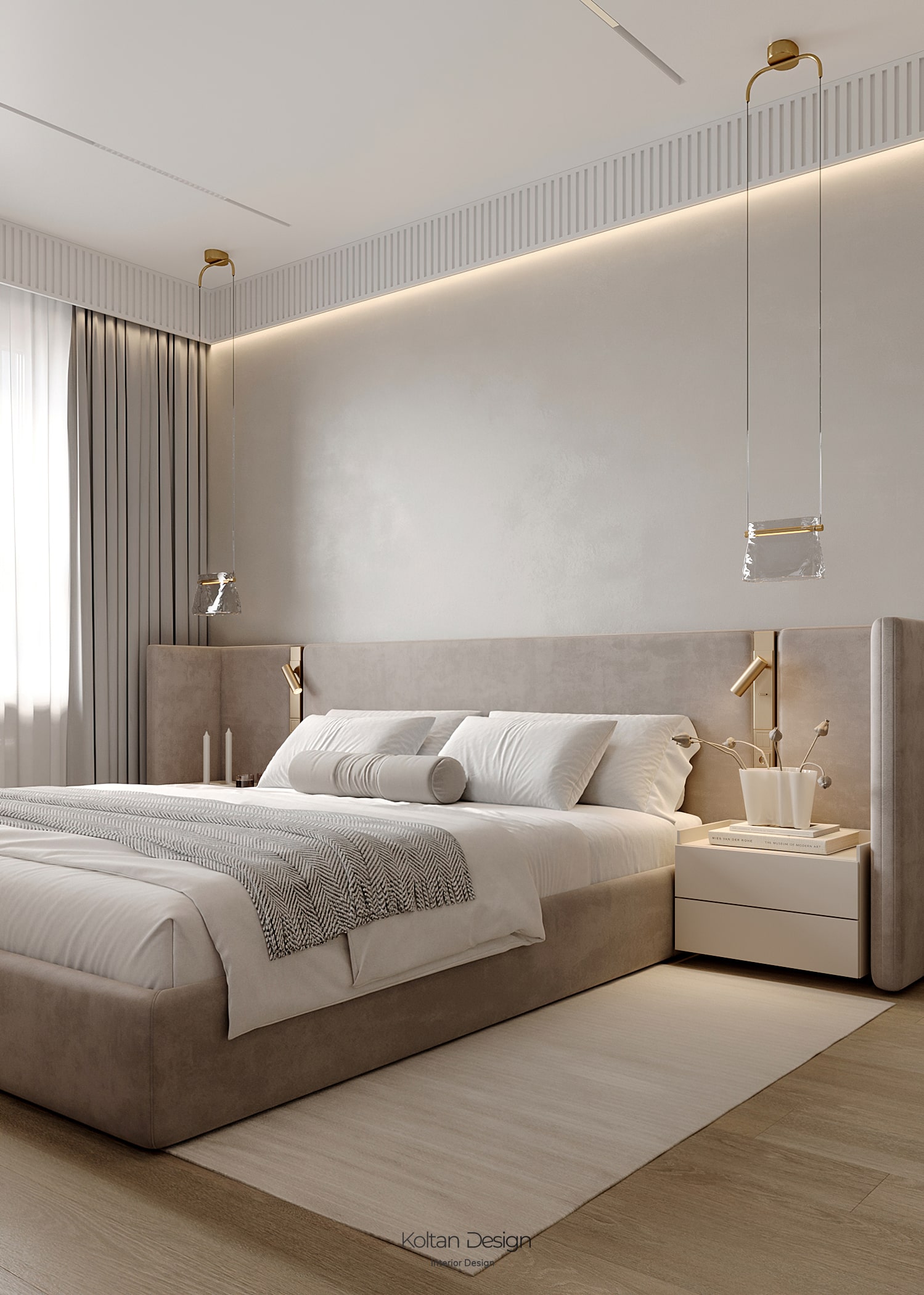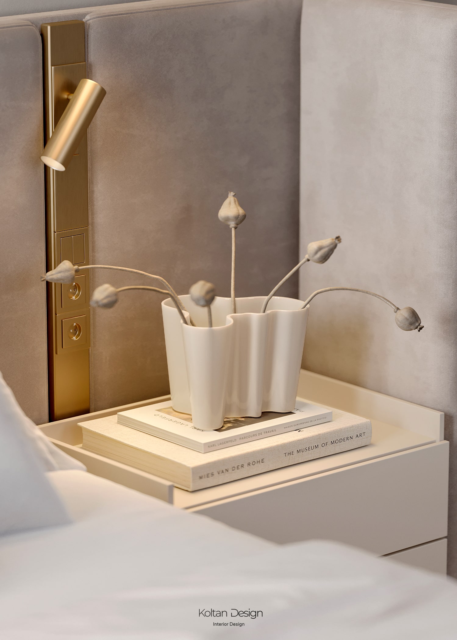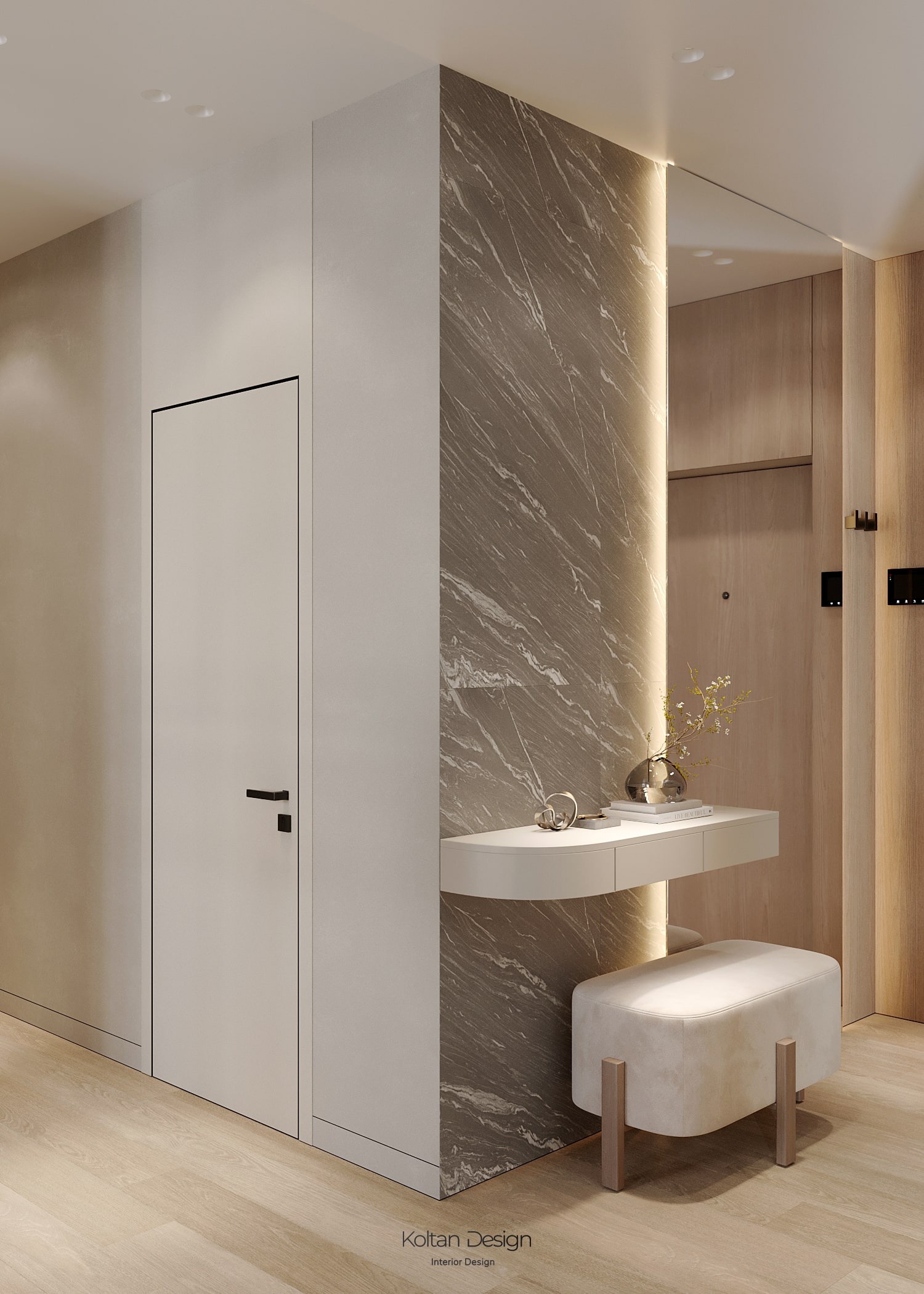 Интерьер выдержан в светлых, теплых оттенках, что придает помещению легкость и визуальную гармонию. Стены окрашены в нейтральные цвета, а элементы из натурального дерева, такие как мебель и акценты, привносят чувство уюта и связи с природой. Здесь нет ярких контрастов, а плавные линии создают атмосферу спокойствия и порядка. Отсутствие темных фурнитурных деталей подчеркивает минималистичный подход, фокусируясь на естественности и простоте. Мебель во всех комнатах продумана до мелочей — она не только современная, но и максимально удобная в уходе, не требующая много усилий для поддержания порядка.