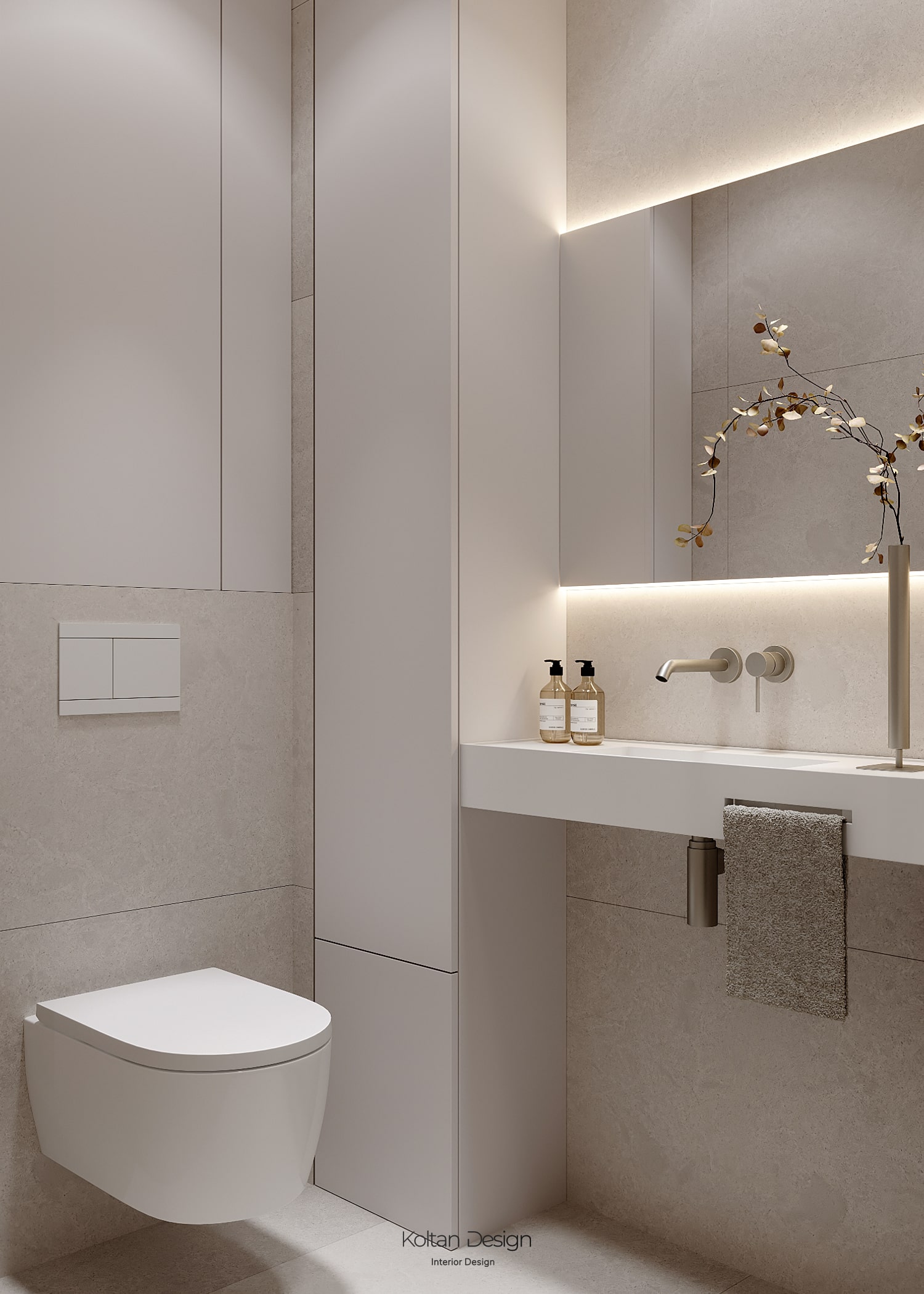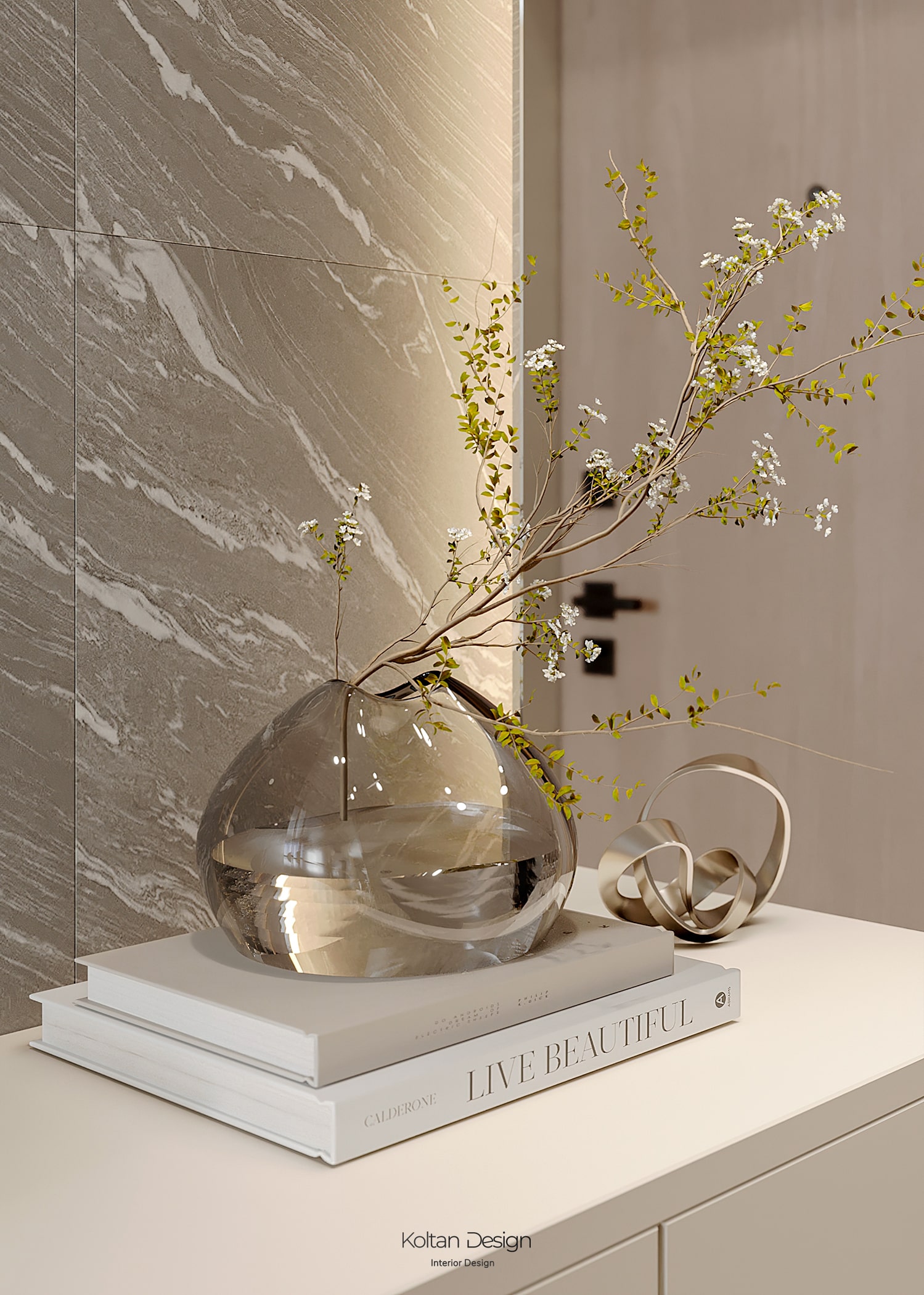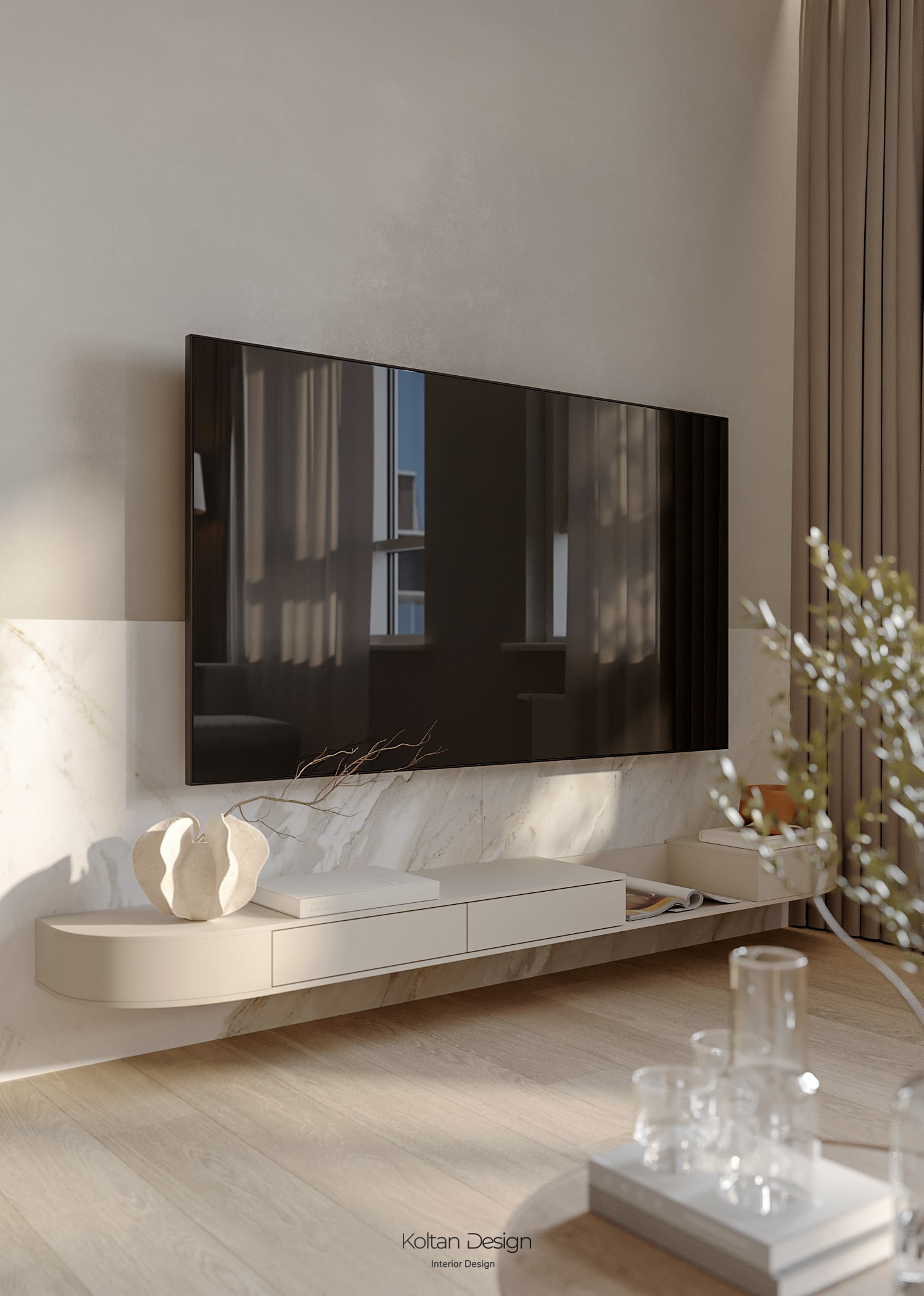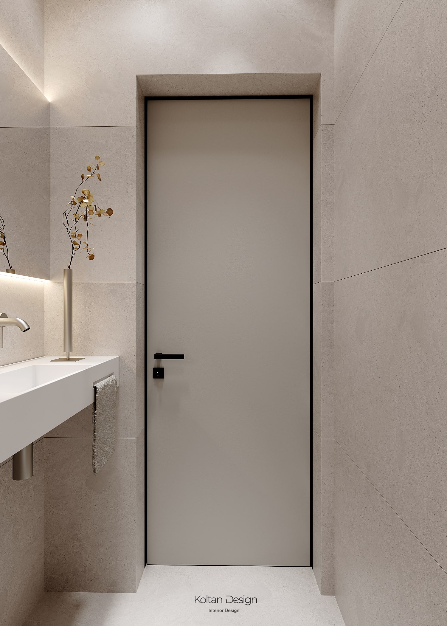 Интерьер выдержан в светлых, теплых оттенках, что придает помещению легкость и визуальную гармонию. Стены окрашены в нейтральные цвета, а элементы из натурального дерева, такие как мебель и акценты, привносят чувство уюта и связи с природой. Здесь нет ярких контрастов, а плавные линии создают атмосферу спокойствия и порядка. Отсутствие темных фурнитурных деталей подчеркивает минималистичный подход, фокусируясь на естественности и простоте. Мебель во всех комнатах продумана до мелочей — она не только современная, но и максимально удобная в уходе, не требующая много усилий для поддержания порядка.