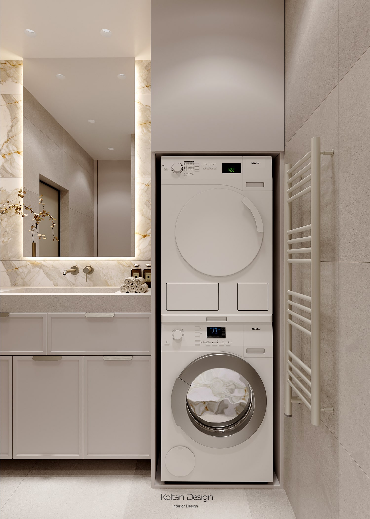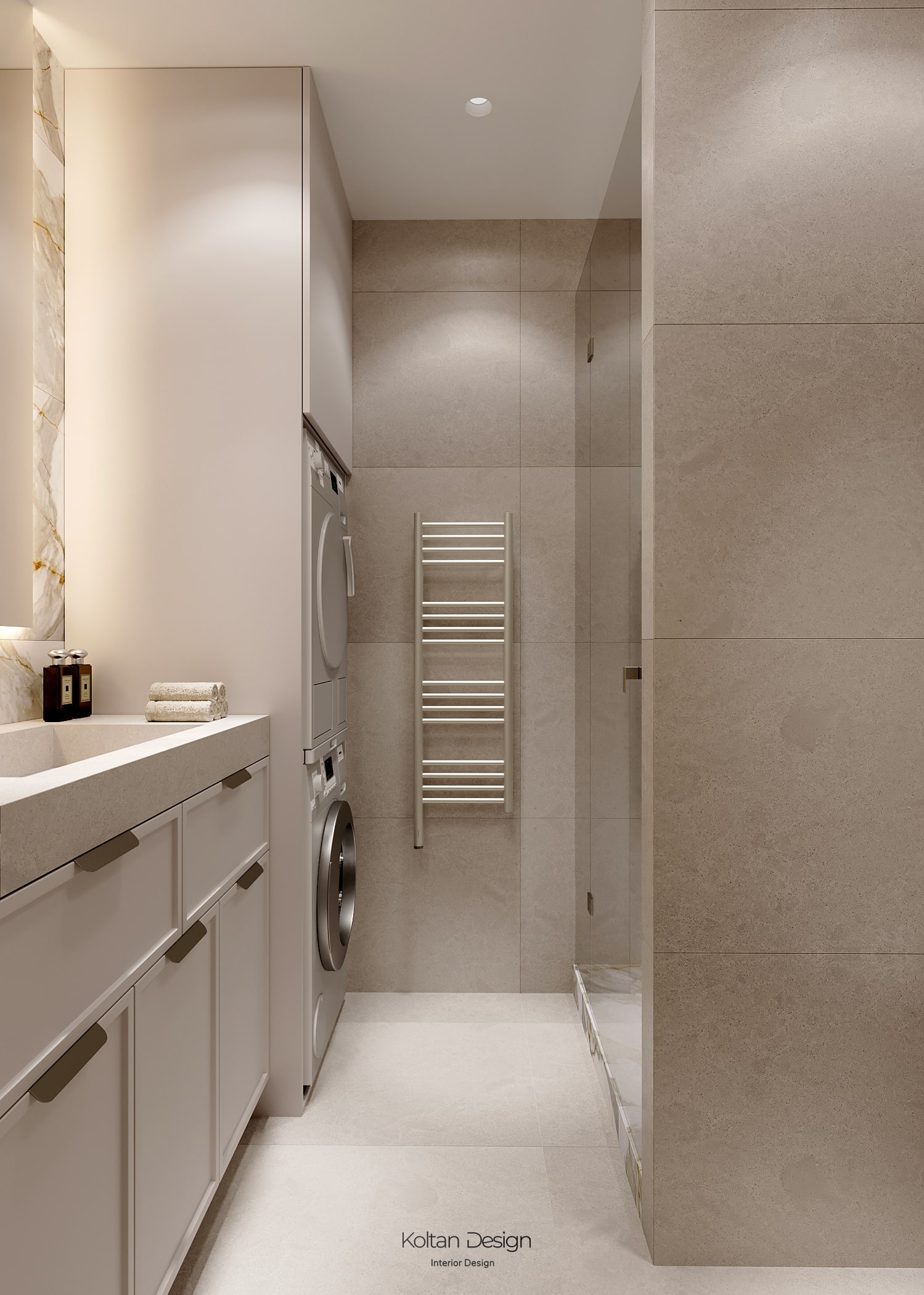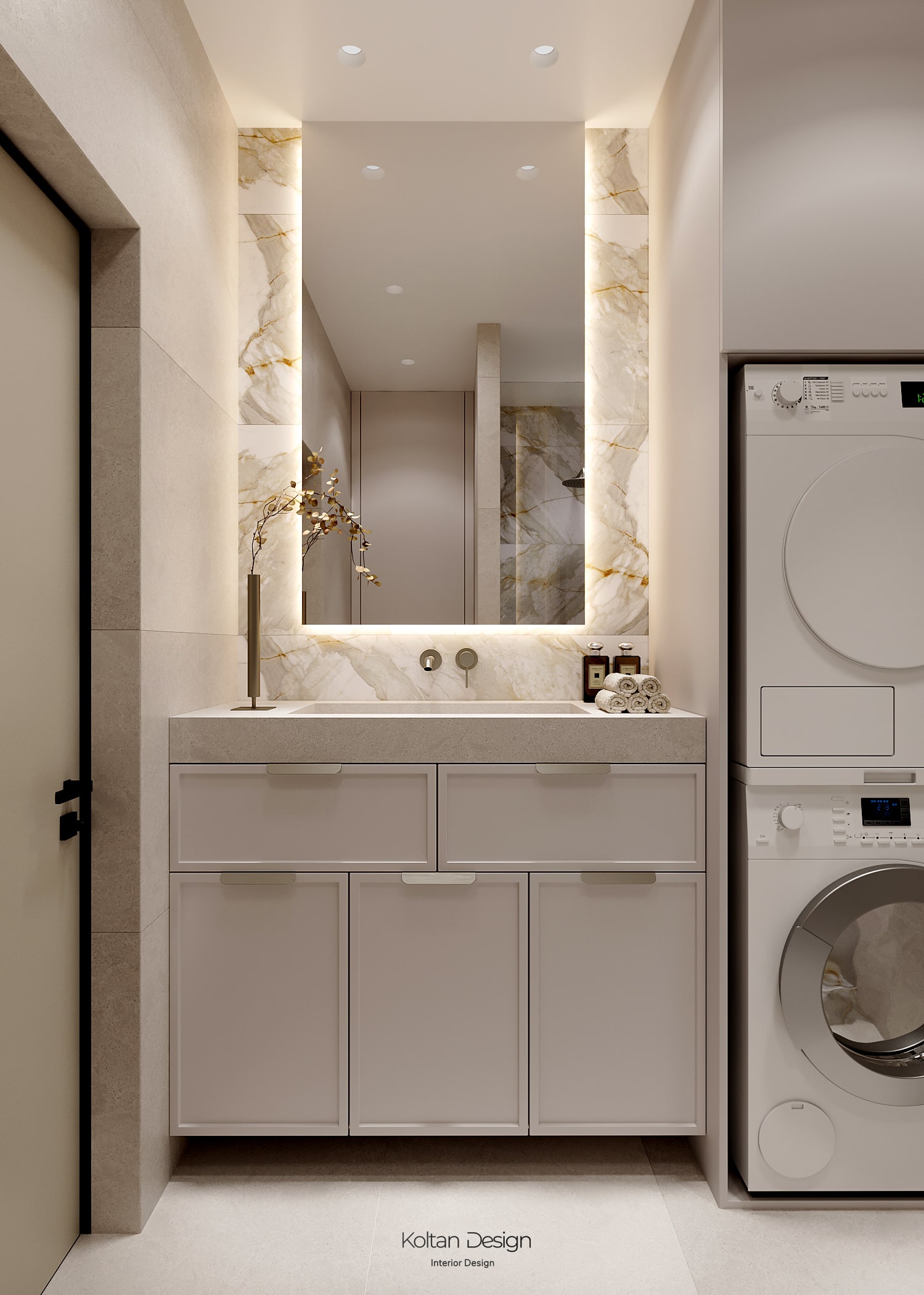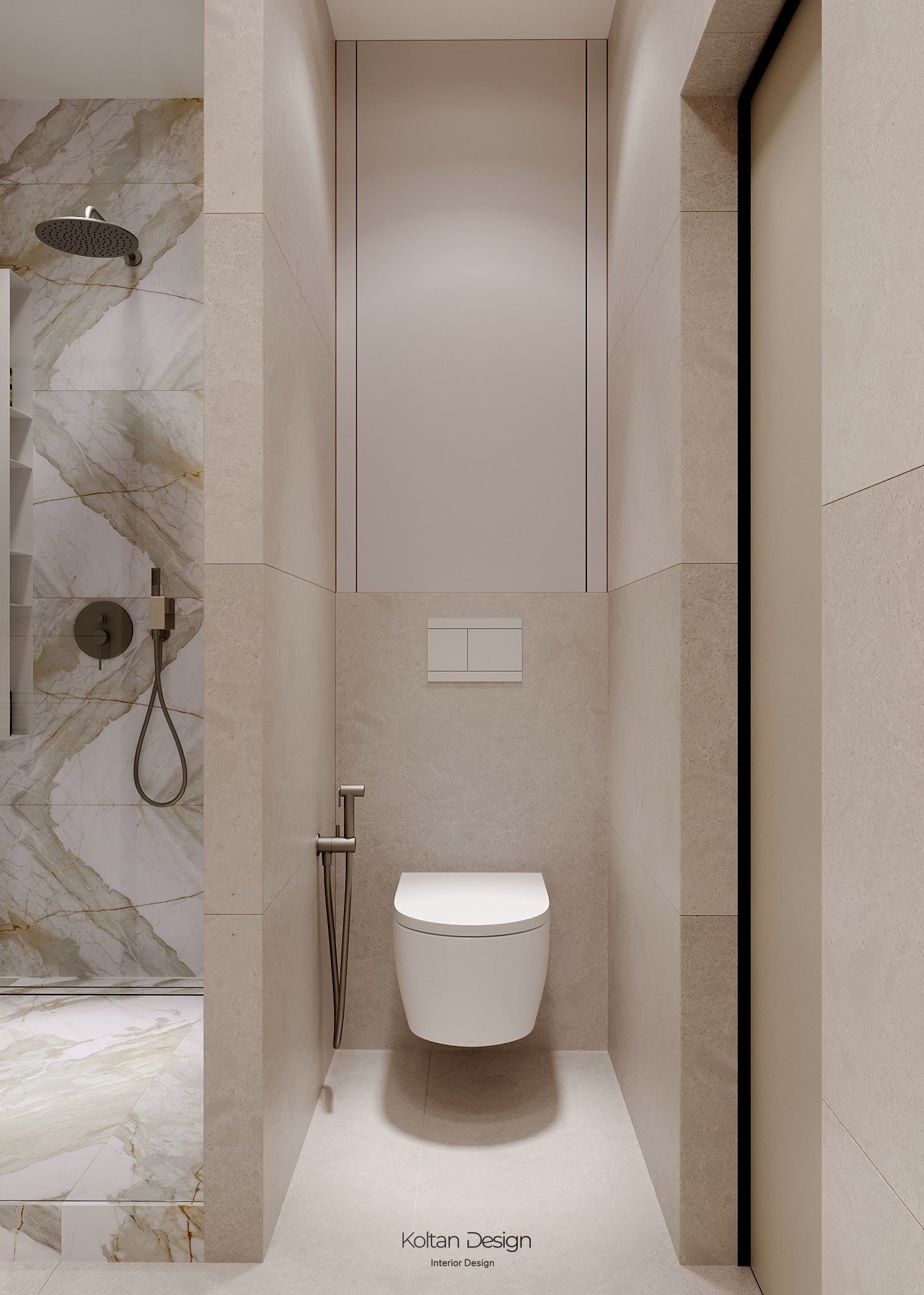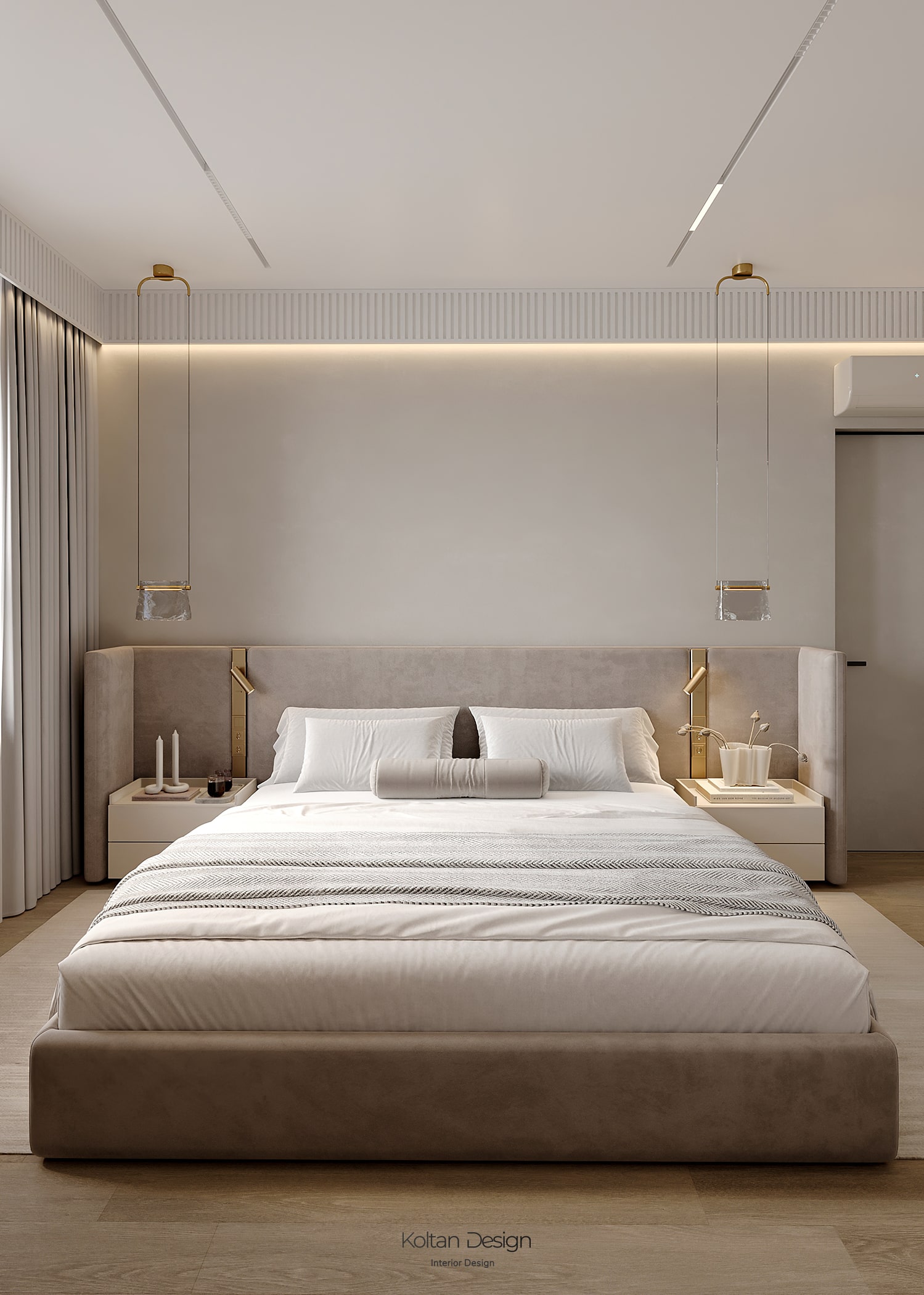 Интерьер выдержан в светлых, теплых оттенках, что придает помещению легкость и визуальную гармонию. Стены окрашены в нейтральные цвета, а элементы из натурального дерева, такие как мебель и акценты, привносят чувство уюта и связи с природой. Здесь нет ярких контрастов, а плавные линии создают атмосферу спокойствия и порядка. Отсутствие темных фурнитурных деталей подчеркивает минималистичный подход, фокусируясь на естественности и простоте. Мебель во всех комнатах продумана до мелочей — она не только современная, но и максимально удобная в уходе, не требующая много усилий для поддержания порядка.