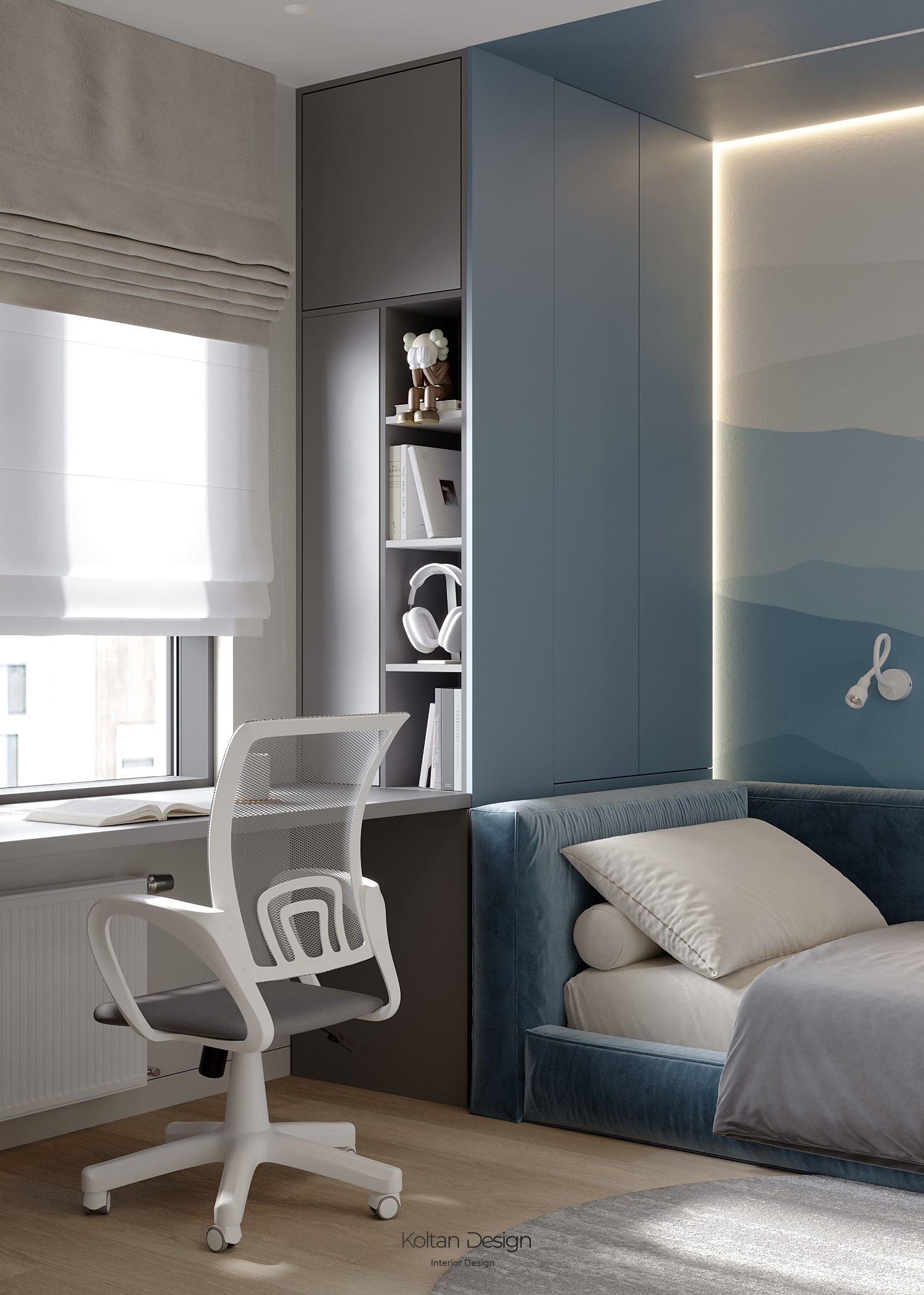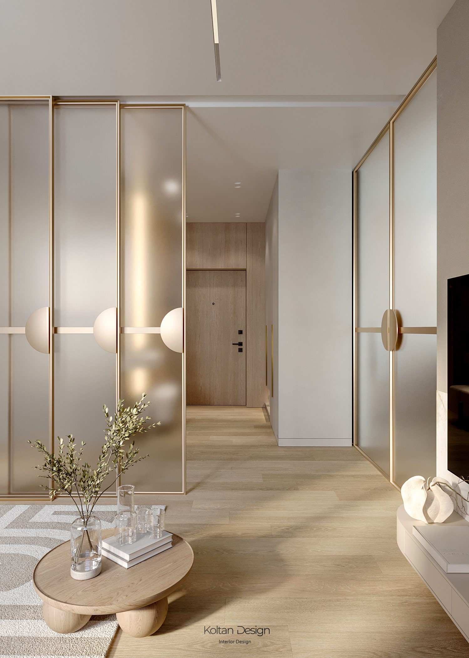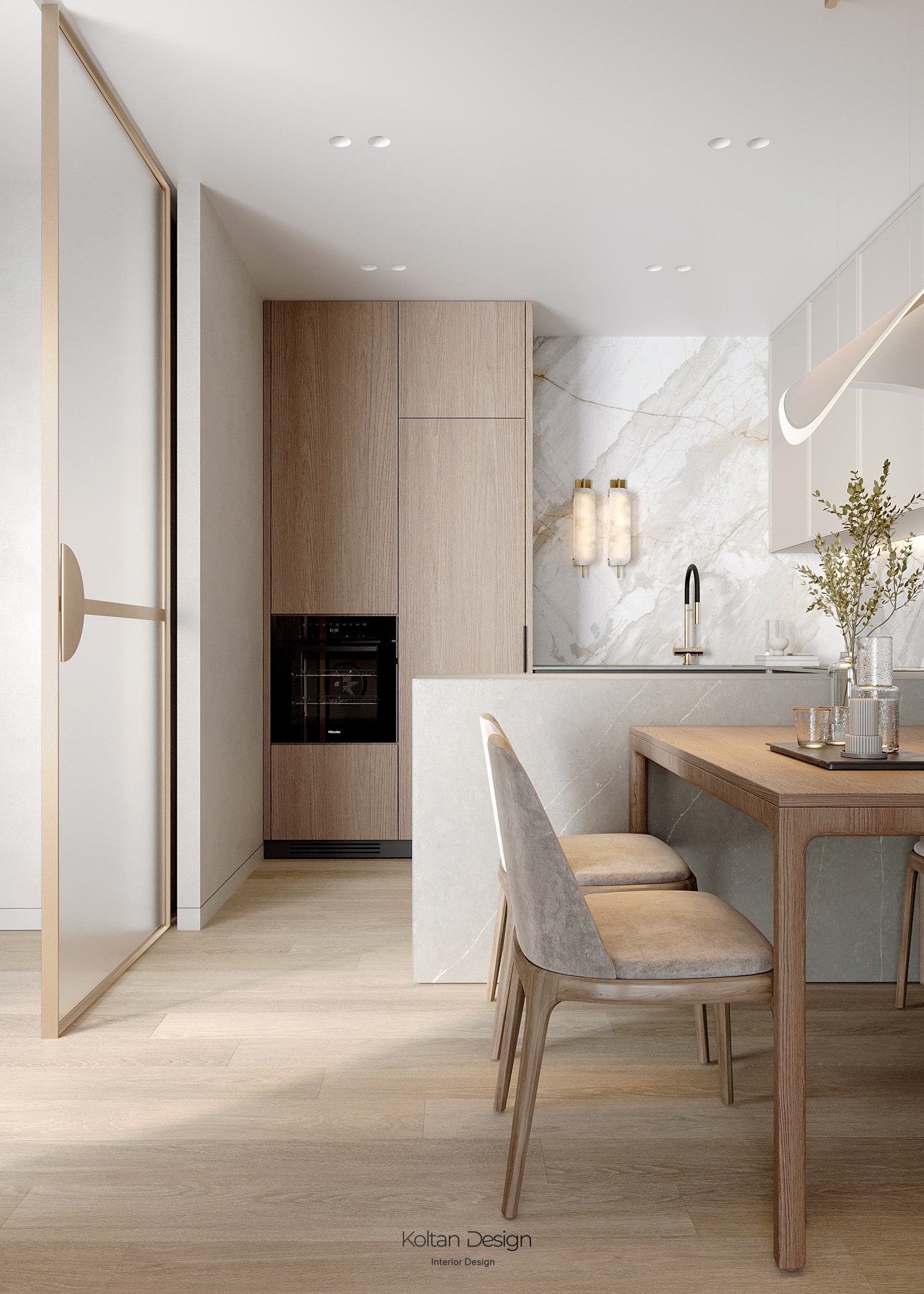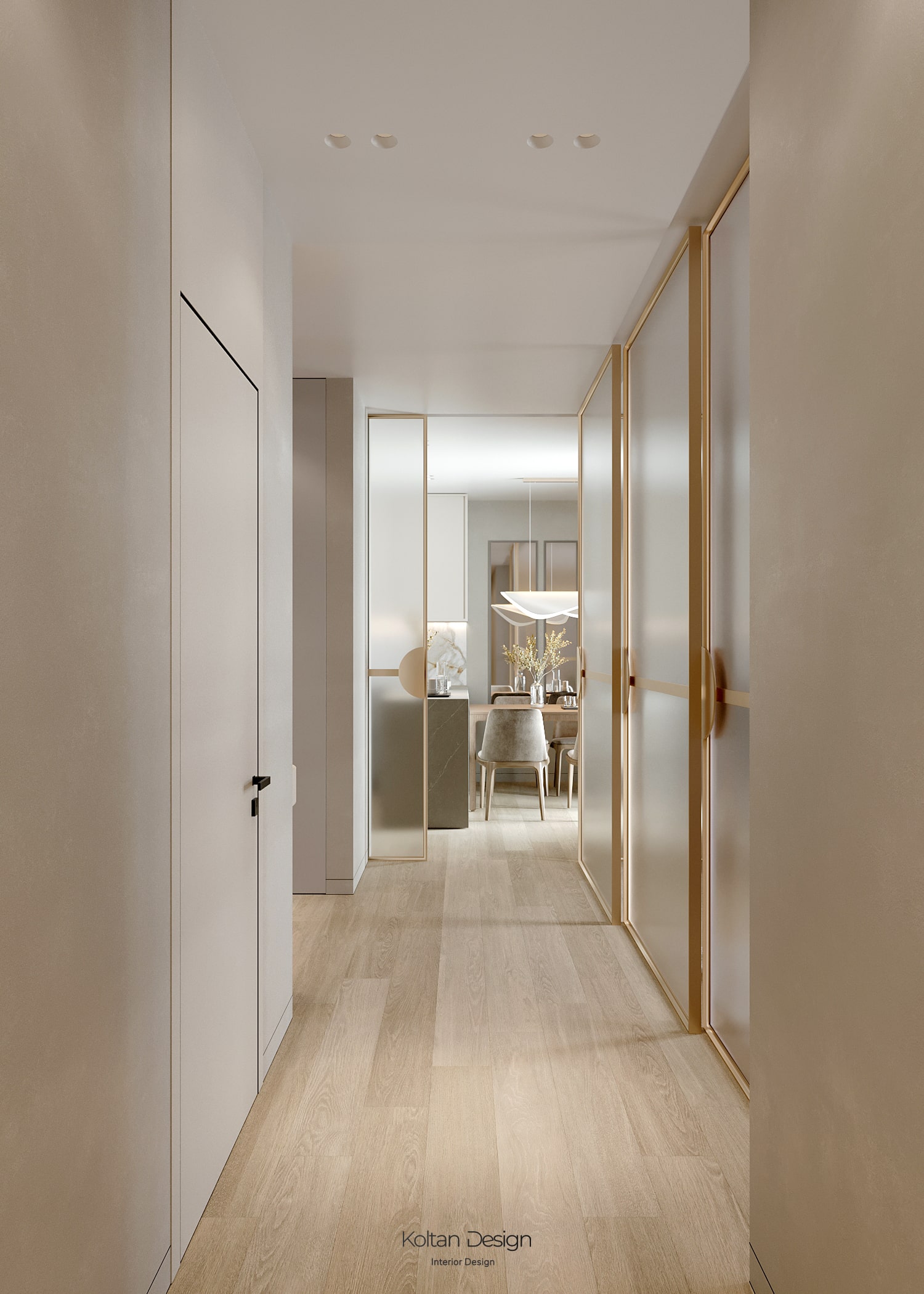Квартира для семейной пары с подростком продумана так, чтобы каждый уголок был удобен и функционален. Особое внимание уделено созданию гибкости пространства: кухня и гостиная могут быть изолированы друг от друга с помощью стильной перегородки, что позволяет адаптировать пространство под различные нужды семьи — от уютных ужинов до спокойного отдыха.
