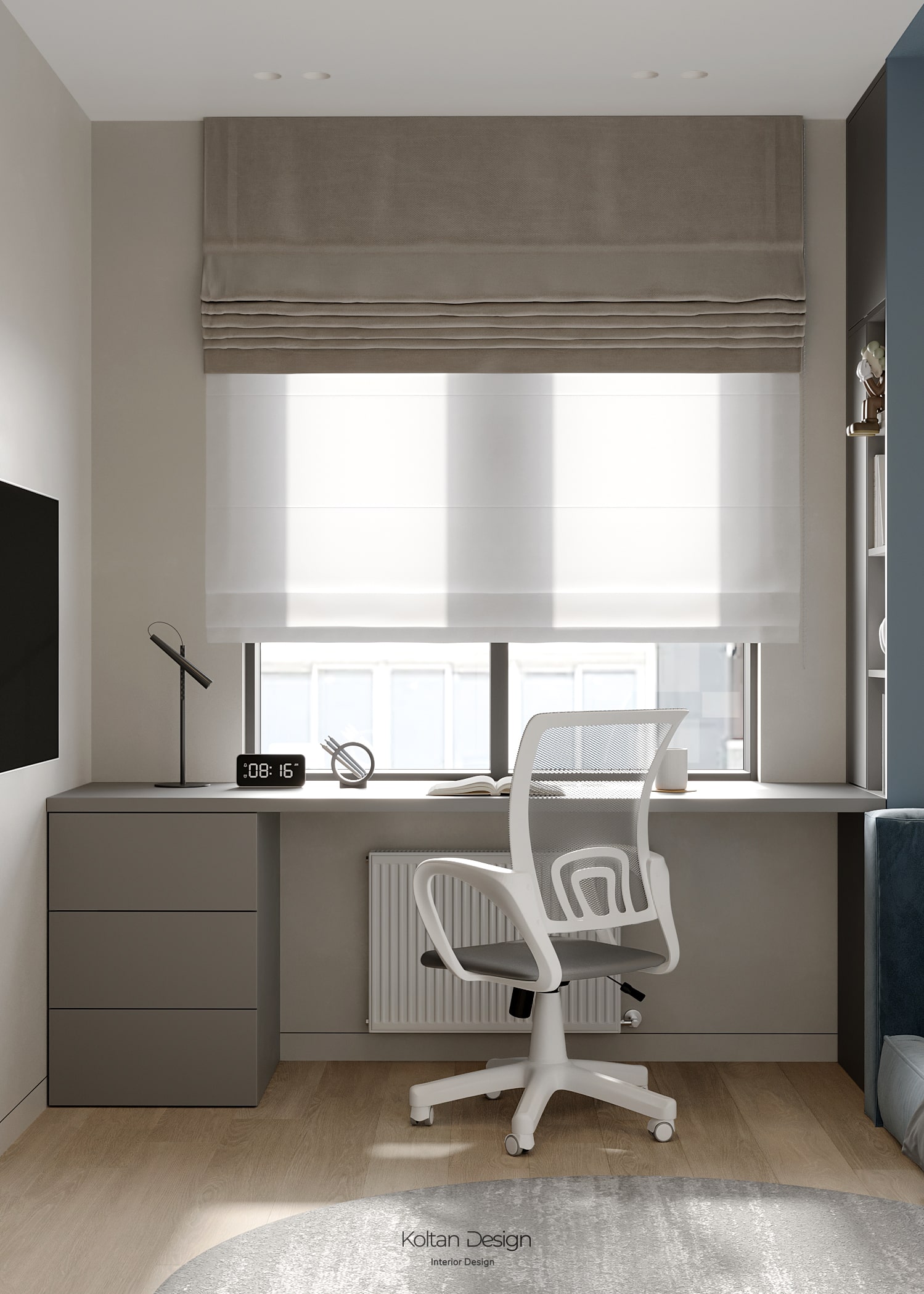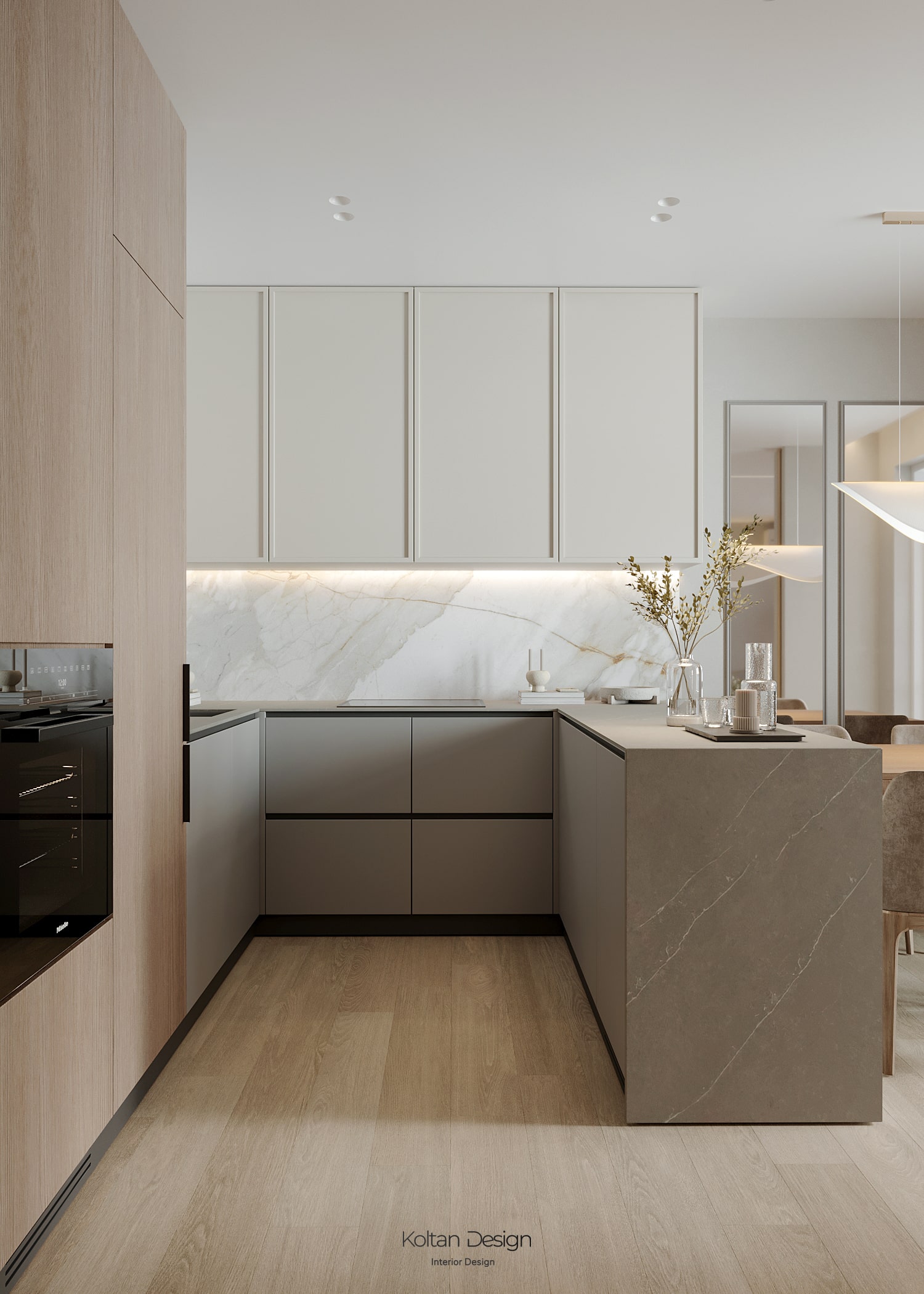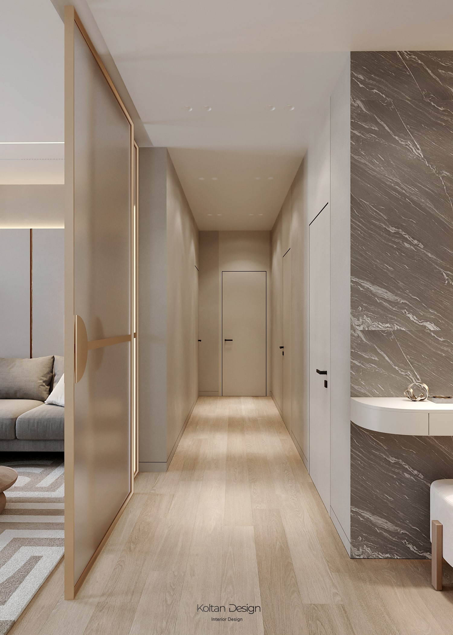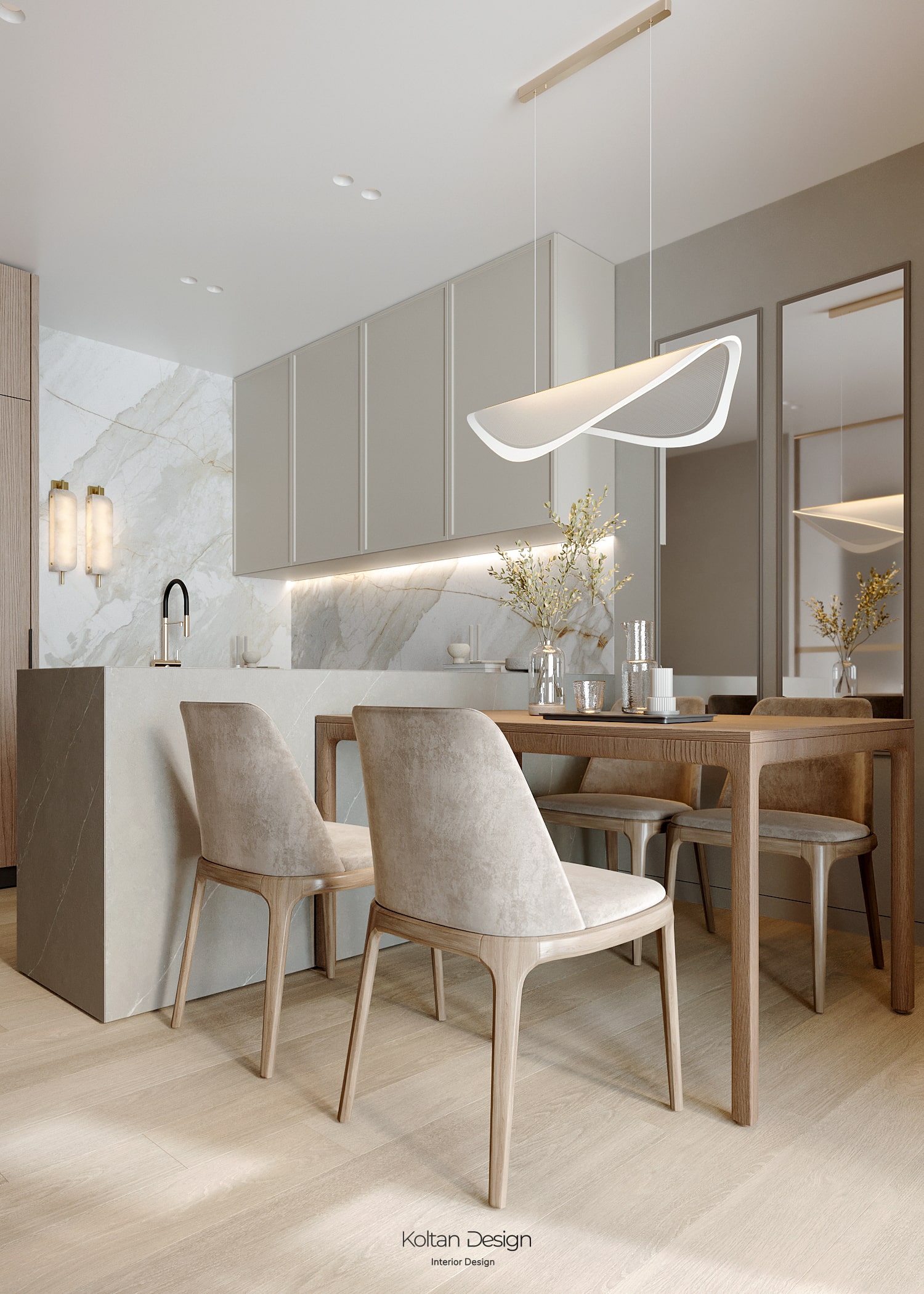 Квартира для семейной пары с подростком продумана так, чтобы каждый уголок был удобен и функционален. Особое внимание уделено созданию гибкости пространства: кухня и гостиная могут быть изолированы друг от друга с помощью стильной перегородки, что позволяет адаптировать пространство под различные нужды семьи — от уютных ужинов до спокойного отдыха.