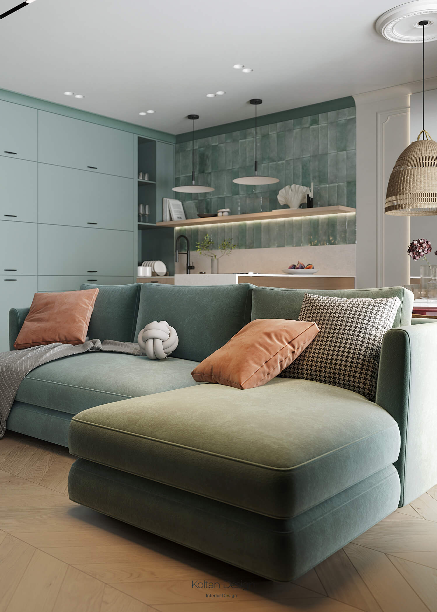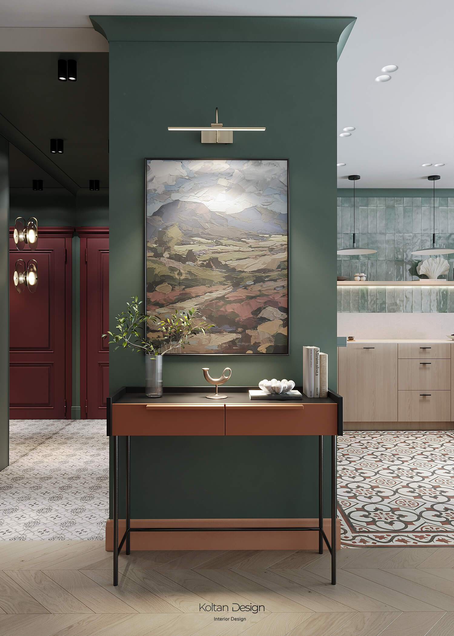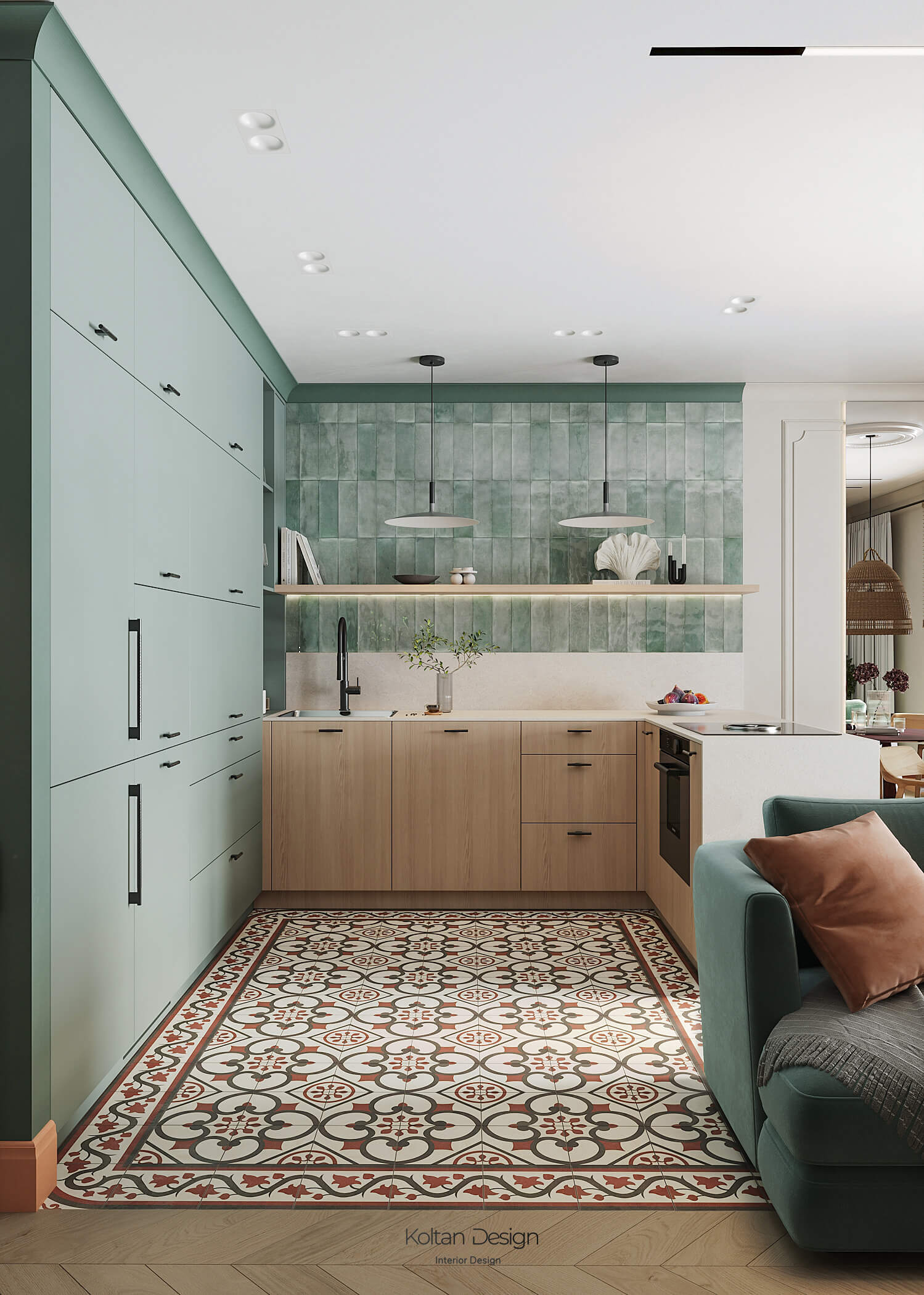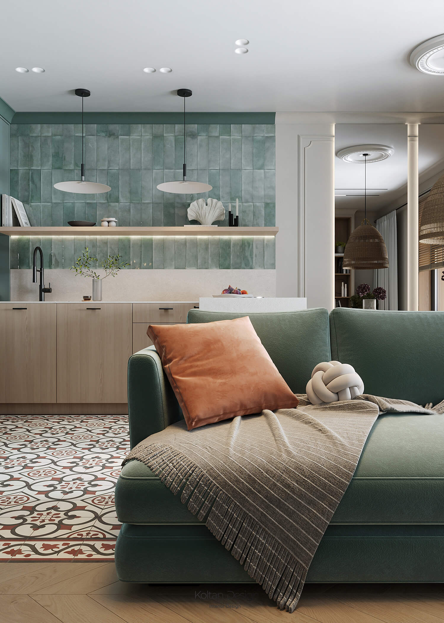 Эта квартира — идеальный дом для смелой и неординарной семьи, которая не боится ярких акцентов и сочетания насыщенных цветов. В зоне гостиной, объединенной с П-образной кухней и обеденной зоной, создано пространство, которое отлично сочетает функциональность и эстетику. На кухне сформирована стене с пеналами, где встроена вся техника, а за подъемными фасады организована скрытая столешница, что позволяют сохранять чистоту и порядок, не нарушая визуальной гармонии кухни. Яркие и смелые цвета, акцентные элементы создают живую атмосферу, не перегружая пространство. Квартира сочетает элементы классики с современными решениями, что делает интерьер стильным, но при этом уютным и гармоничным.