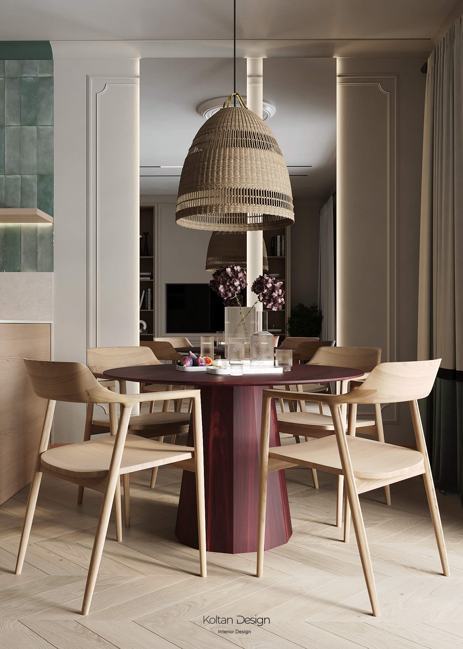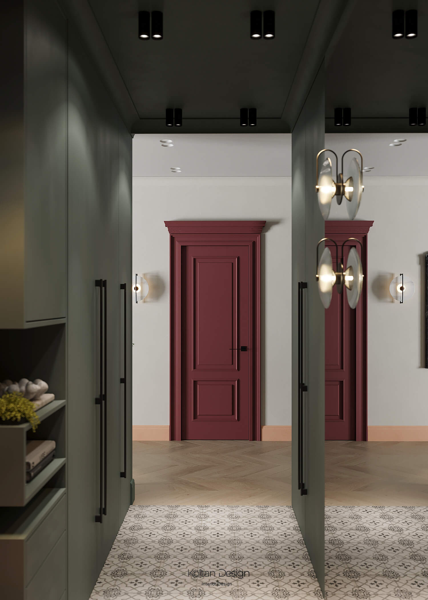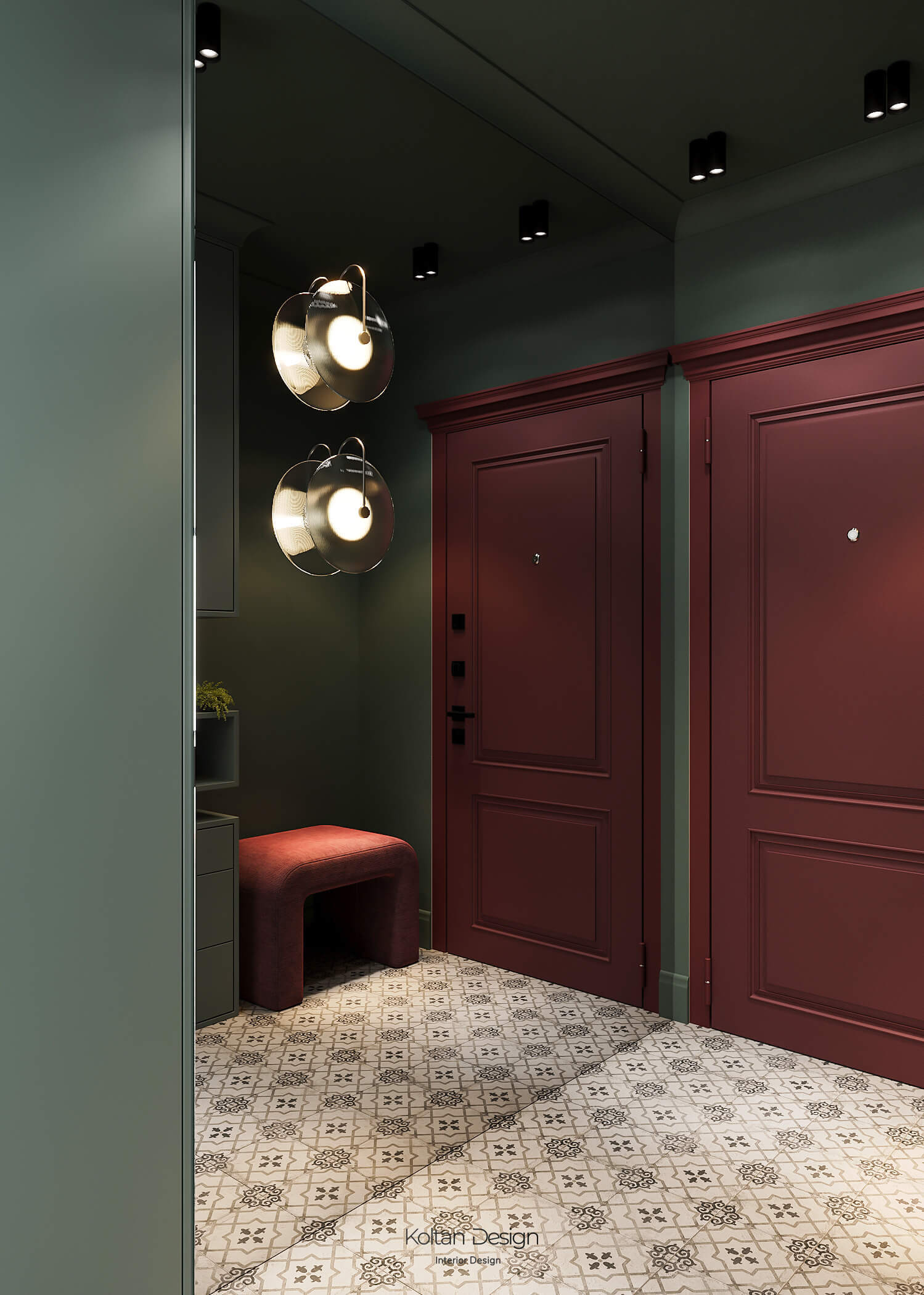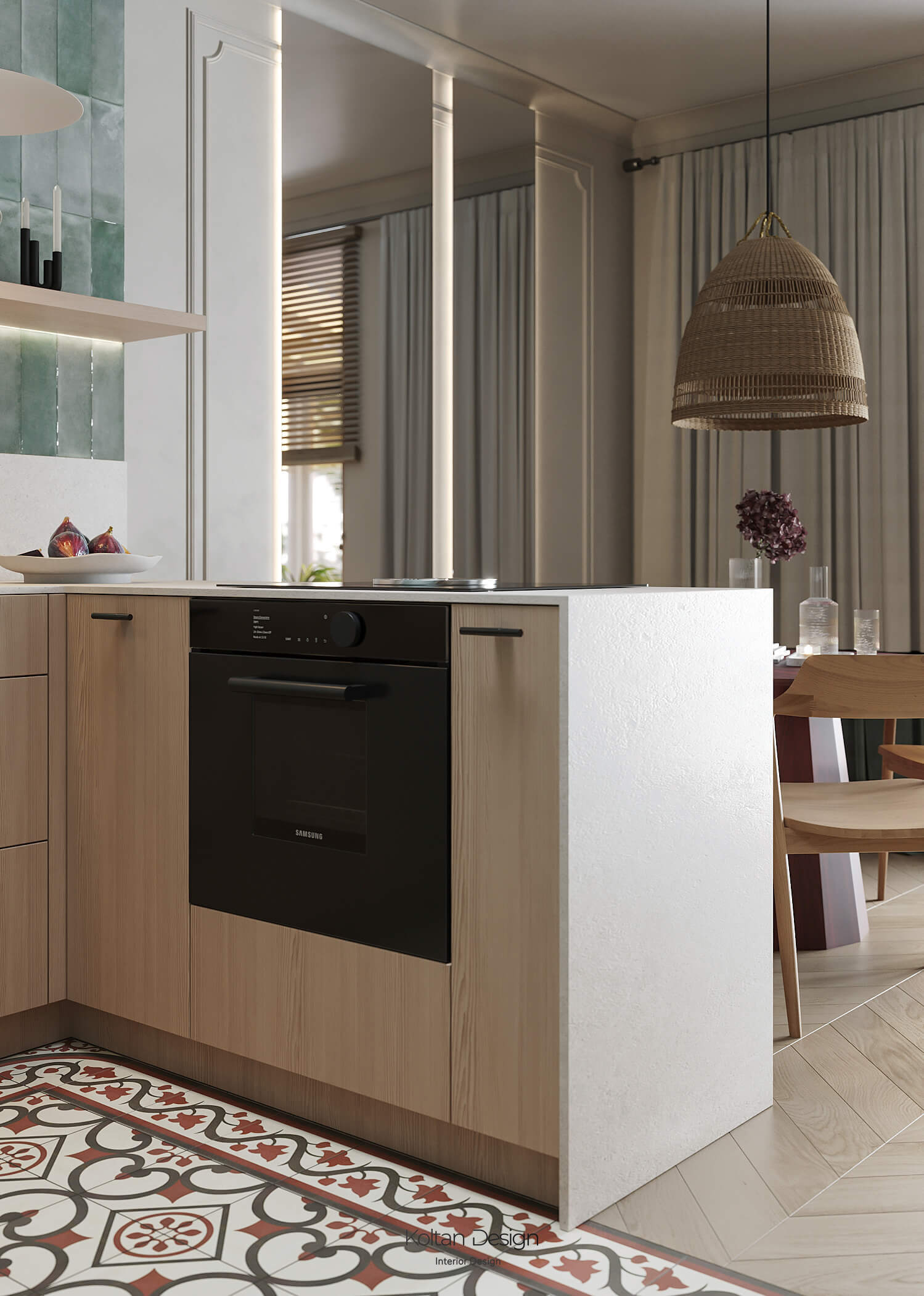 Эта квартира — идеальный дом для смелой и неординарной семьи, которая не боится ярких акцентов и сочетания насыщенных цветов. В зоне гостиной, объединенной с П-образной кухней и обеденной зоной, создано пространство, которое отлично сочетает функциональность и эстетику. На кухне сформирована стене с пеналами, где встроена вся техника, а за подъемными фасады организована скрытая столешница, что позволяют сохранять чистоту и порядок, не нарушая визуальной гармонии кухни. Яркие и смелые цвета, акцентные элементы создают живую атмосферу, не перегружая пространство. Квартира сочетает элементы классики с современными решениями, что делает интерьер стильным, но при этом уютным и гармоничным.
