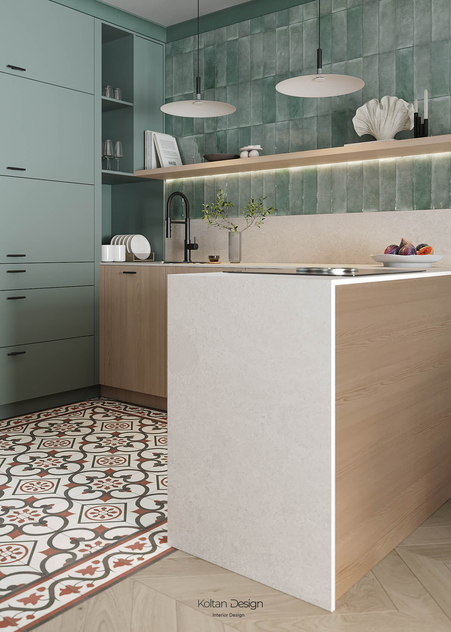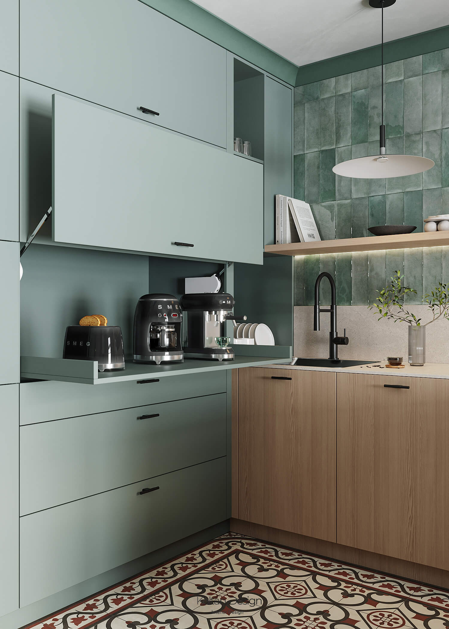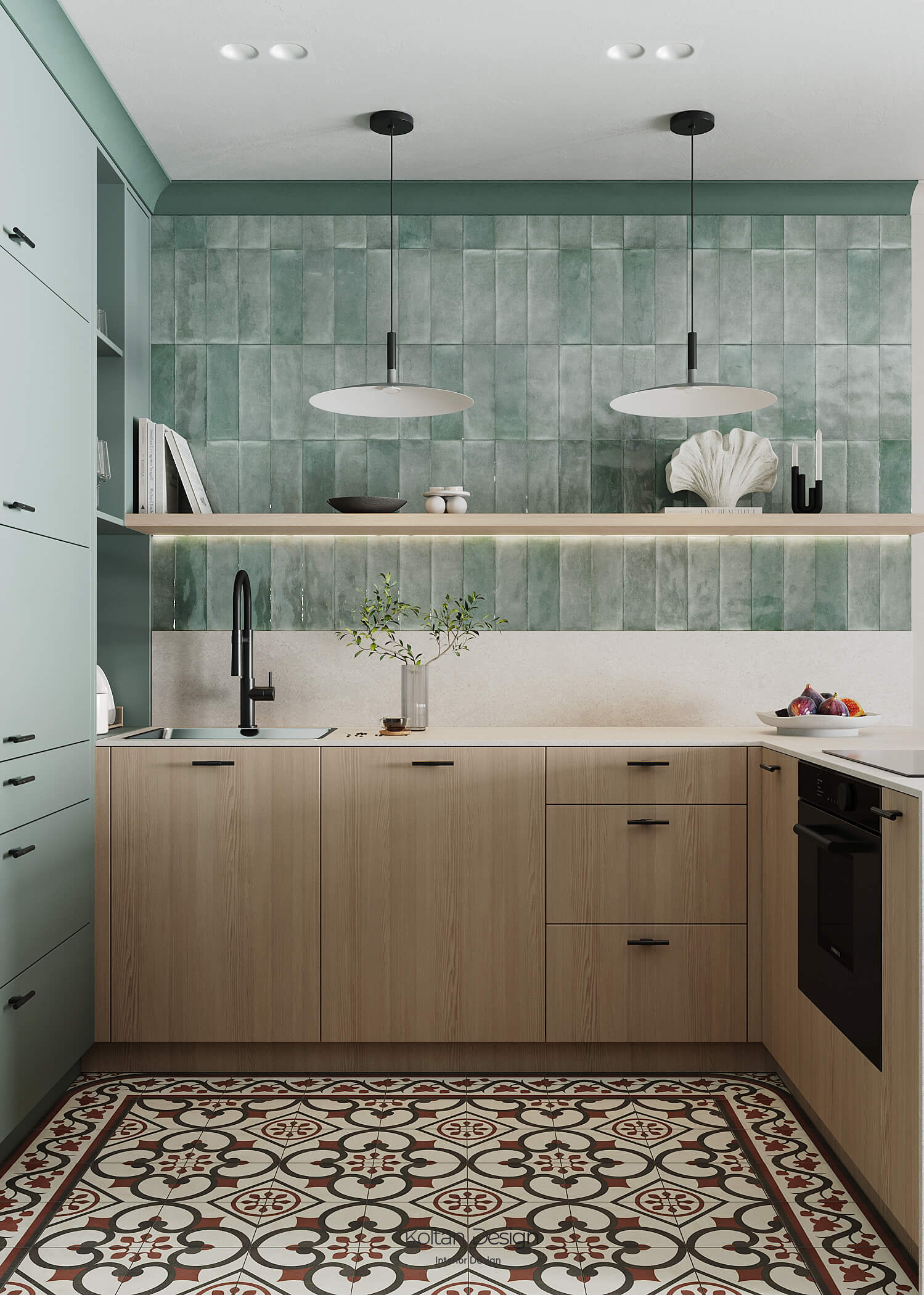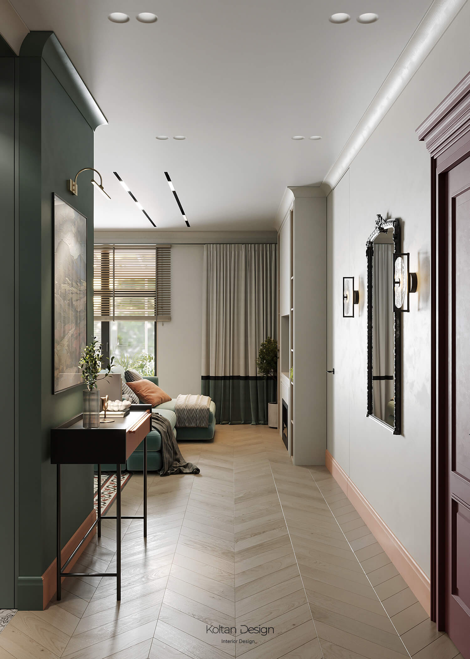 Эта квартира — идеальный дом для смелой и неординарной семьи, которая не боится ярких акцентов и сочетания насыщенных цветов. В зоне гостиной, объединенной с П-образной кухней и обеденной зоной, создано пространство, которое отлично сочетает функциональность и эстетику. На кухне сформирована стене с пеналами, где встроена вся техника, а за подъемными фасады организована скрытая столешница, что позволяют сохранять чистоту и порядок, не нарушая визуальной гармонии кухни. Яркие и смелые цвета, акцентные элементы создают живую атмосферу, не перегружая пространство. Квартира сочетает элементы классики с современными решениями, что делает интерьер стильным, но при этом уютным и гармоничным.