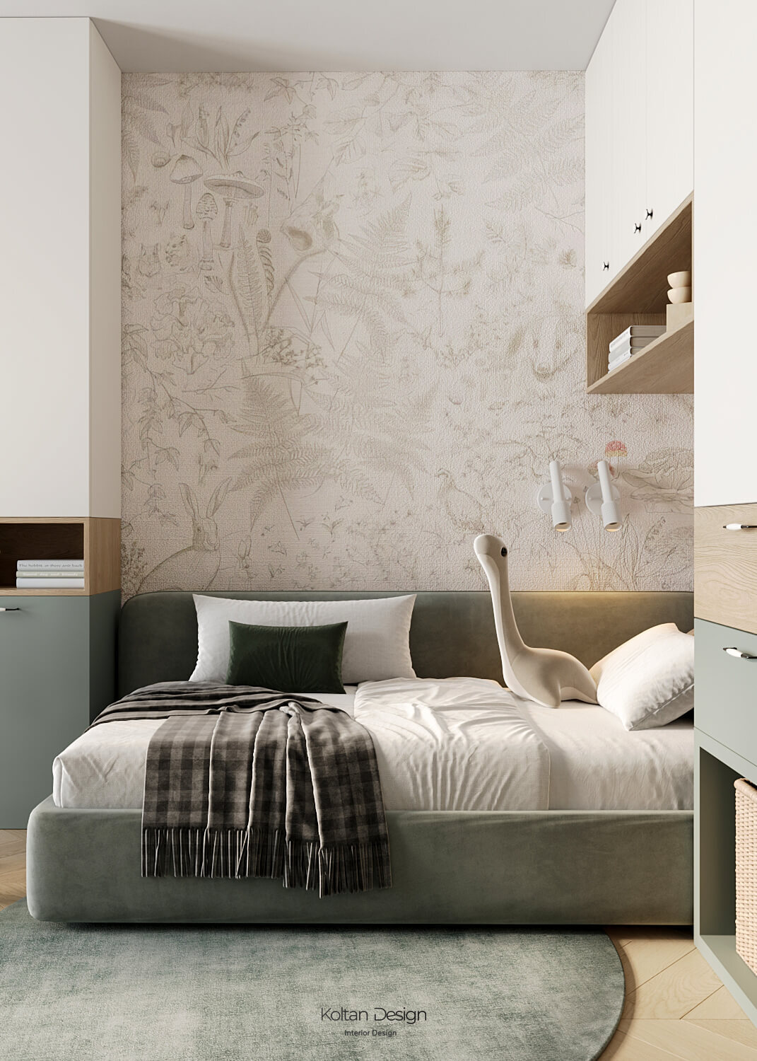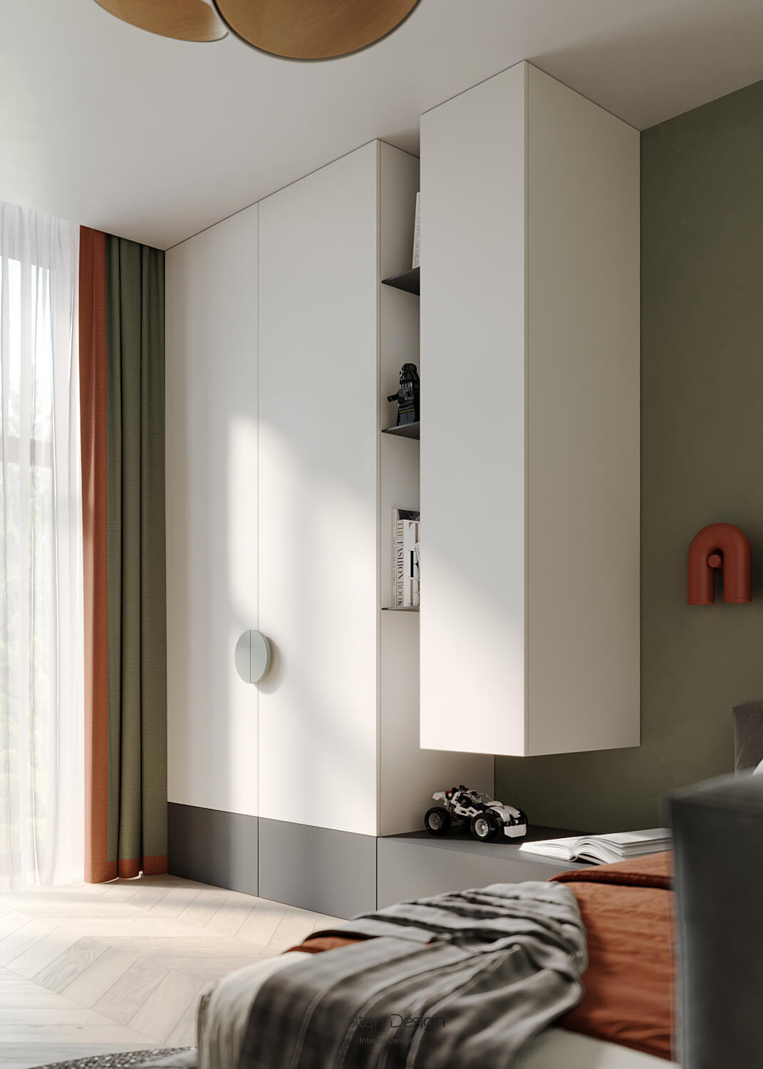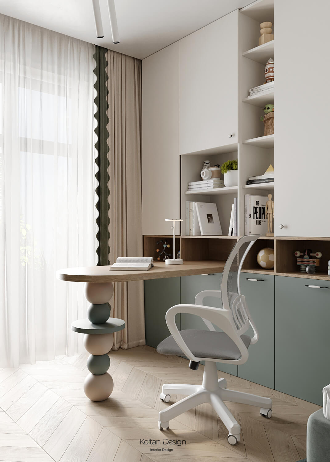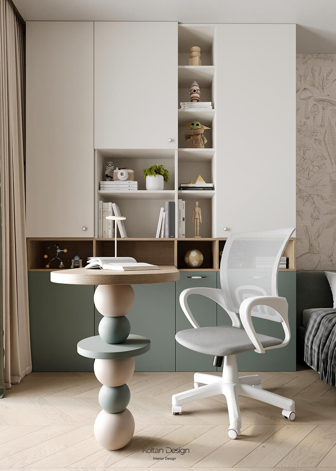 В мастер-спальне для хозяйки организовано рабочее место и выход в гардеробную, разделенную на мужскую и женскую части, а также в душевую, обеспечивая приватность и удобство. Вторая ванная комната полностью выделен для детей и гостей. Для детей предусмотрены две комнаты с уникальным дизайном: одна для девочки, другая для мальчика школьного возраста.