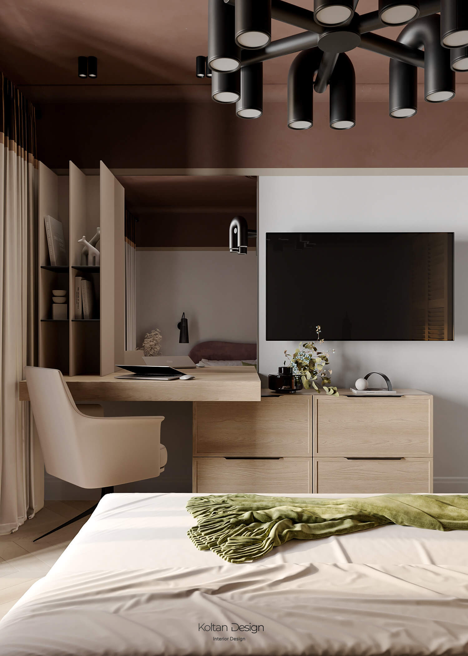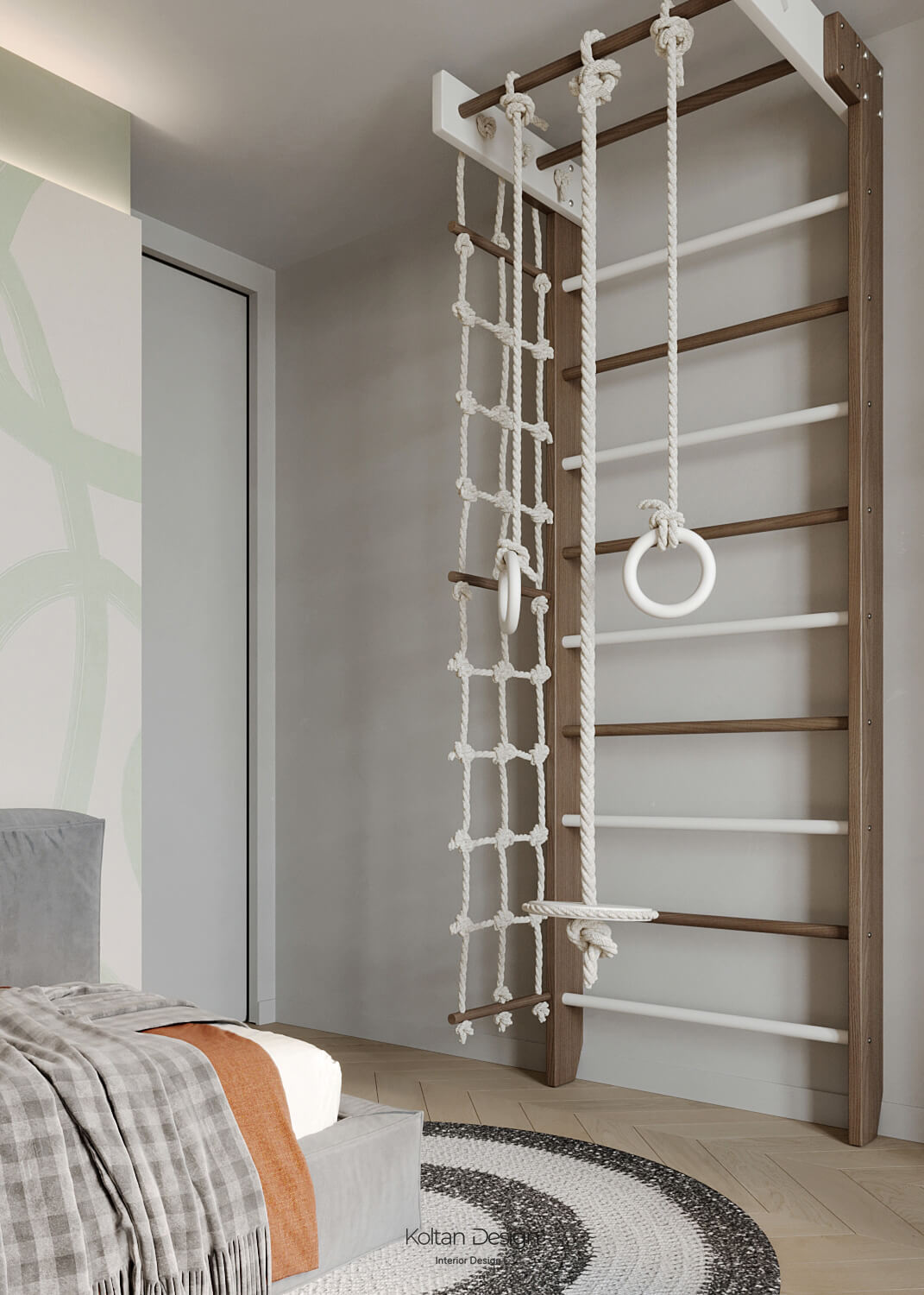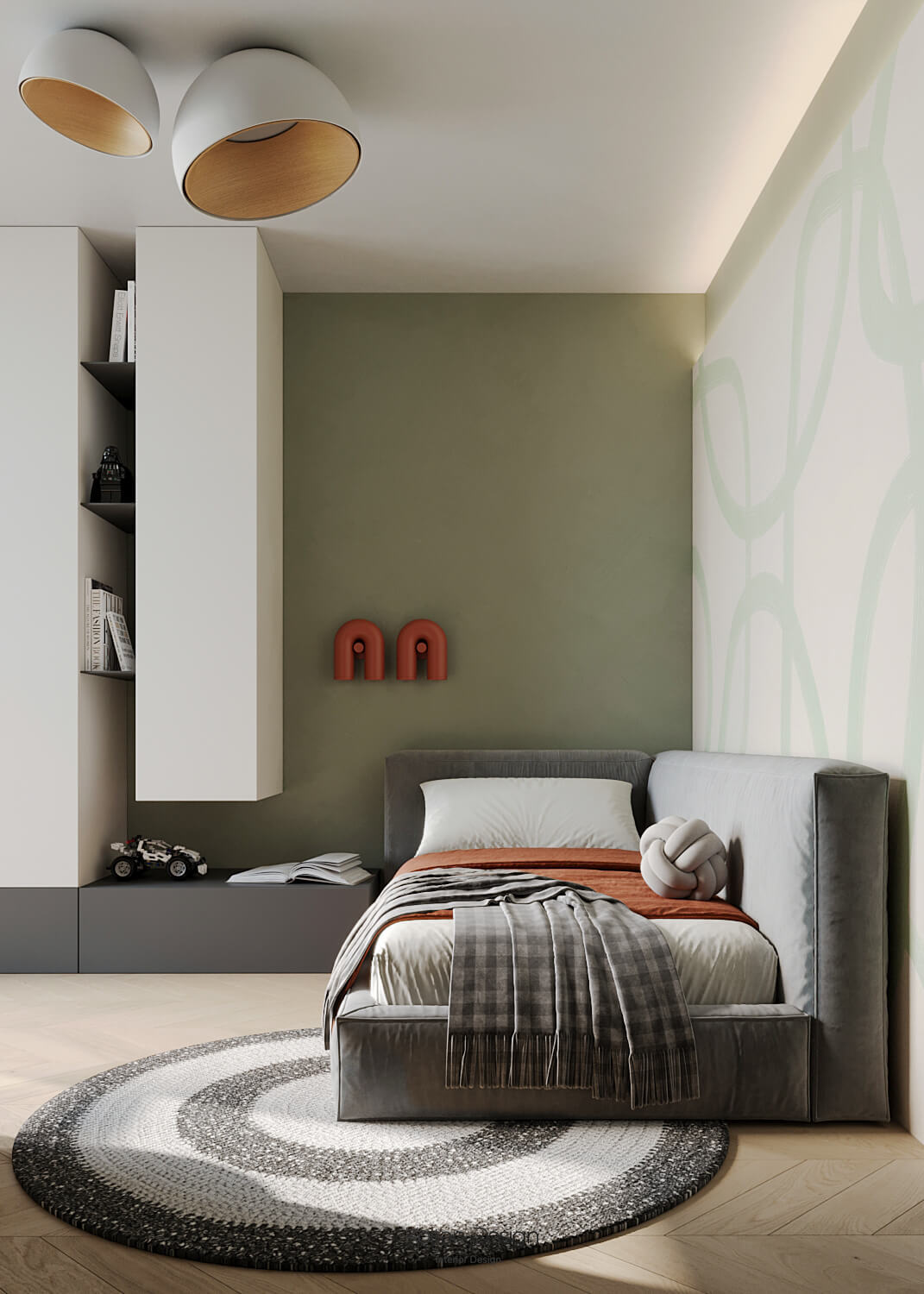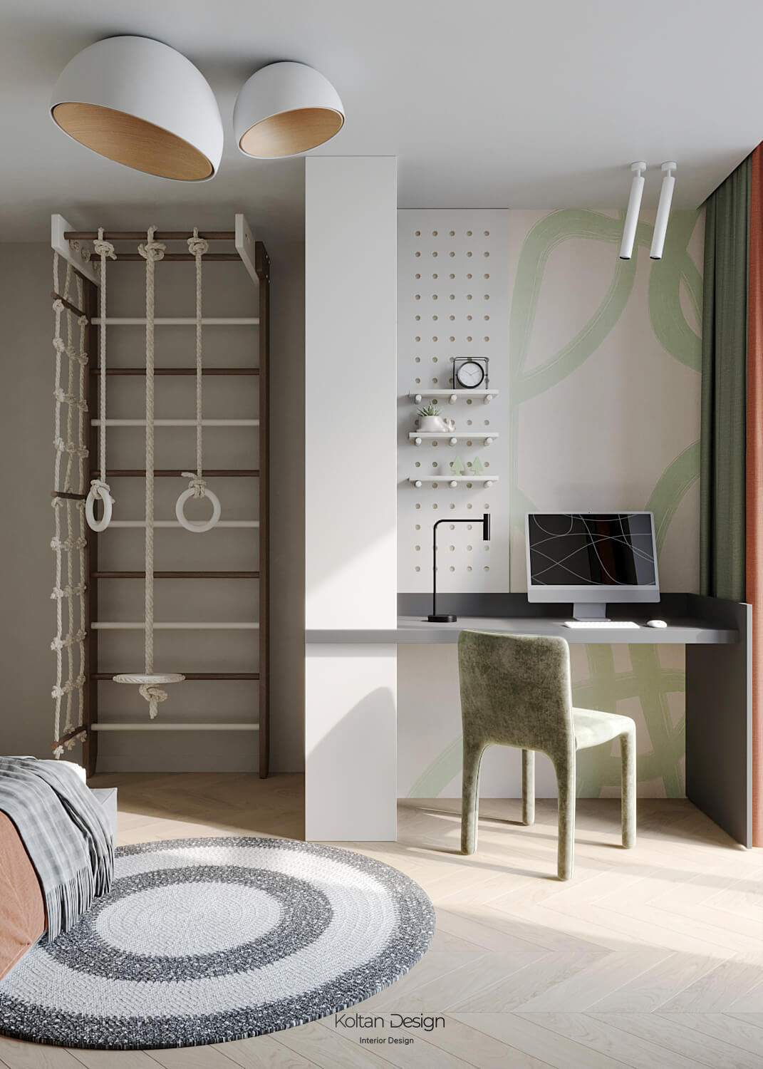 В мастер-спальне для хозяйки организовано рабочее место и выход в гардеробную, разделенную на мужскую и женскую части, а также в душевую, обеспечивая приватность и удобство. Вторая ванная комната полностью выделен для детей и гостей. Для детей предусмотрены две комнаты с уникальным дизайном: одна для девочки, другая для мальчика школьного возраста.