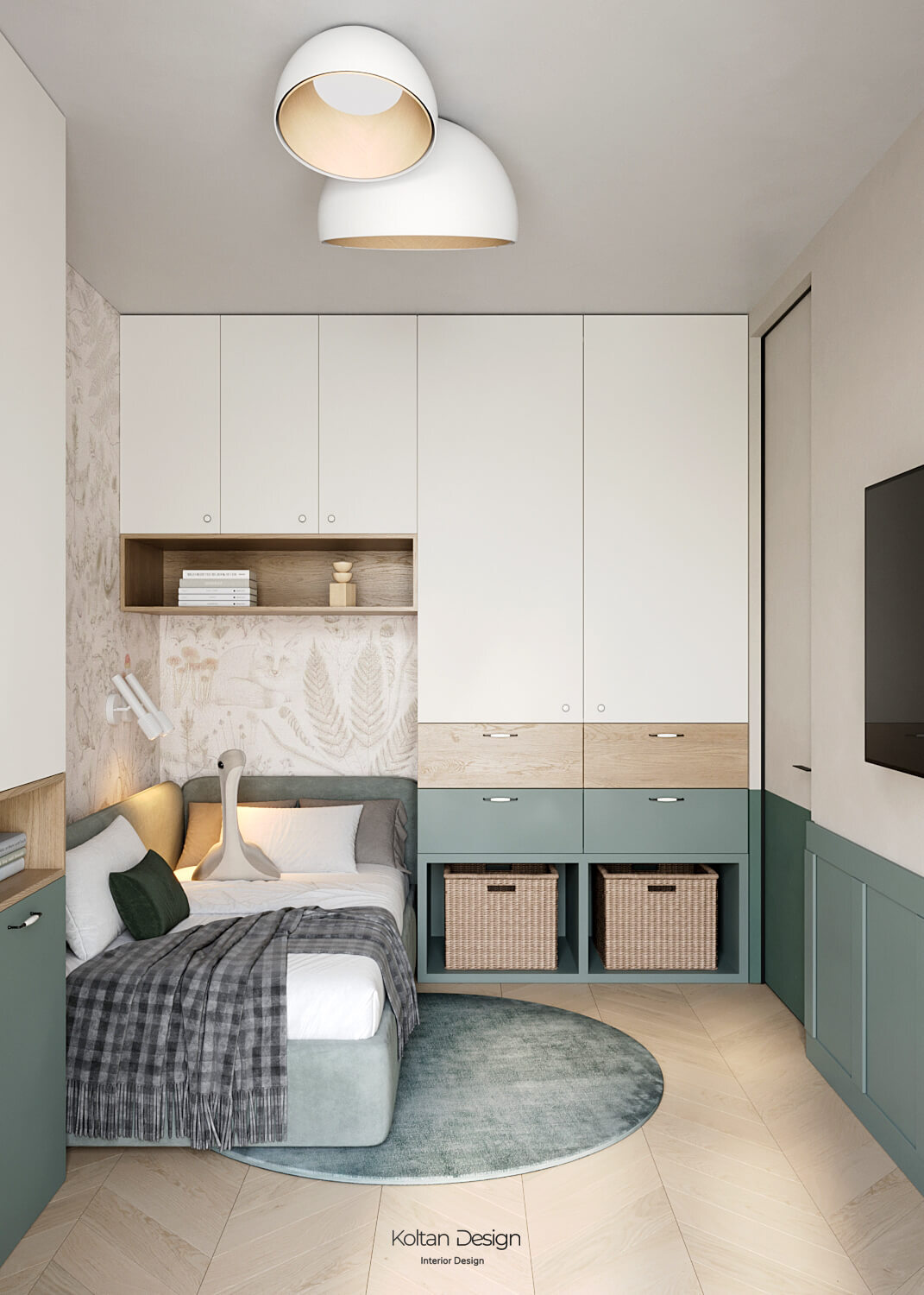 Задача: разместить две детские комнаты, выделить зону мастер спальни с гардеробной и своей ванной комнатой, а также общую зону кухни-гостиной. Стилистика современная с элементами классики, яркие цветовые акценты и контрастные сочетания.