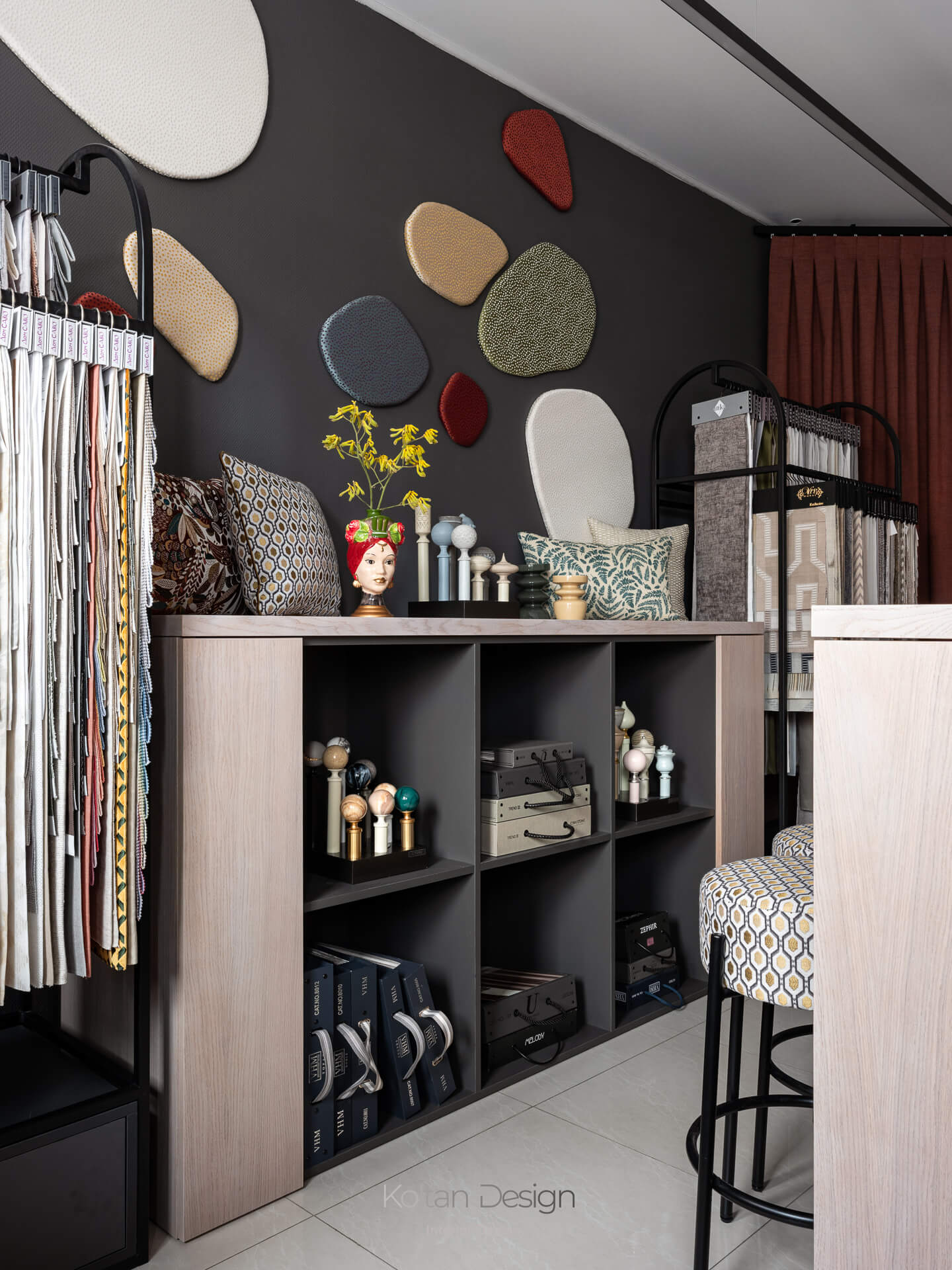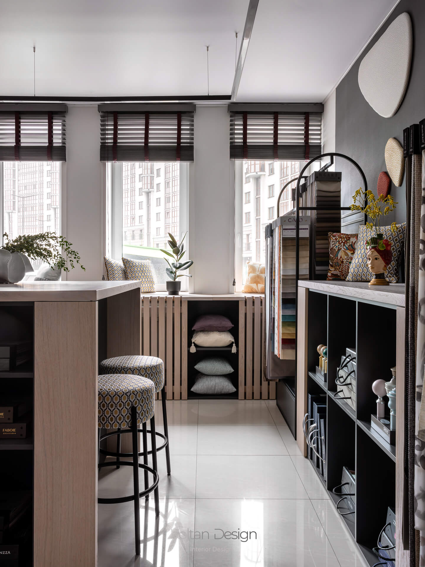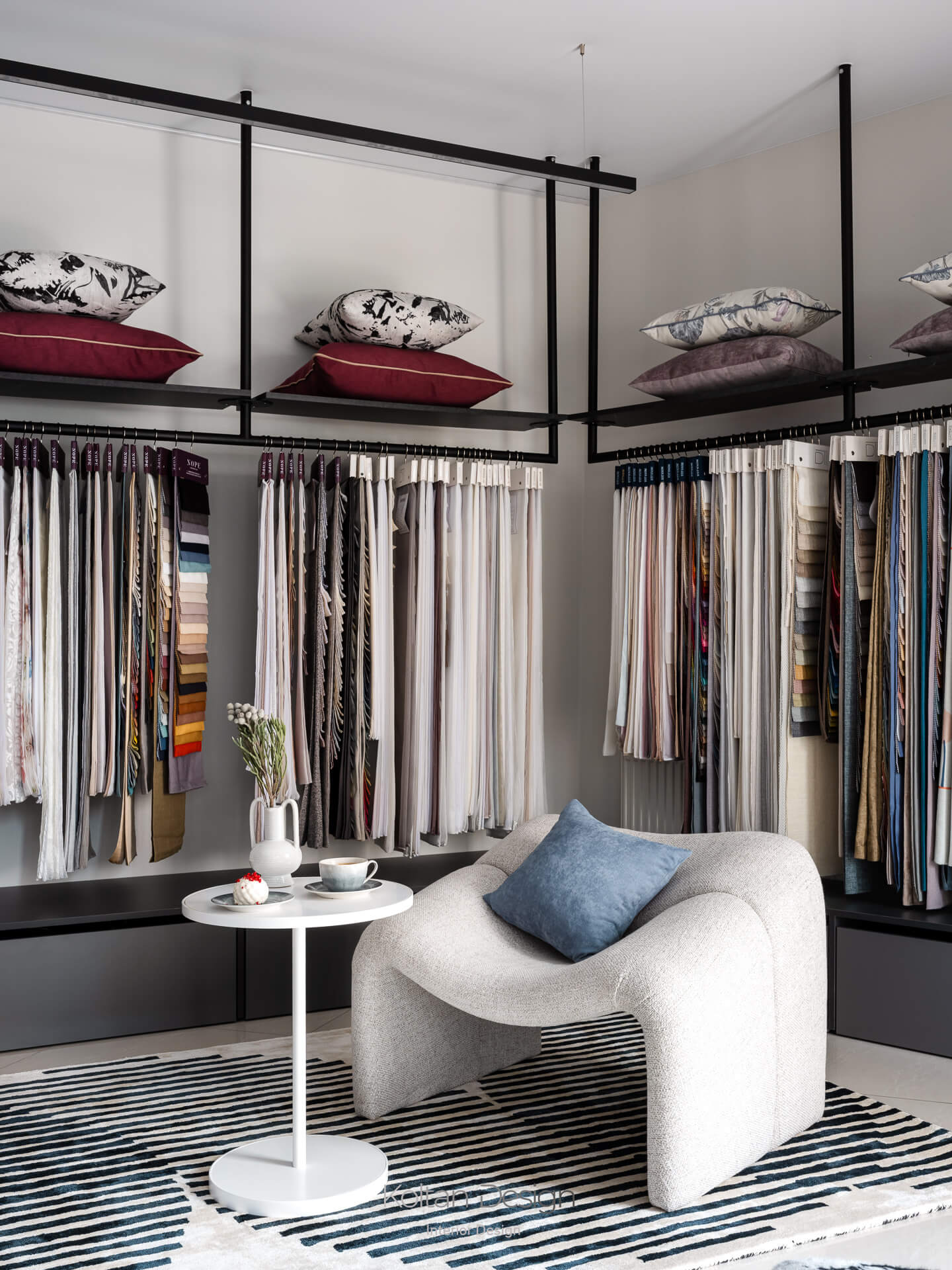 Задача: сформировать удобное пространство салона интерьерного текстиля для работы с дизайнерами и клиентами. Предусмотреть комфортную среду для подбора тканей и достаточное хранение образцов, сохранив лёгкость и визуальную чистоту интерьера. Пространство должно быть запоминающимся, при этом главным акцентом остаётся текстиль.