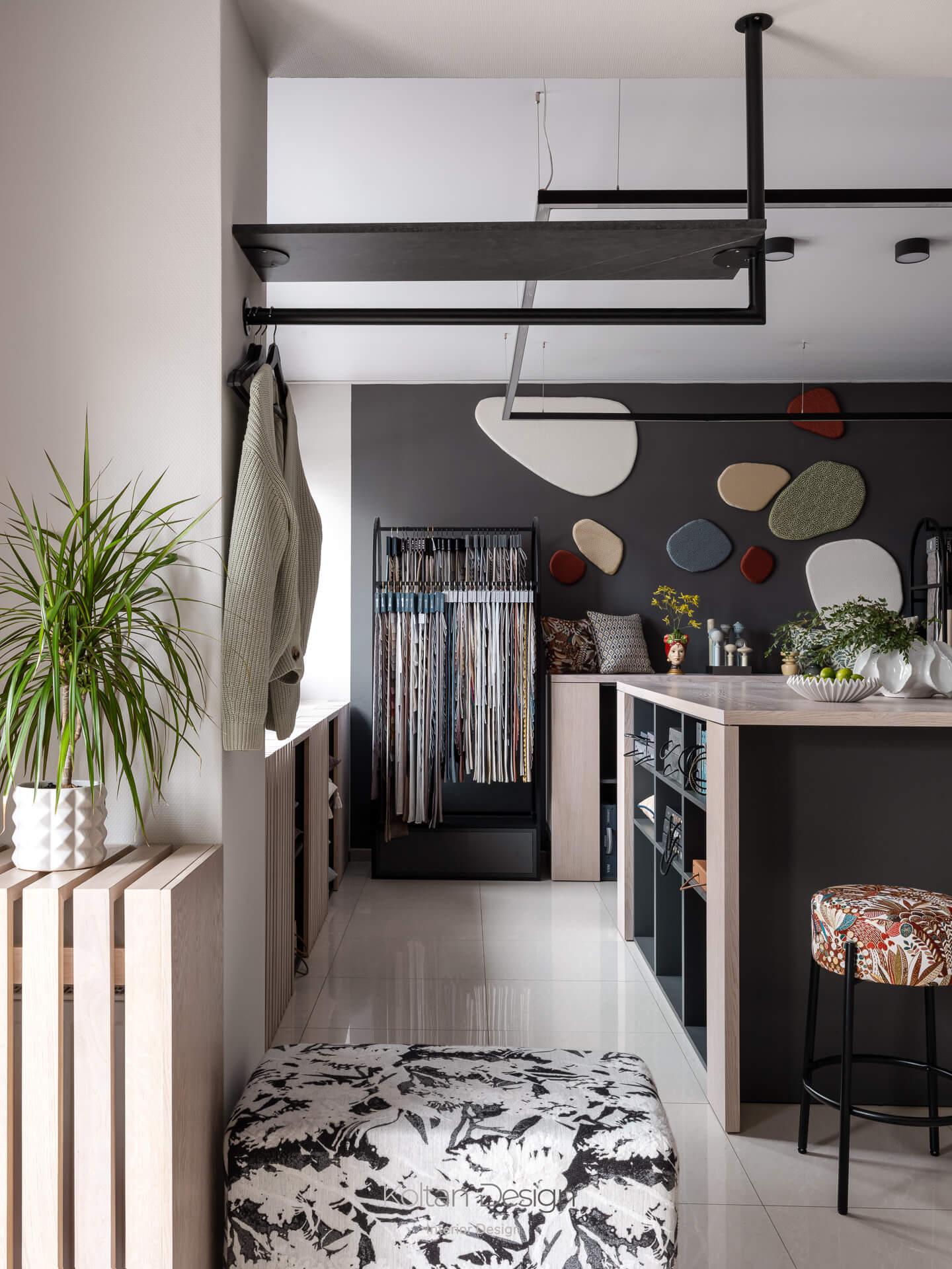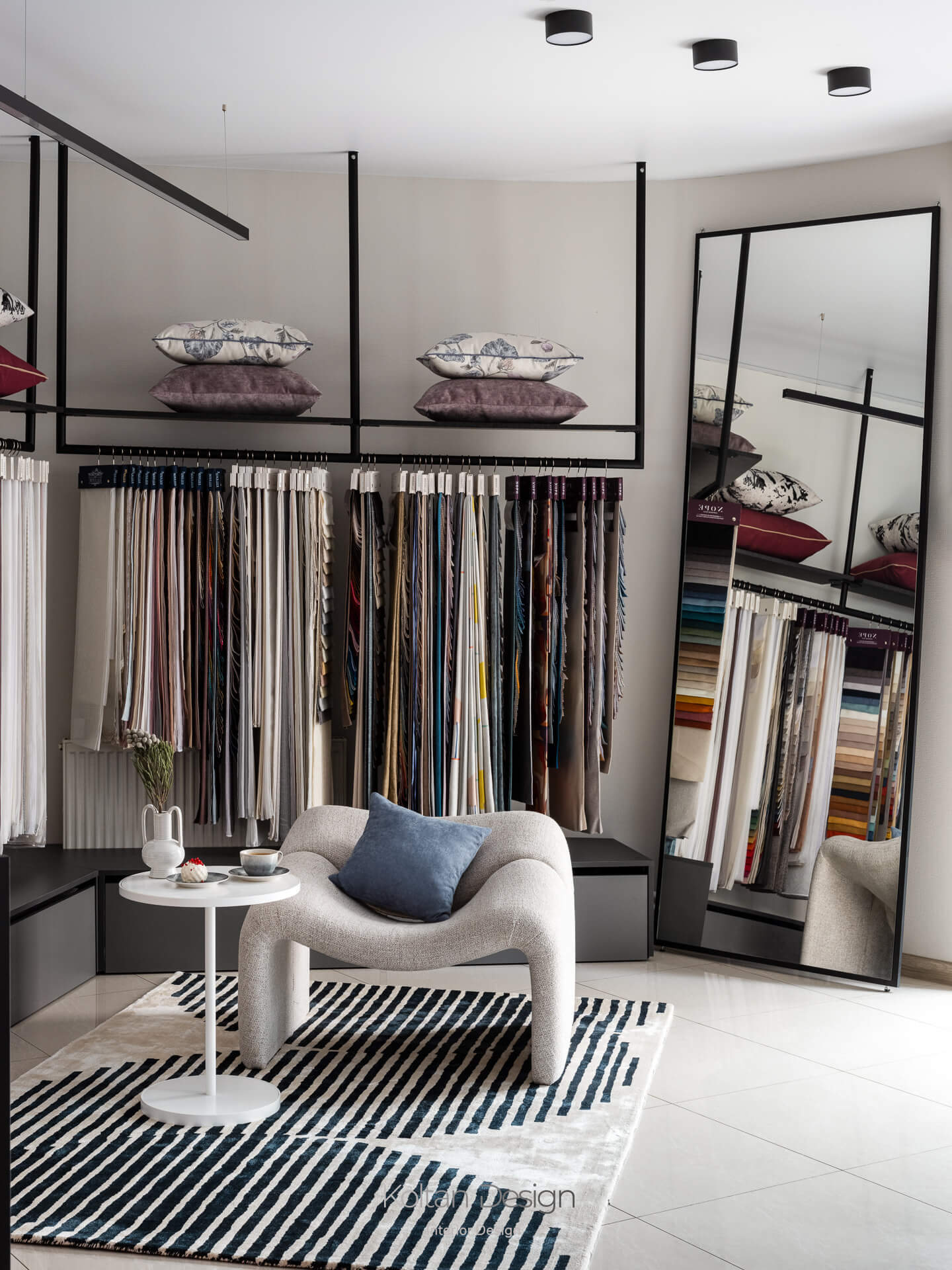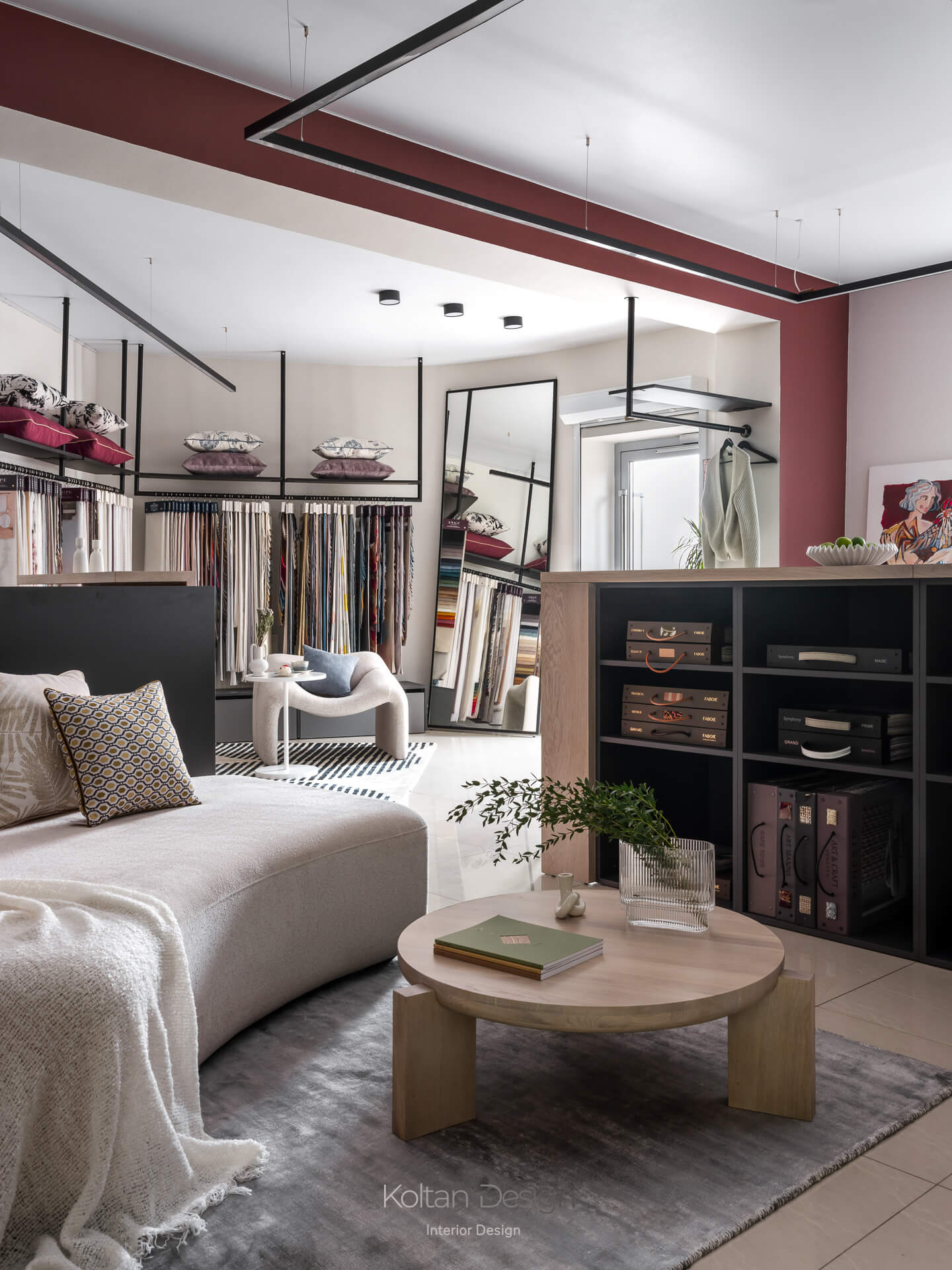 Планировка, продиктованная несущей балкой, разделила салон на две зоны. Первая выполнена в светлой нейтральной гамме и предназначена для точной работы с цветом и фактурой тканей. Вторая зона более контрастная и атмосферная, где текстиль становится частью интерьерной композиции.