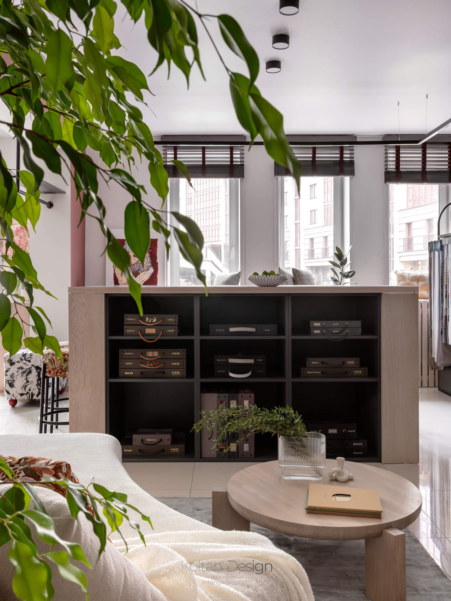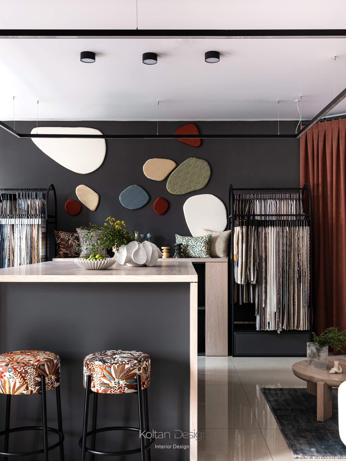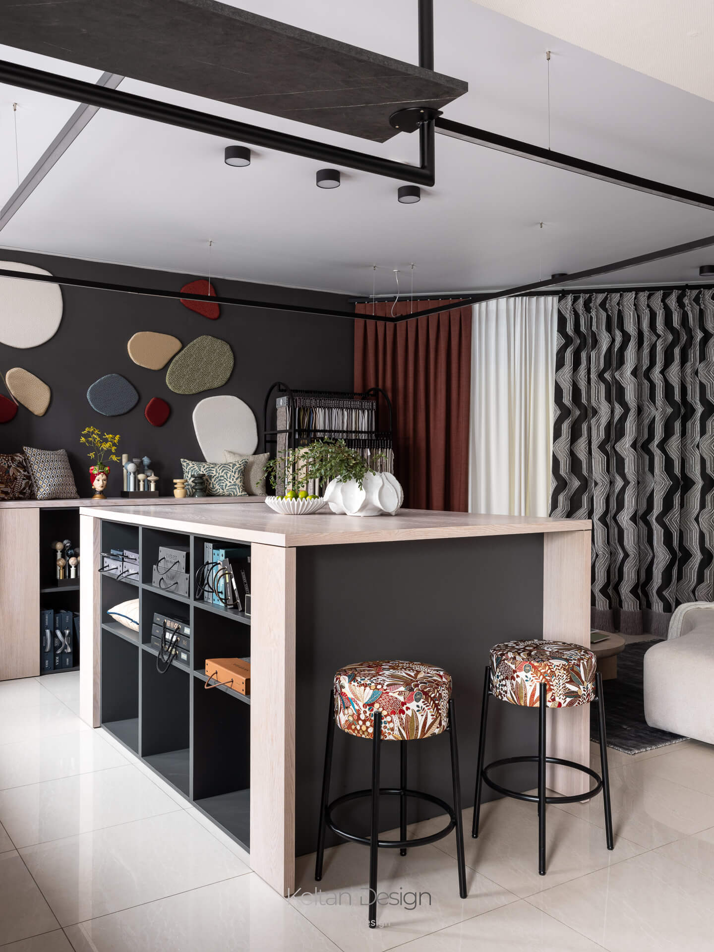 Планировка, продиктованная несущей балкой, разделила салон на две зоны. Первая выполнена в светлой нейтральной гамме и предназначена для точной работы с цветом и фактурой тканей. Вторая зона более контрастная и атмосферная, где текстиль становится частью интерьерной композиции.