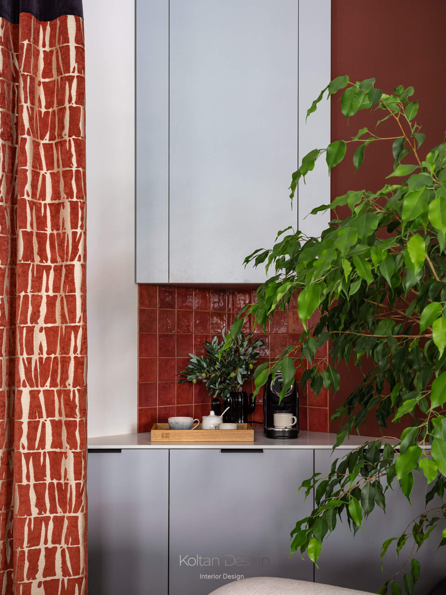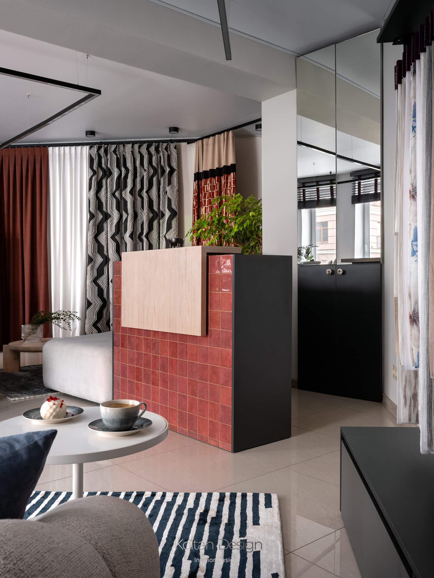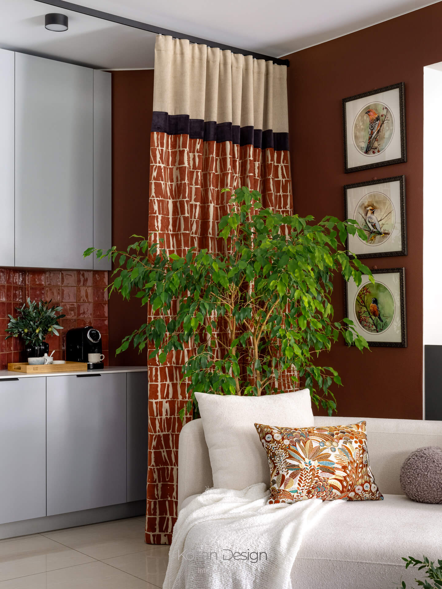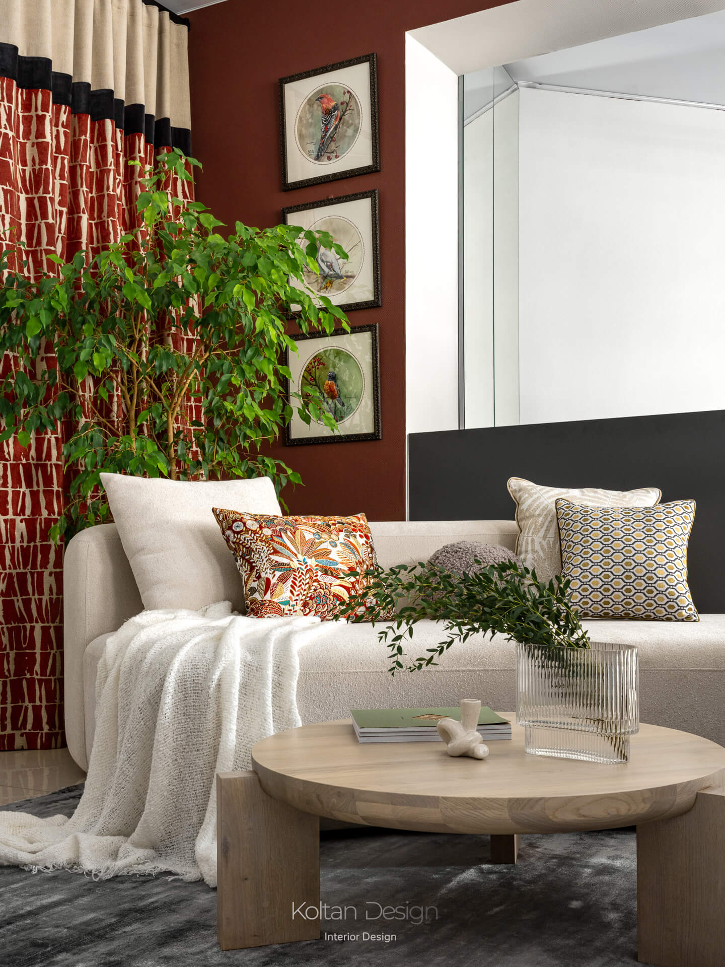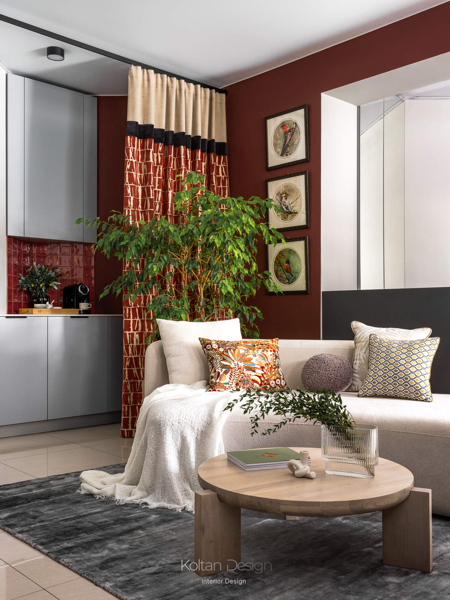 Выразительность пространства формируется через фактуры и цвет текстиля. Палитра строится на сочетании светлых стен с бордовыми, терракотовыми и графитовыми оттенками, а натуральные материалы в отделке и мебели добавляют интерьеру тепла и тактильности.